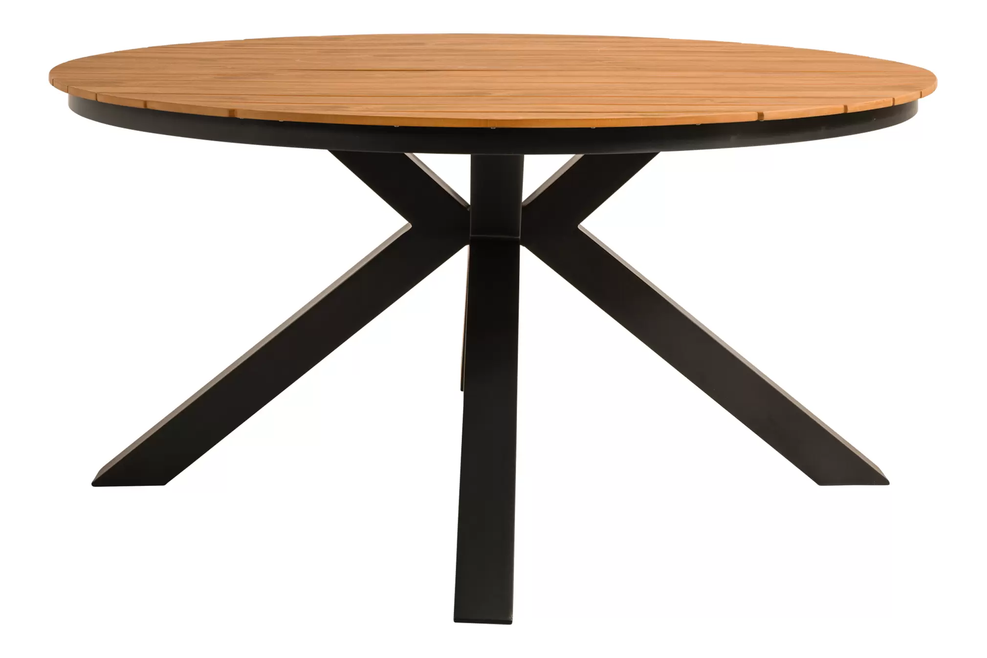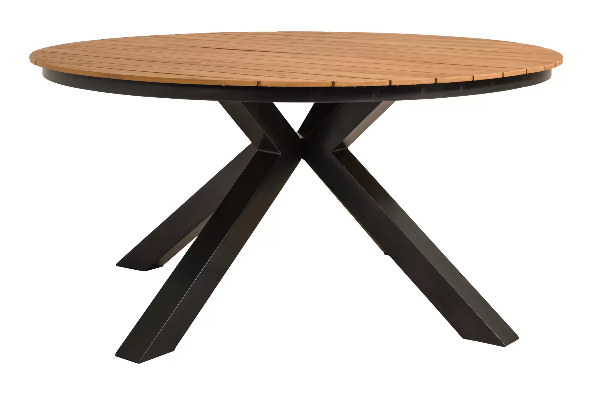 Aluminiowy stół obiadowy okrągły ciemnoszary. Blat kompozytowy o wyglądzie drewna teakowego.