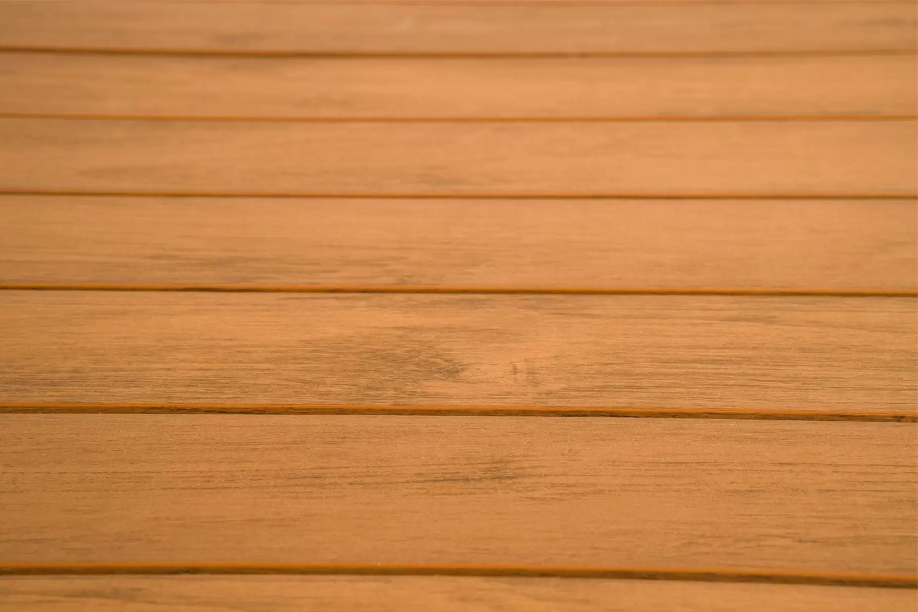 Blat stołu z kompozytu drewnianego o wyglądzie drewna teakowego.