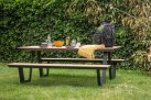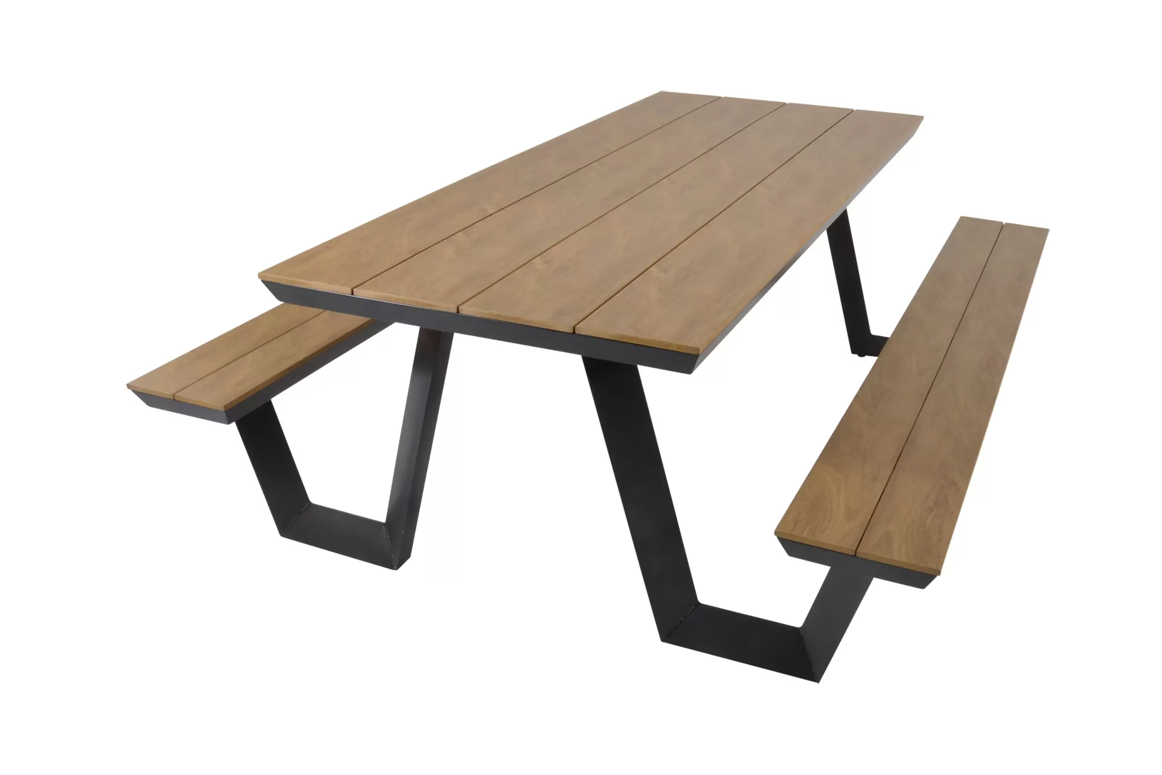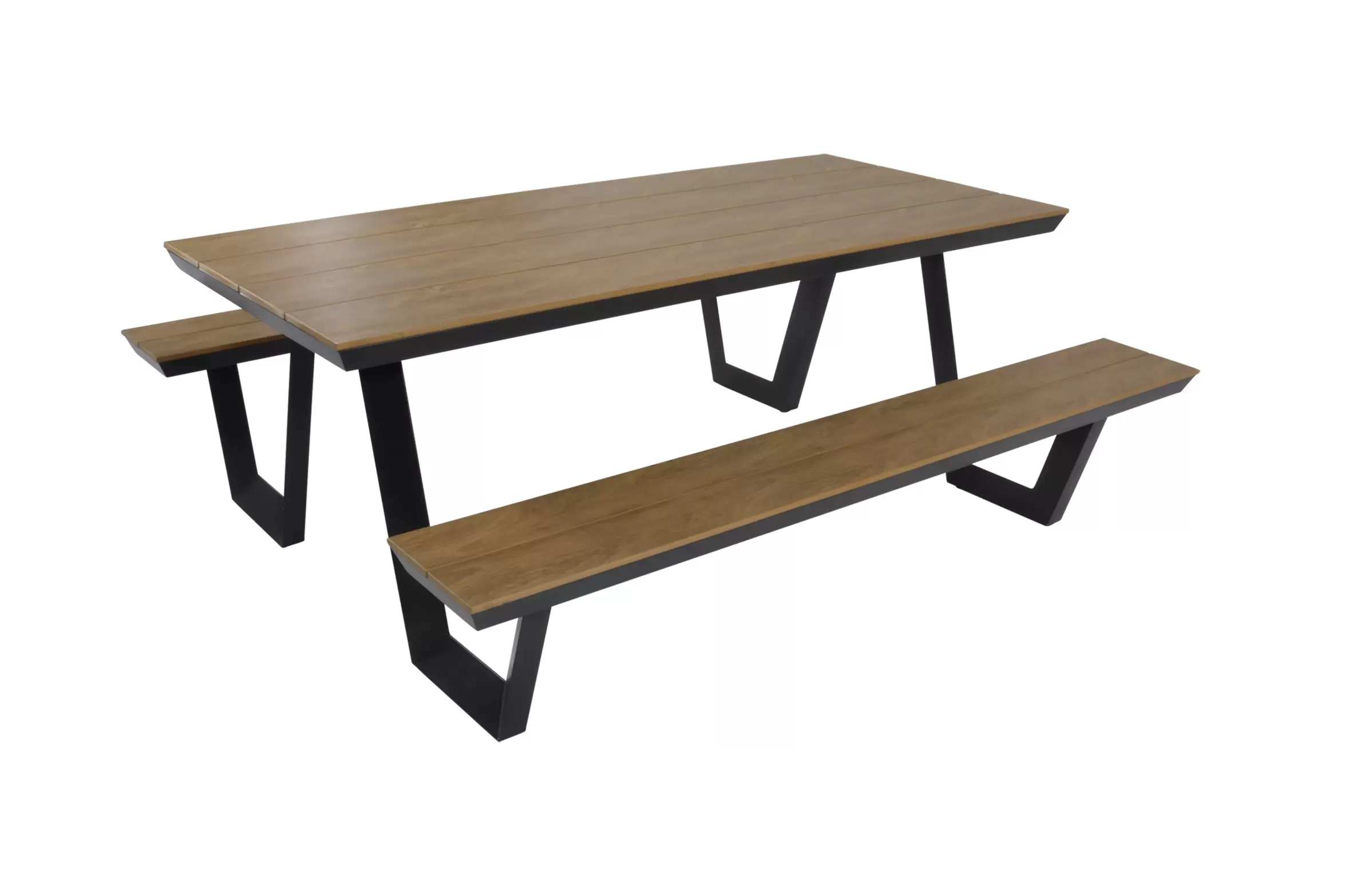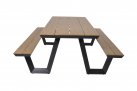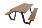 Aluminiowy zestaw obiadowy piknikowy ze zintegrowanymi ławkami. Blaty o wyglądzie drewna teakowego.