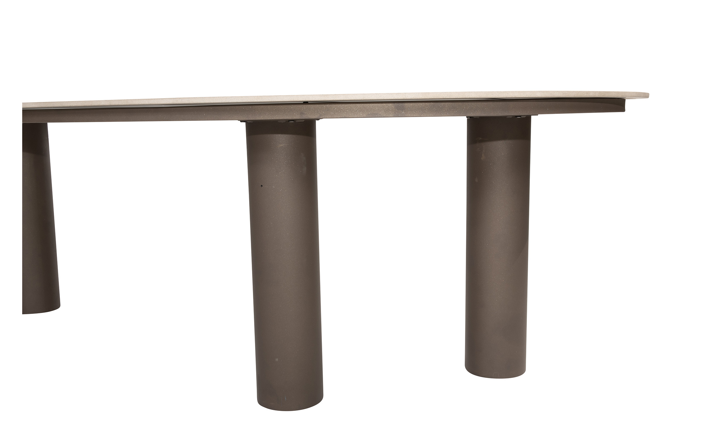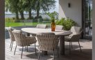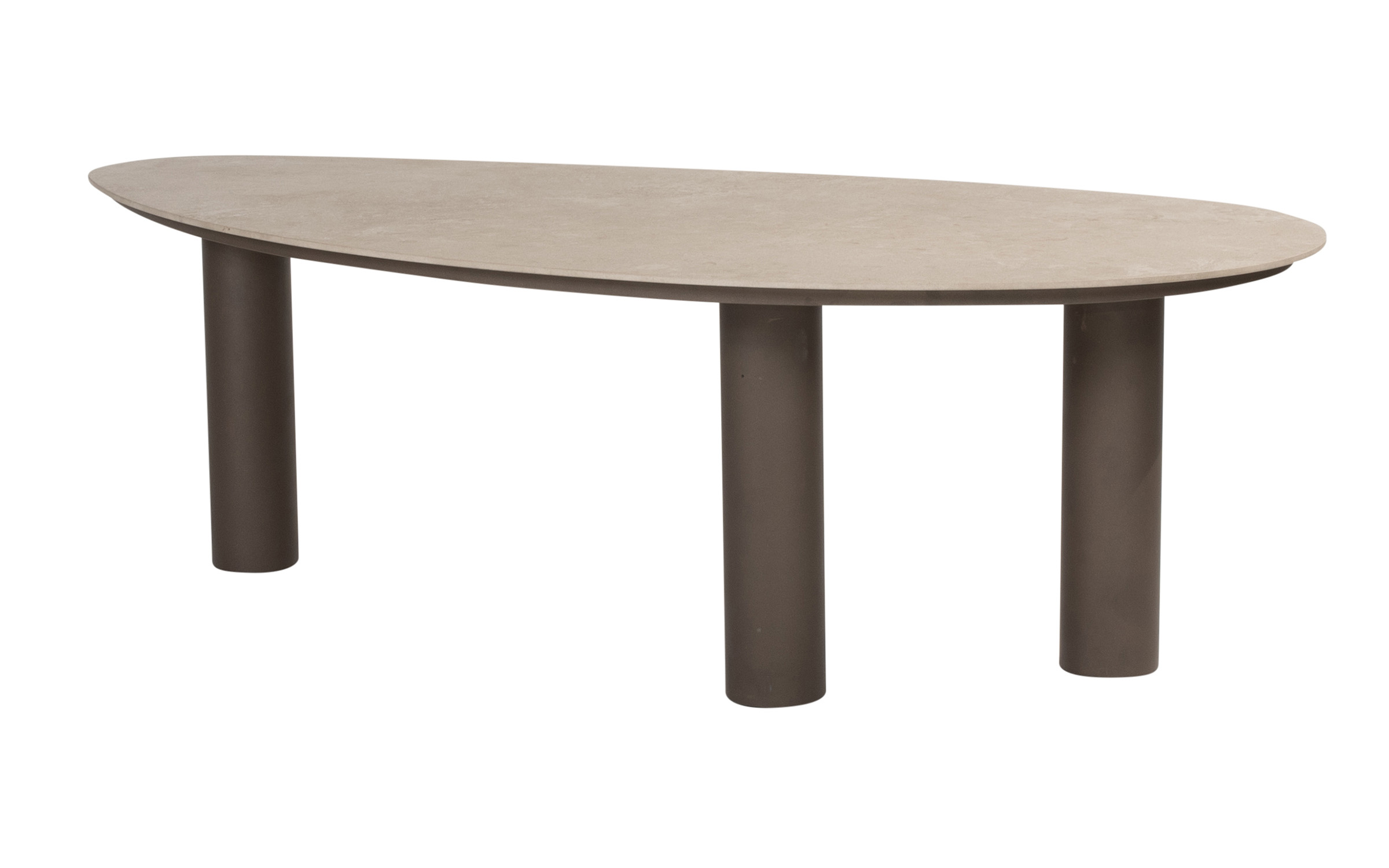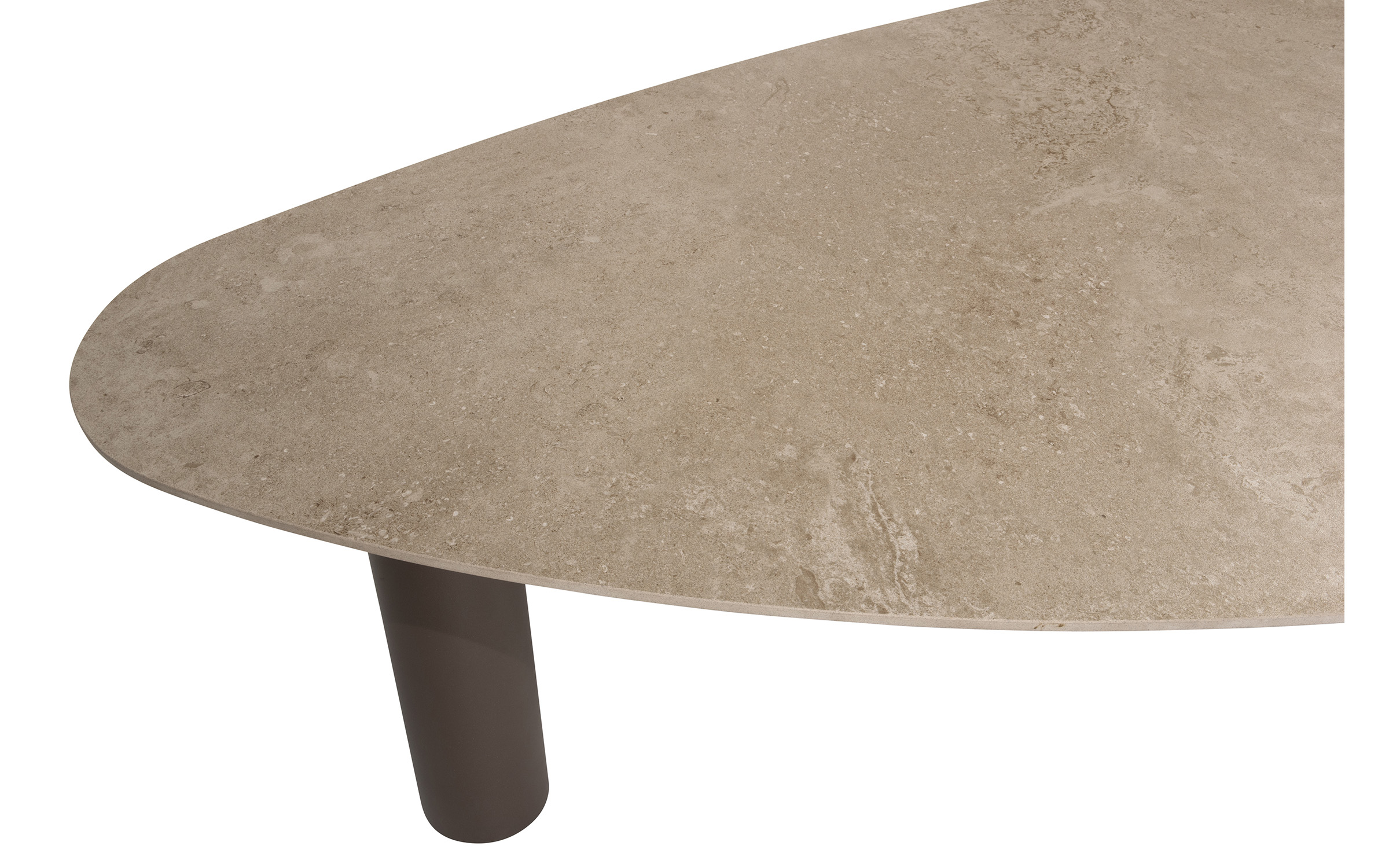 Stół do jadalni ogrodowej Arizona od 4 Seasons Outdoor to trwały stół ogrodowy, idealny dla entuzjastów spędzania czasu na świeżym powietrzu. Solidny stół ma trzy solidne nogi ze stali nierdzewnej pokryte farbą proszkową w kolorze ciemnobrązowym oraz ceramiczny blat w nieregularnym kształcie otoczaka.