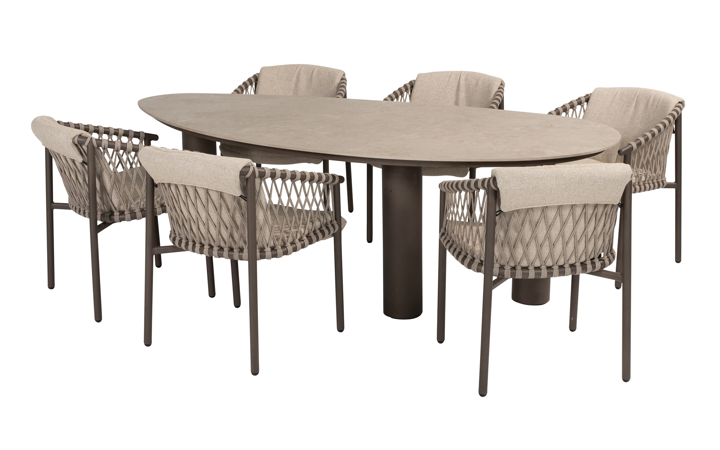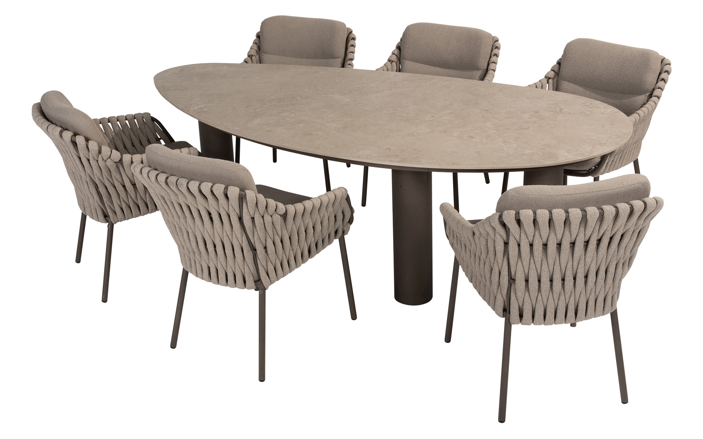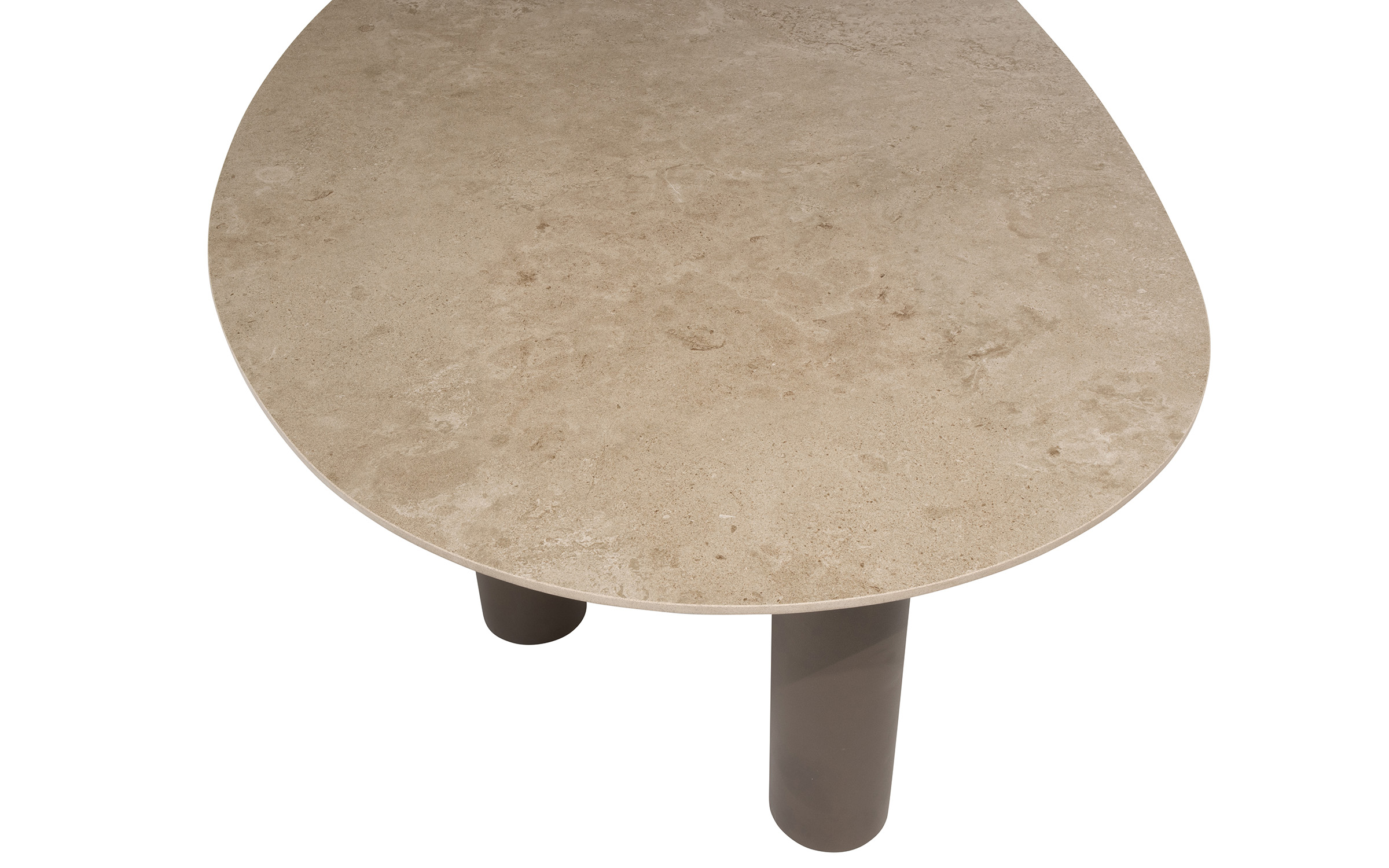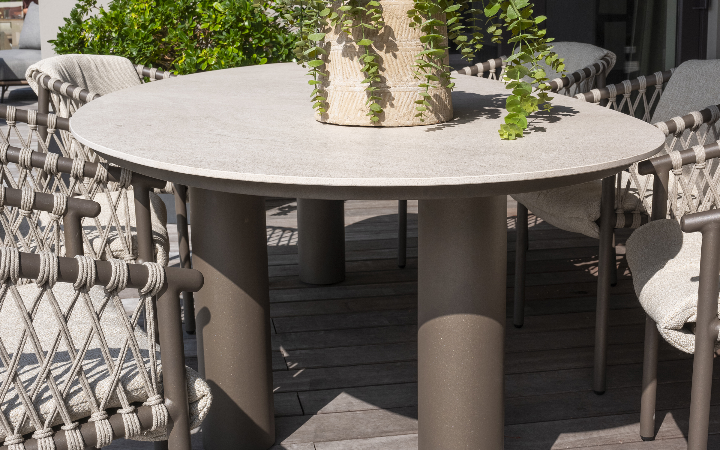 Stół do jadalni ogrodowej Arizona od 4 Seasons Outdoor to trwały stół ogrodowy, idealny dla entuzjastów spędzania czasu na świeżym powietrzu. Solidny stół ma trzy solidne nogi ze stali nierdzewnej pokryte farbą proszkową w kolorze ciemnobrązowym oraz ceramiczny blat w nieregularnym kształcie otoczaka.
