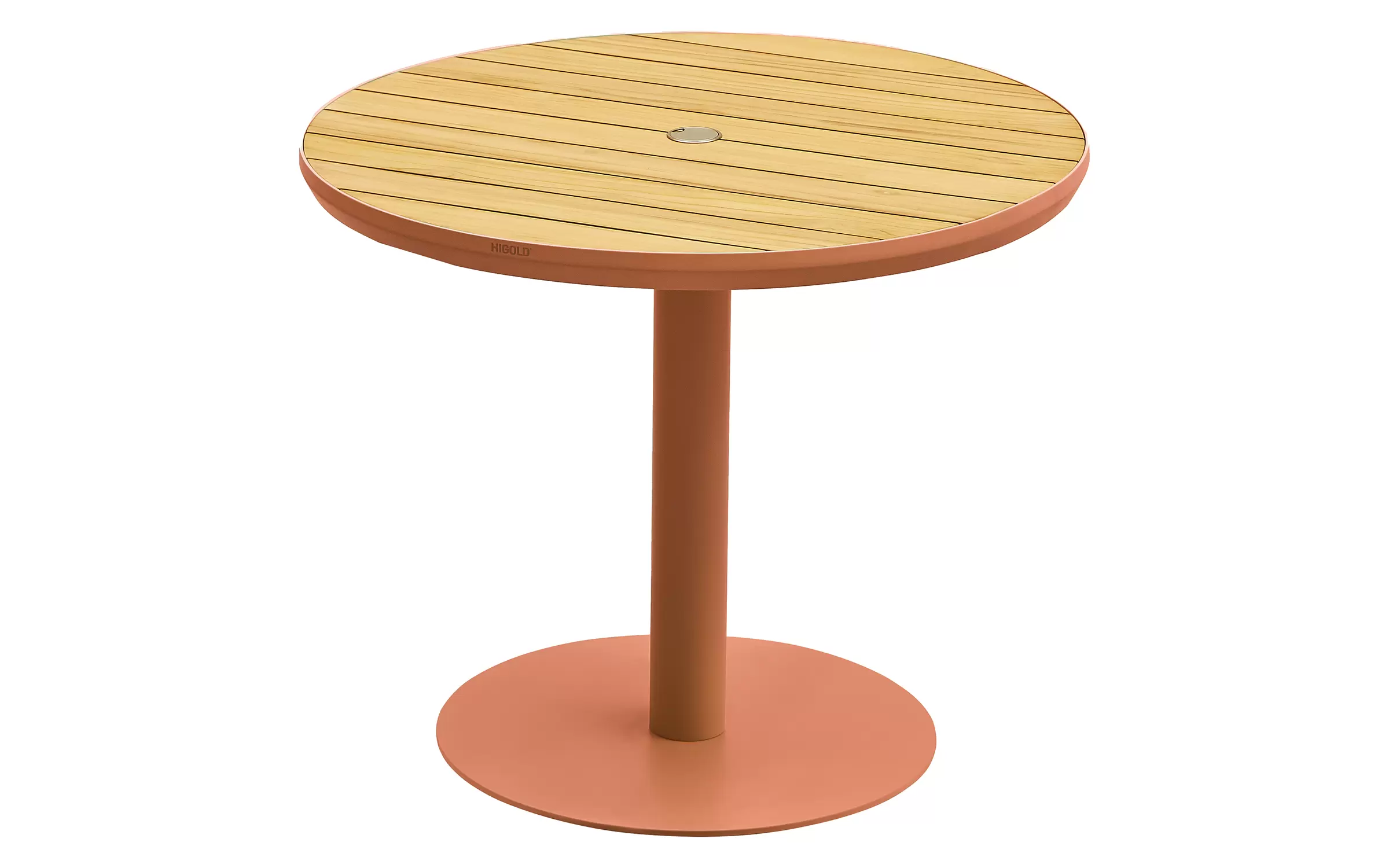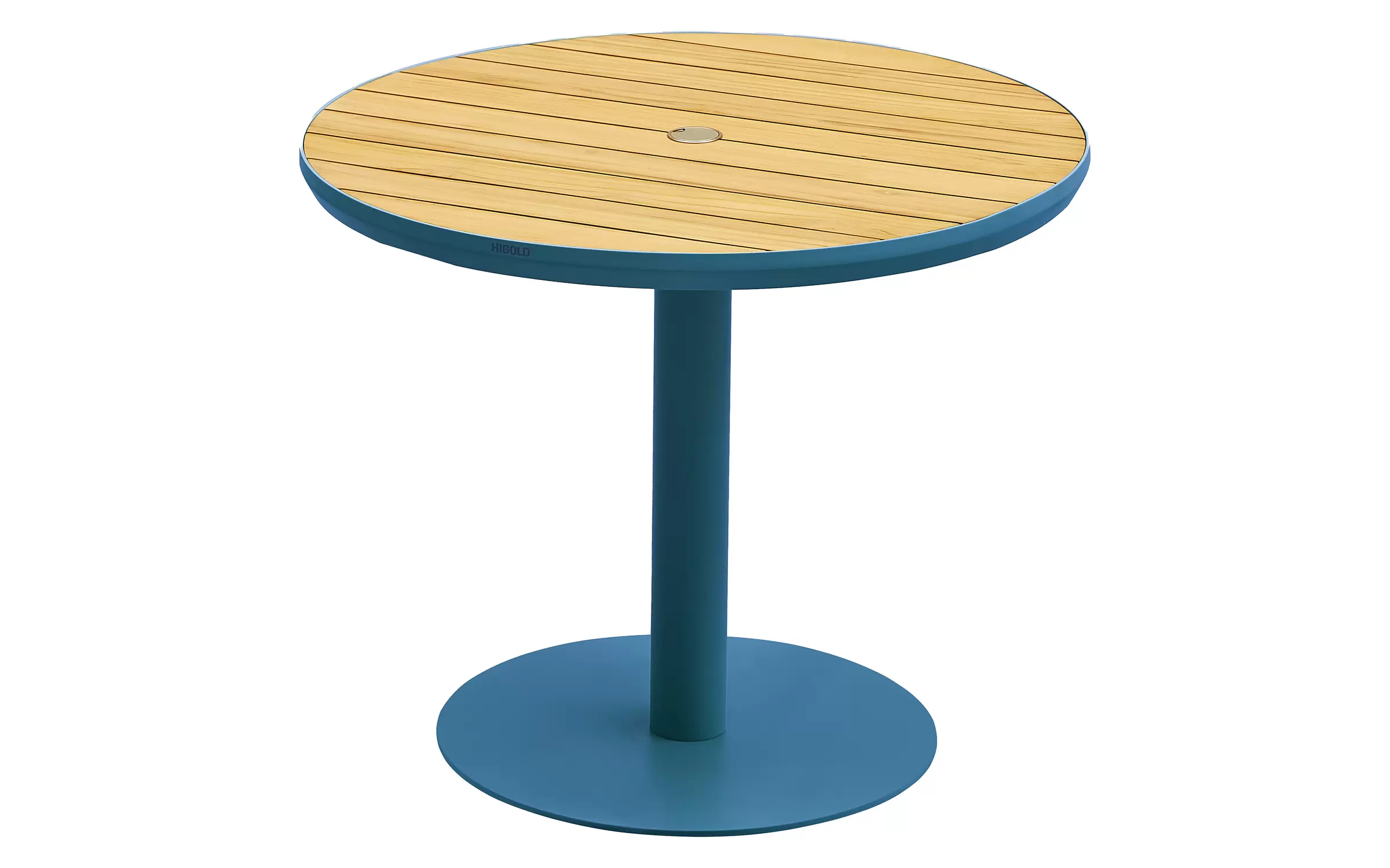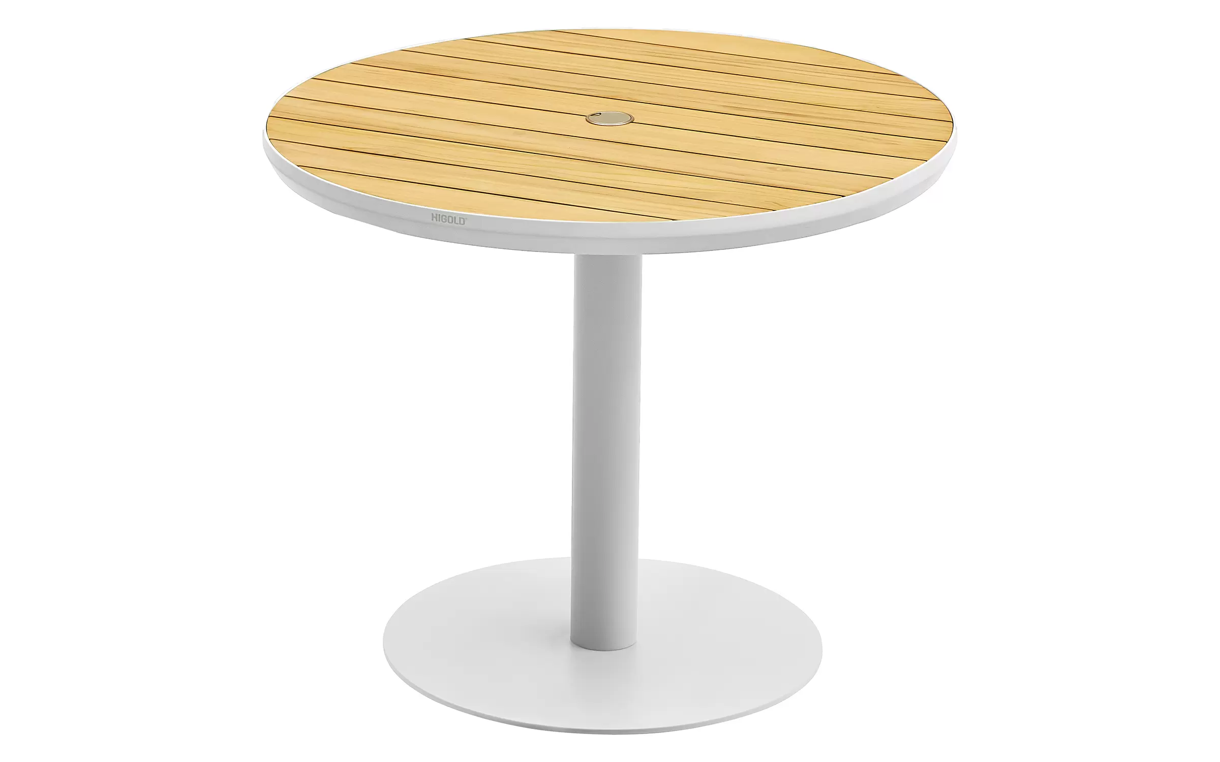 Okrągły stół ogrodowy 90 cm 1 noga biała aluminiowa blat teak BALI Higold