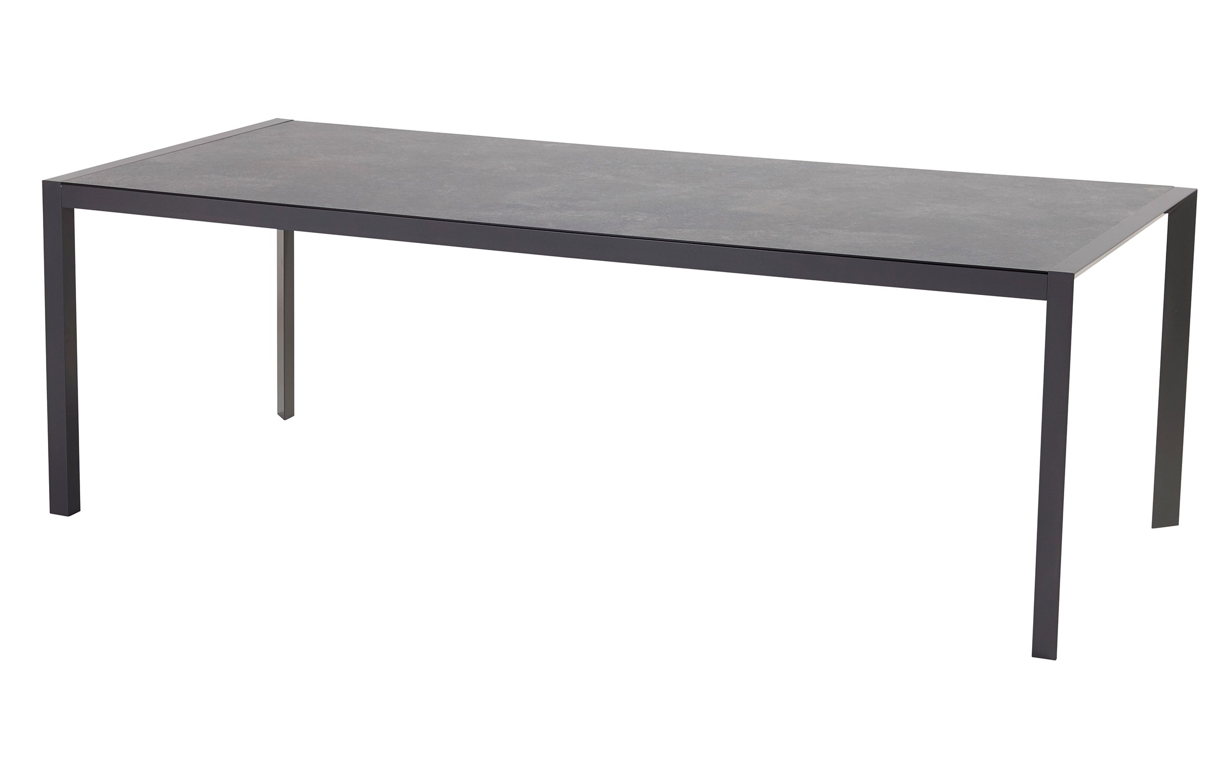 Rama z aluminium malowanego proszkowo (kolor antracyt). Blat z płyty HPL — technologiczny laminat wysokociśnieniowy imitujący kamień, odporny na warunki zewnętrzne i zarysowania.