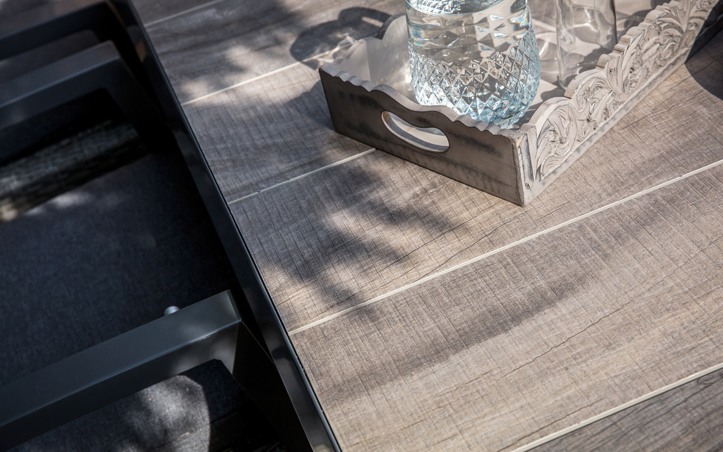 Stół CASTILLA 243×103 to stylowy mebel ogrodowy, który wyróżnia się nowoczesną formą i solidnym wykonaniem. Konstrukcja z aluminium w odcieniu matowego antracytu nadaje mu elegancki charakter, a powłoka proszkowa skutecznie zabezpiecza przed korozją i drobnymi uszkodzeniami. Blat ceramiczny o grubości 11,5 mm, wykonany z paneli o szerokości 19,8 cm w beżowym melanżowym kolorze, łączy trwałość z estetyką.