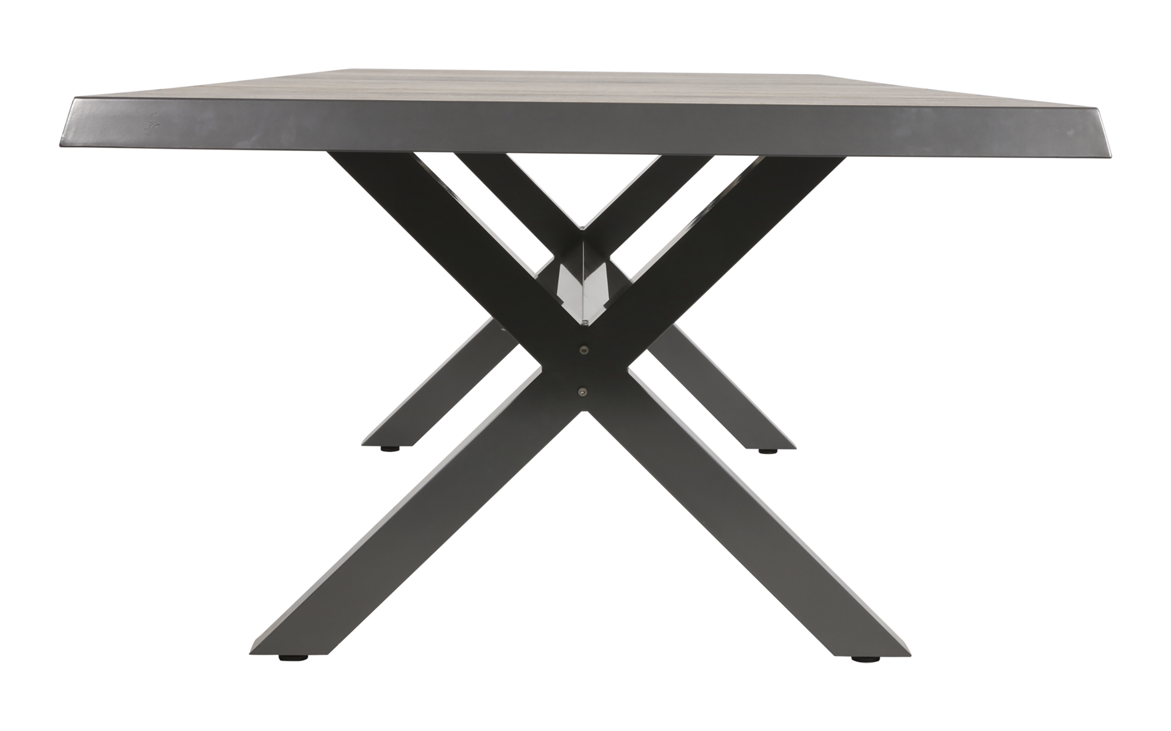 Prostokątna forma stołu, nogi o przekroju 7×7 cm oraz charakterystyczne krzyżowe podstawy z poprzecznym wspornikiem zapewniają stabilność i podkreślają nowoczesny wygląd.