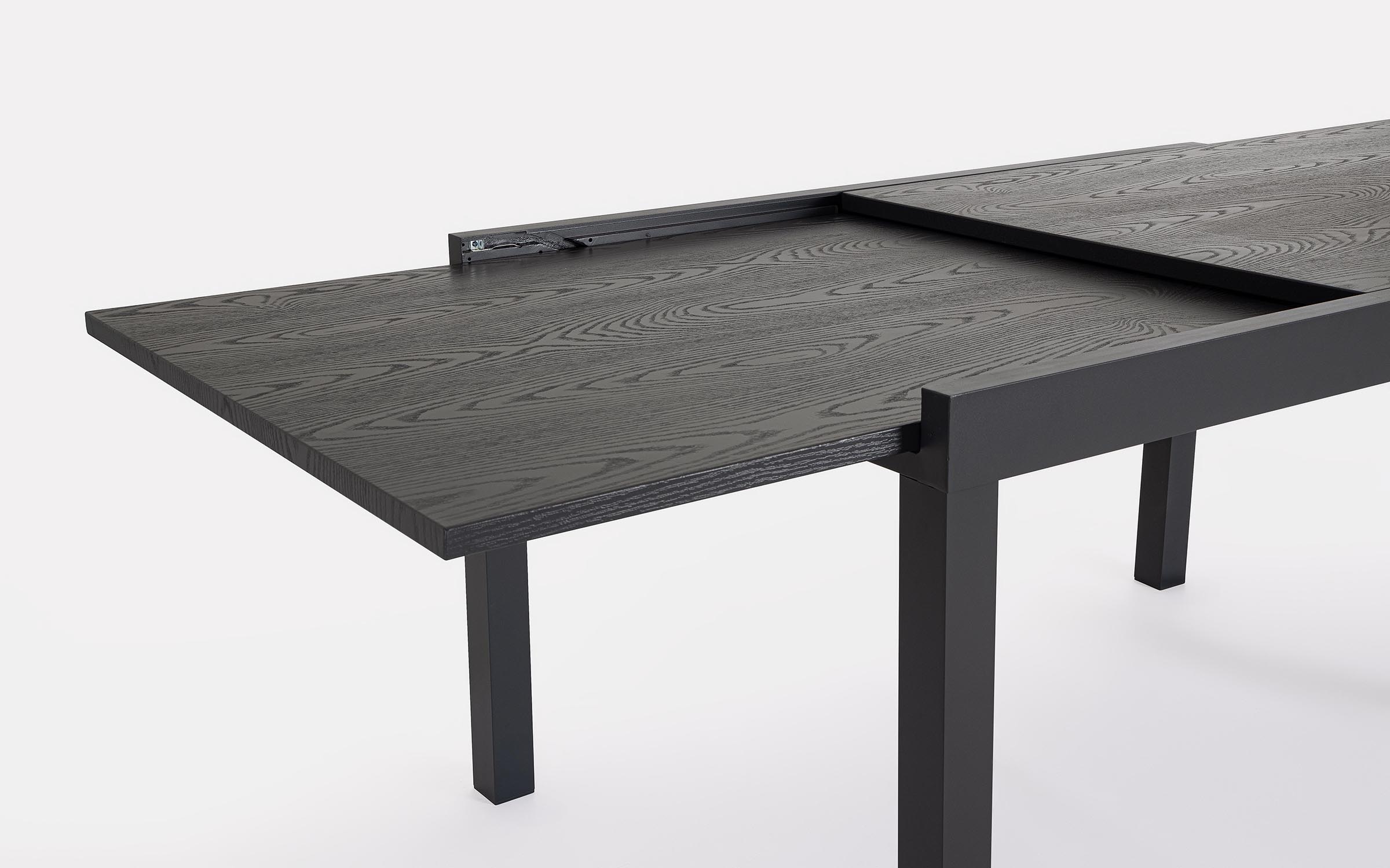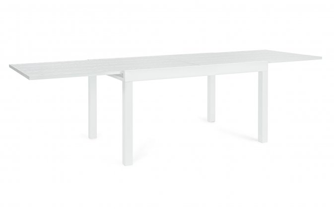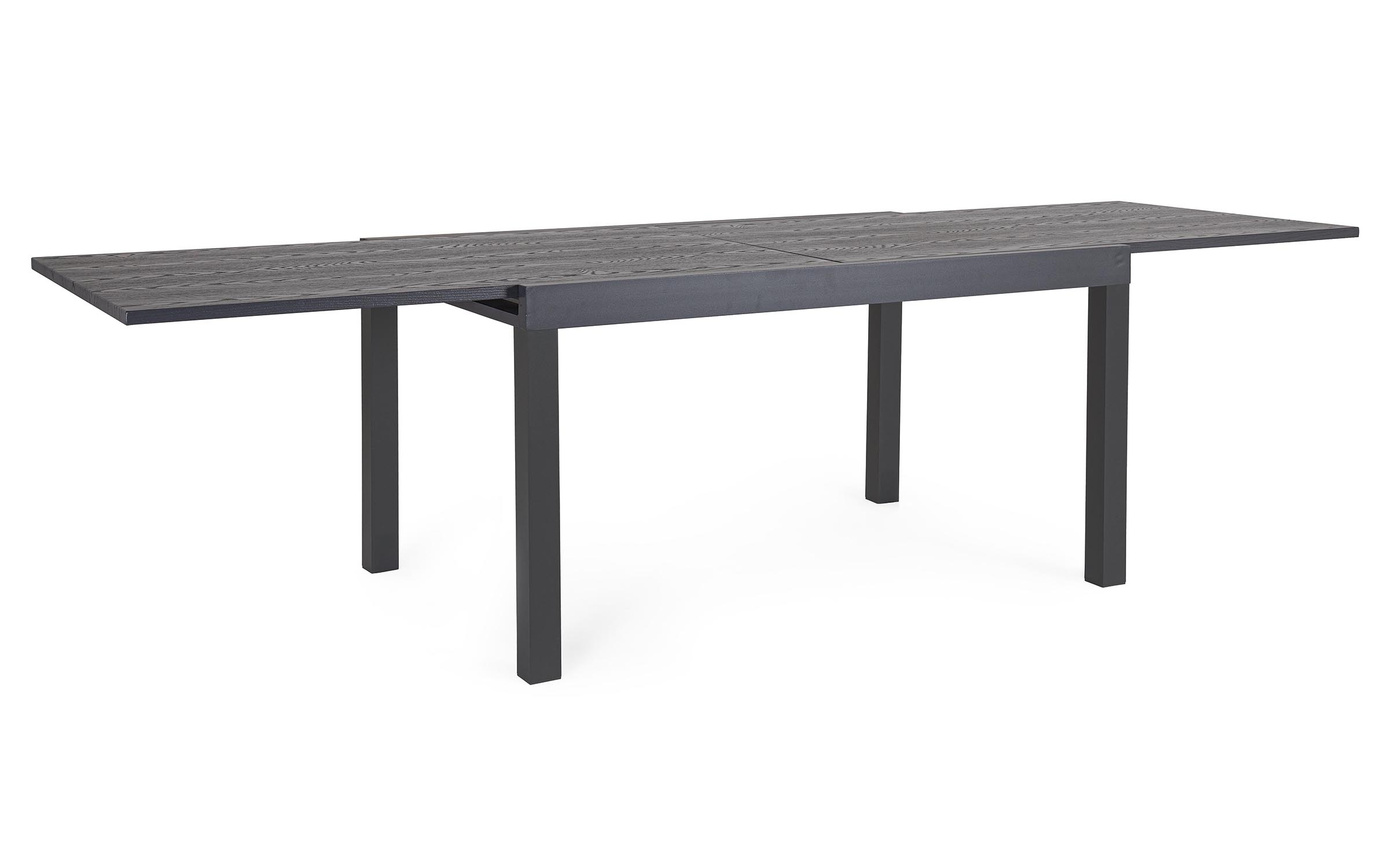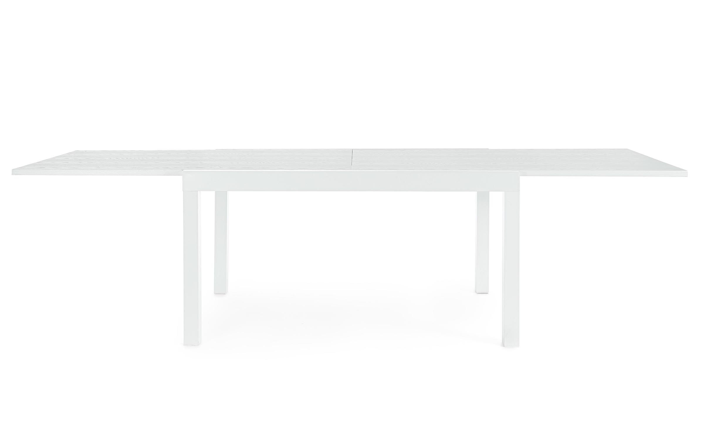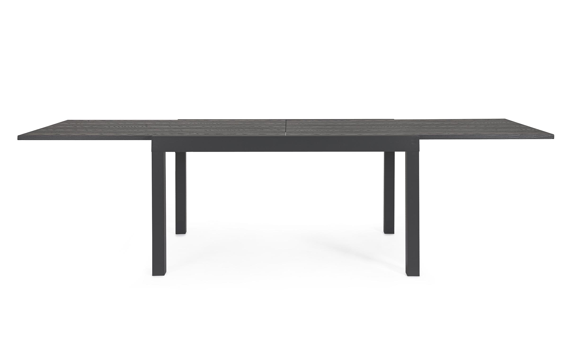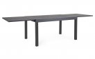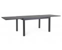 Konstrukcja aluminiowa stołu i mebli malowana proszkowo. System rozkładania: blat wydłużający wysuwany spod blatu głównego i podnoszony do właściwego poziomu.