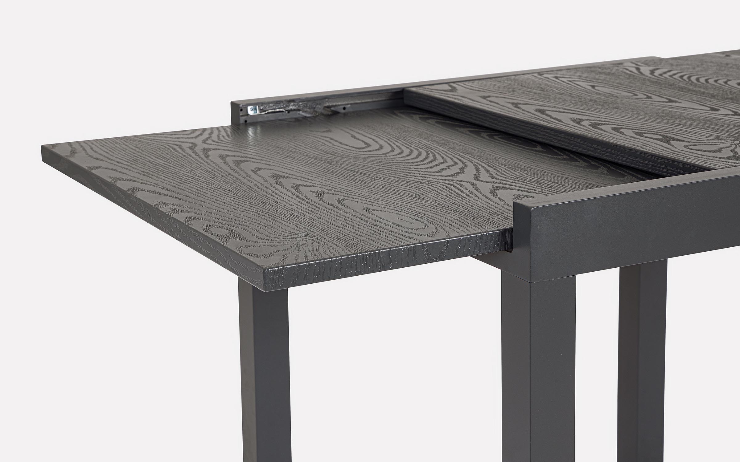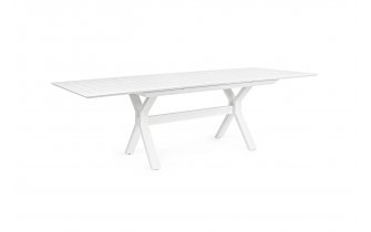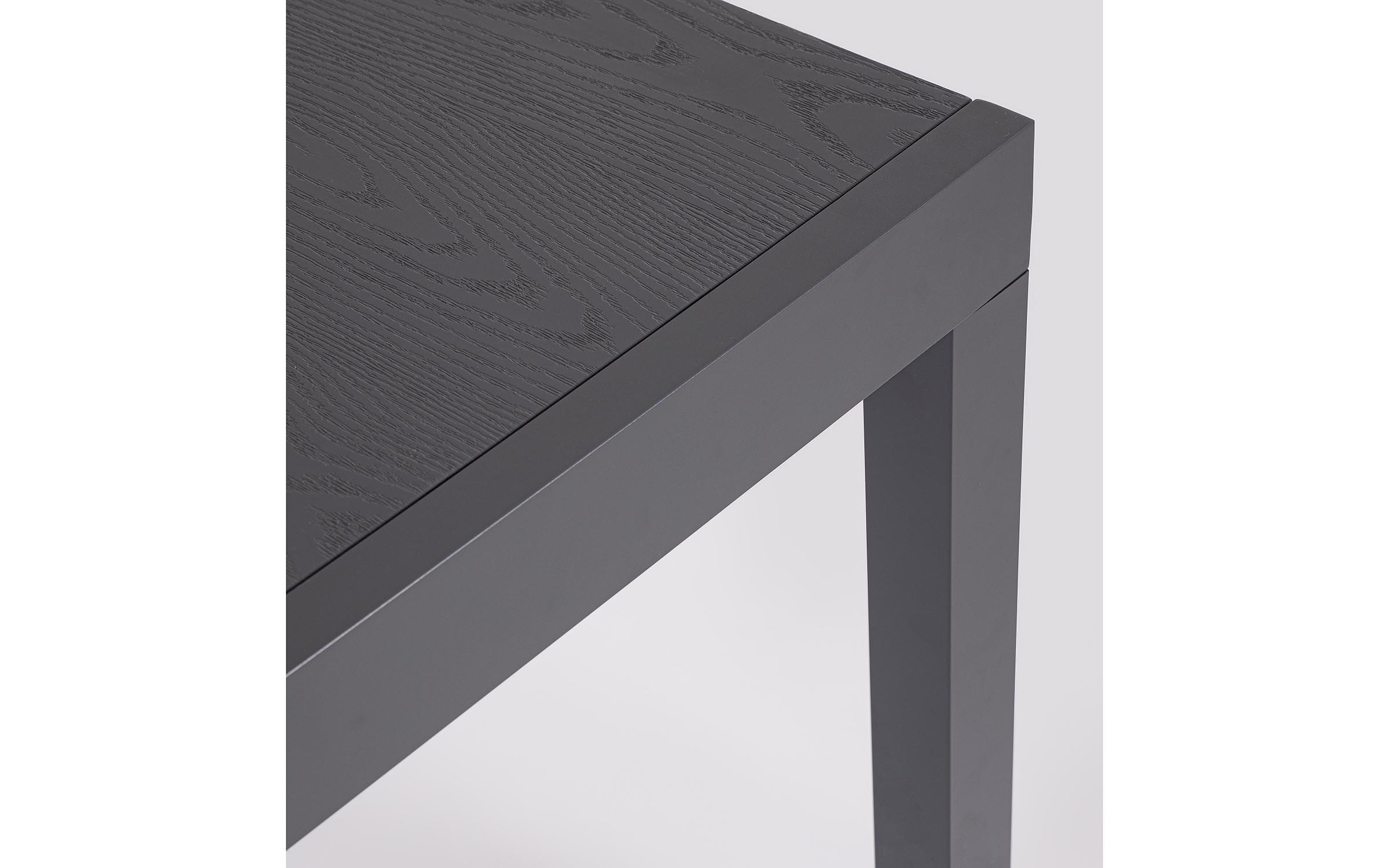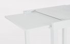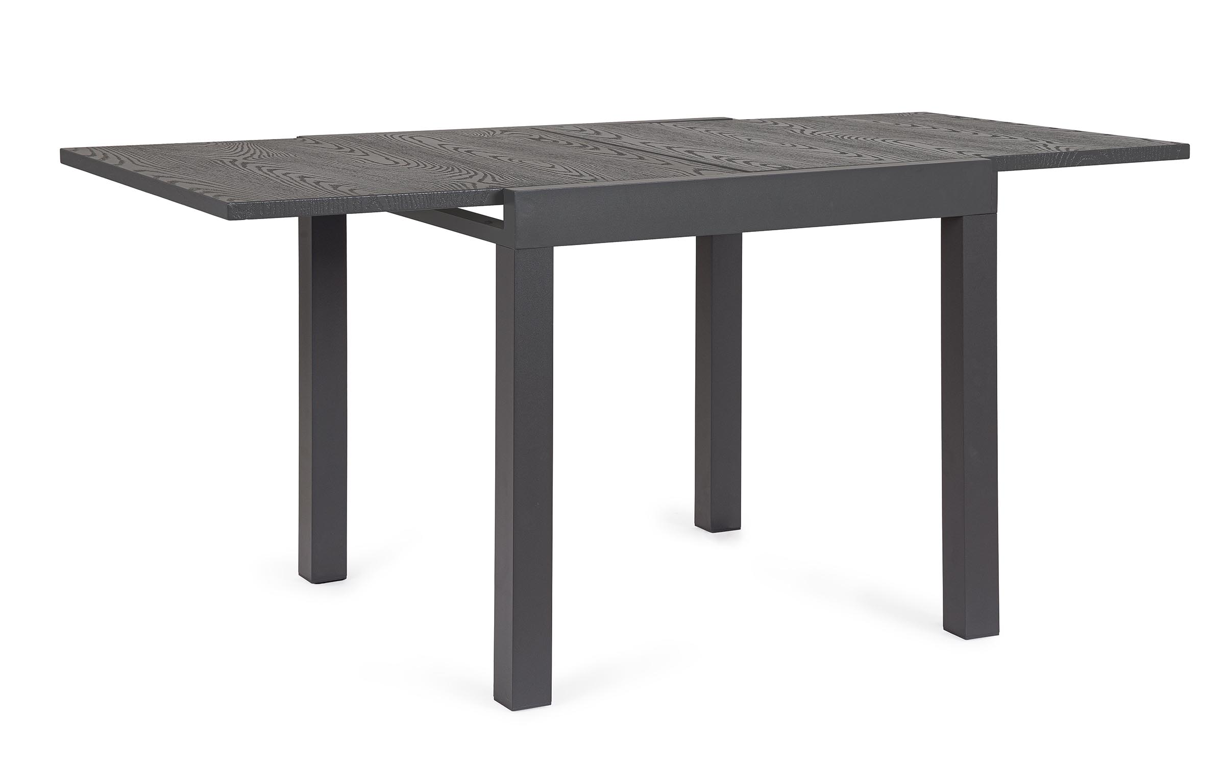 Konstrukcja aluminiowa stołu i mebli malowana proszkowo. System rozkładania: blat wydłużający wysuwany spod blatu głównego i podnoszony do właściwego poziomu.