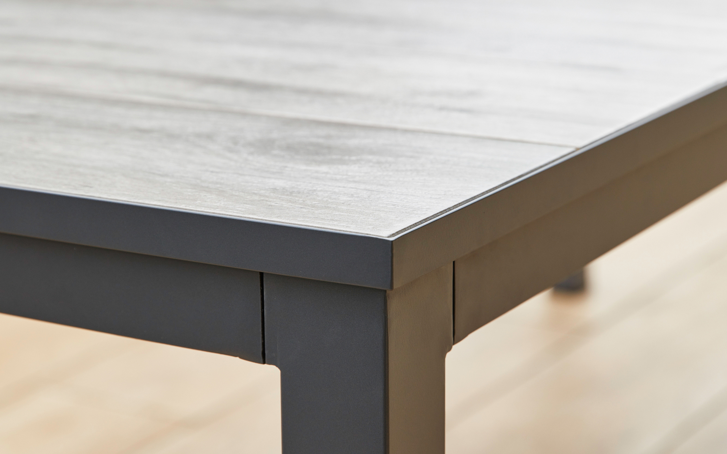 Konstrukcja z aluminium, blat z ceramiki. Materiały odporne na wilgoć, promieniowanie UV i zabrudzenia. Łatwe w pielęgnacji, nie wymagają impregnacji.