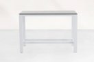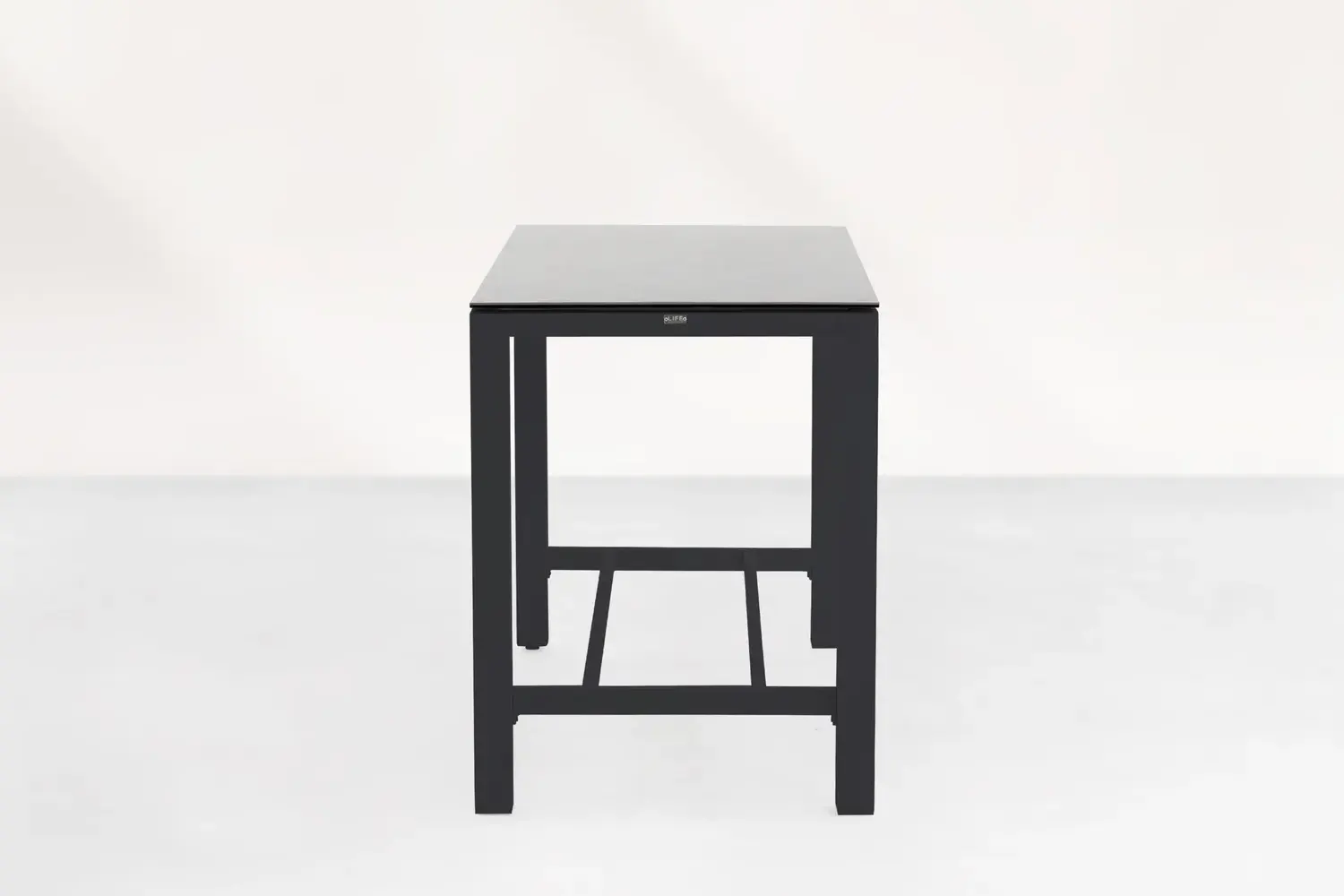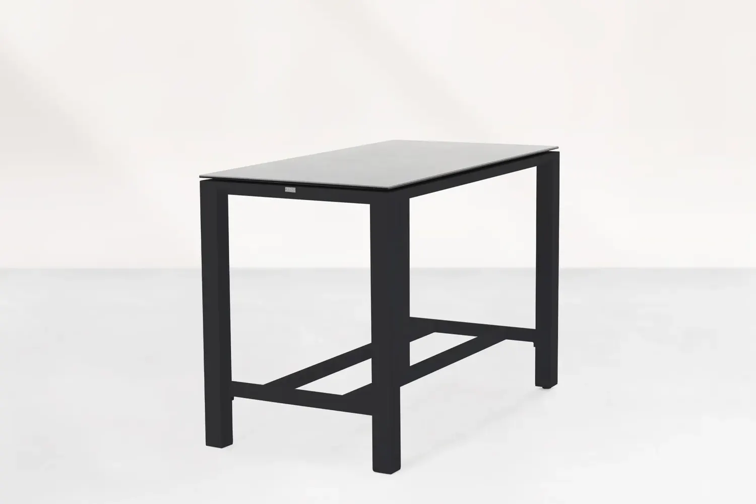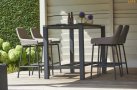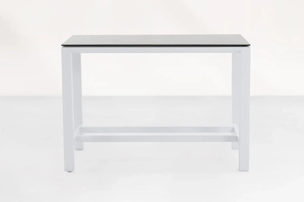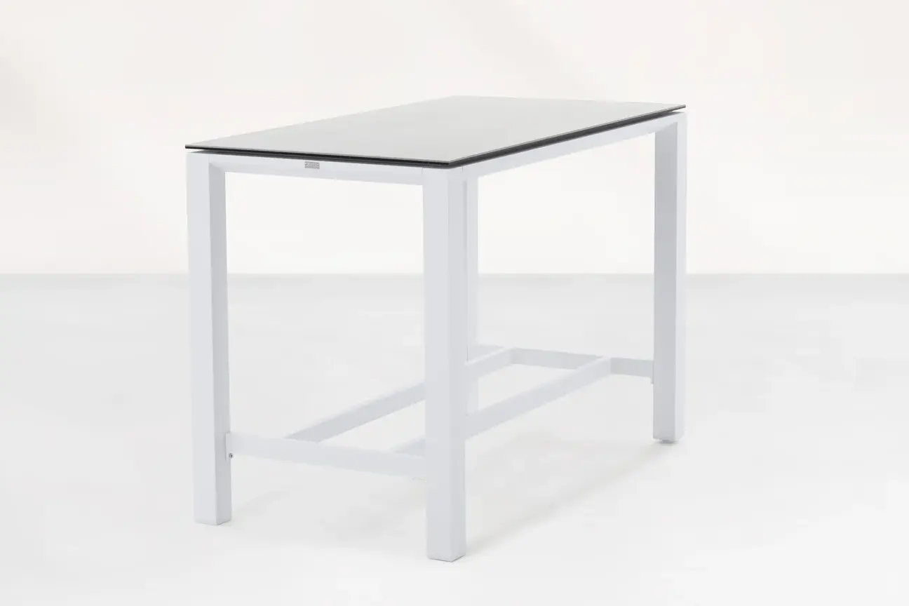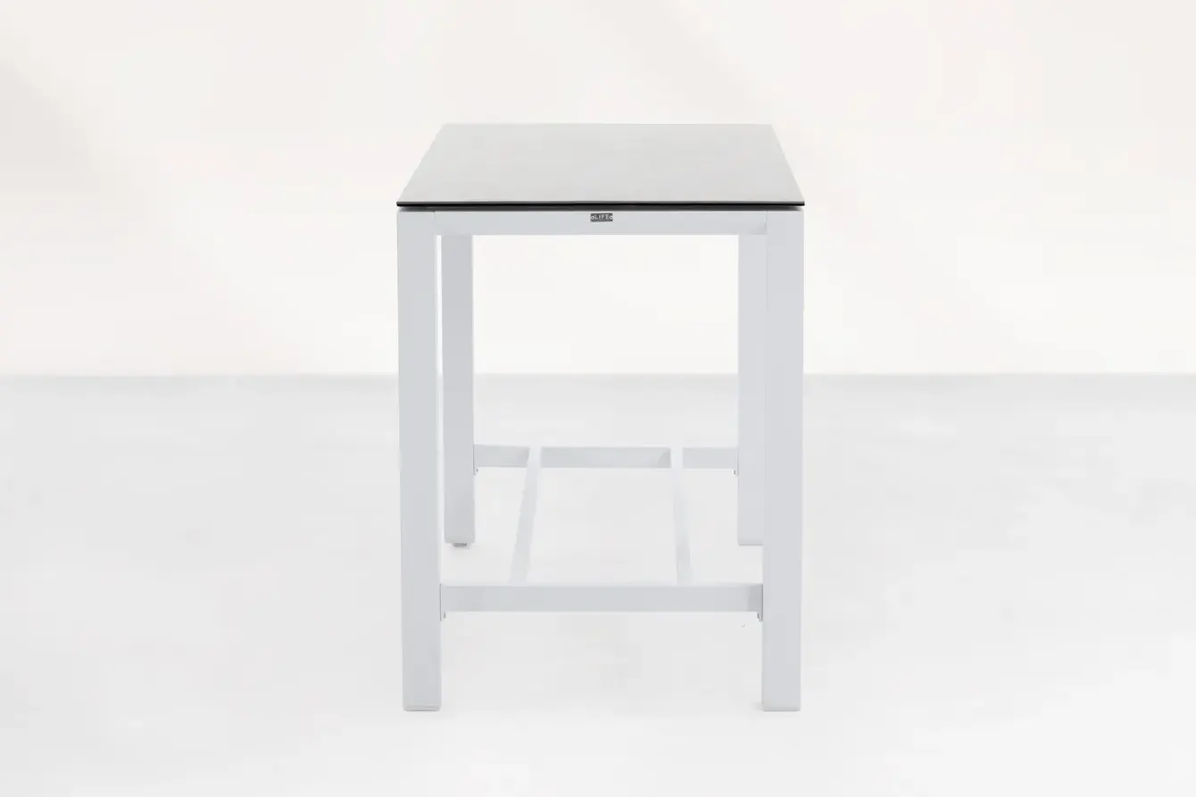 Stylowy stół barowy do ogrodu lub na taras z podstawą aluminiową w kolorze białym lub ciemnoszarym oraz ceramicznym blatem, idealny do użytku z wysokimi krzesłami barowymi.