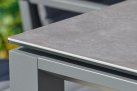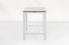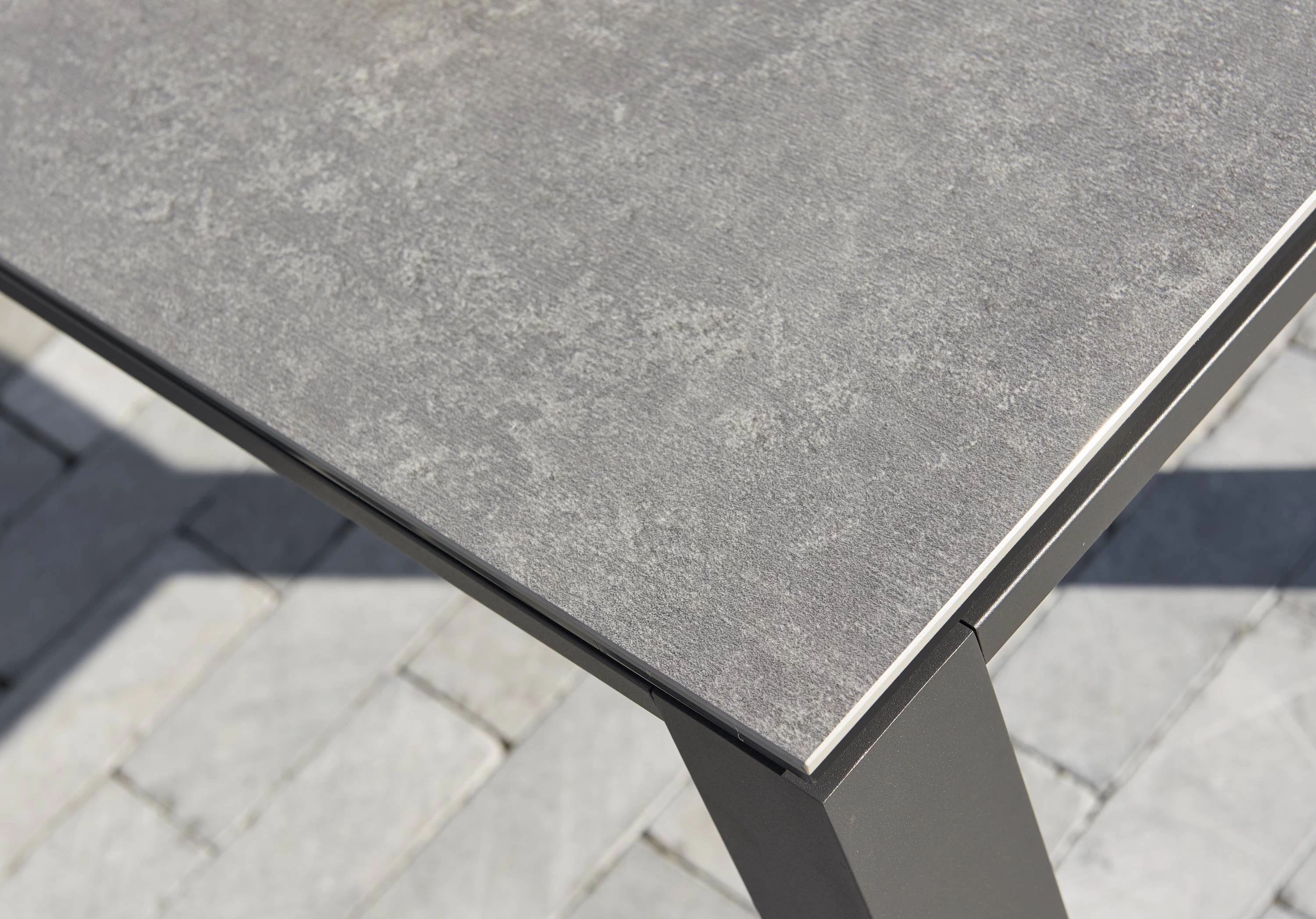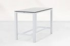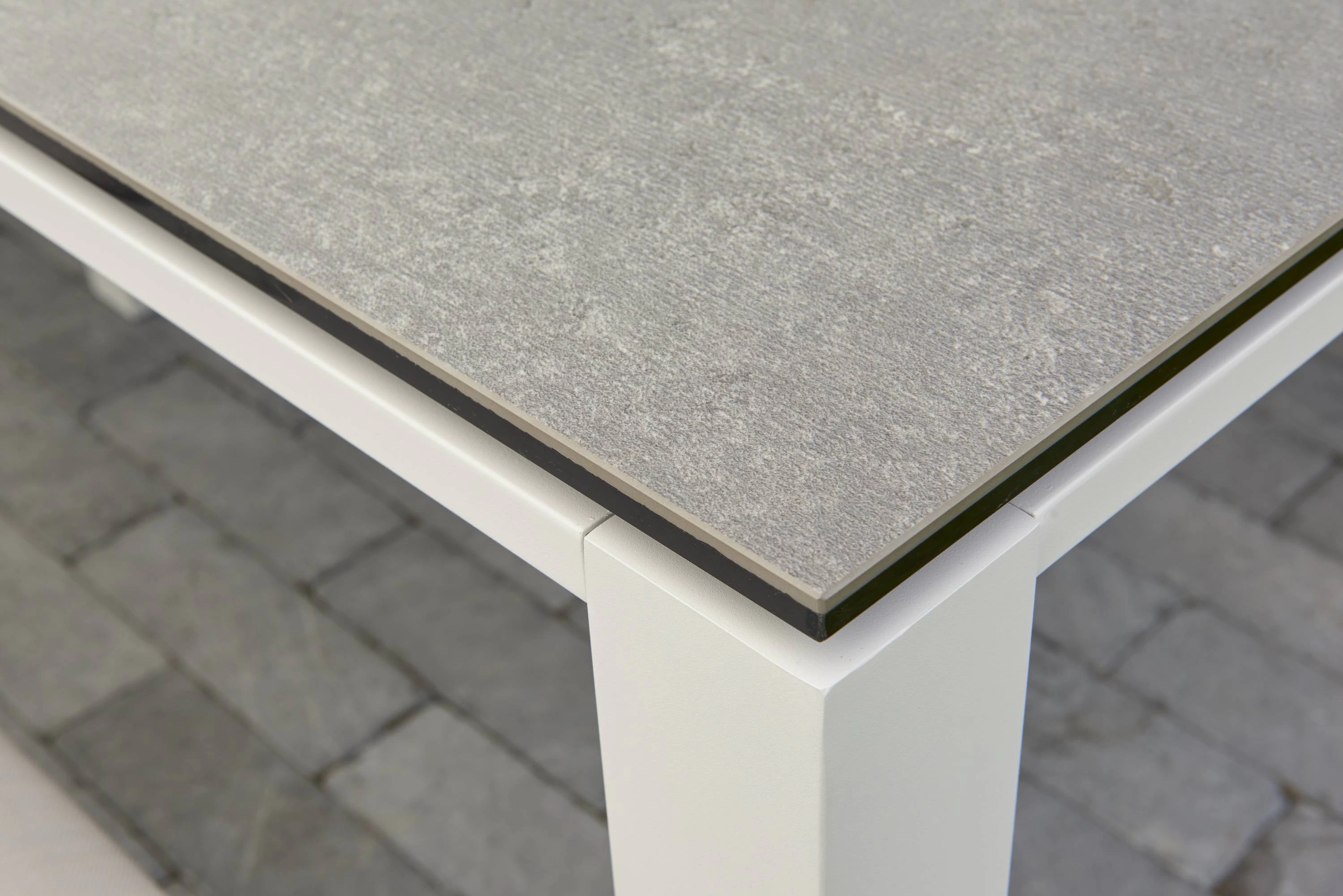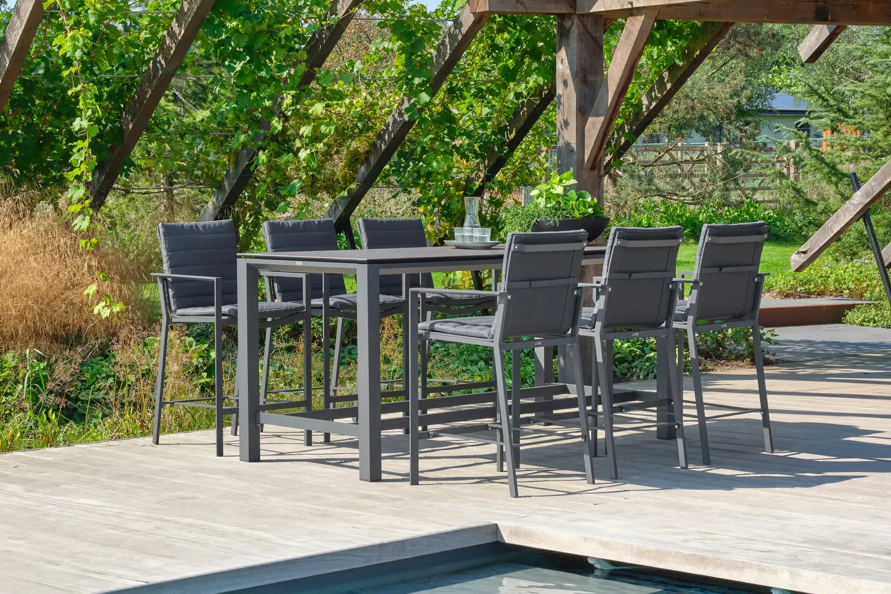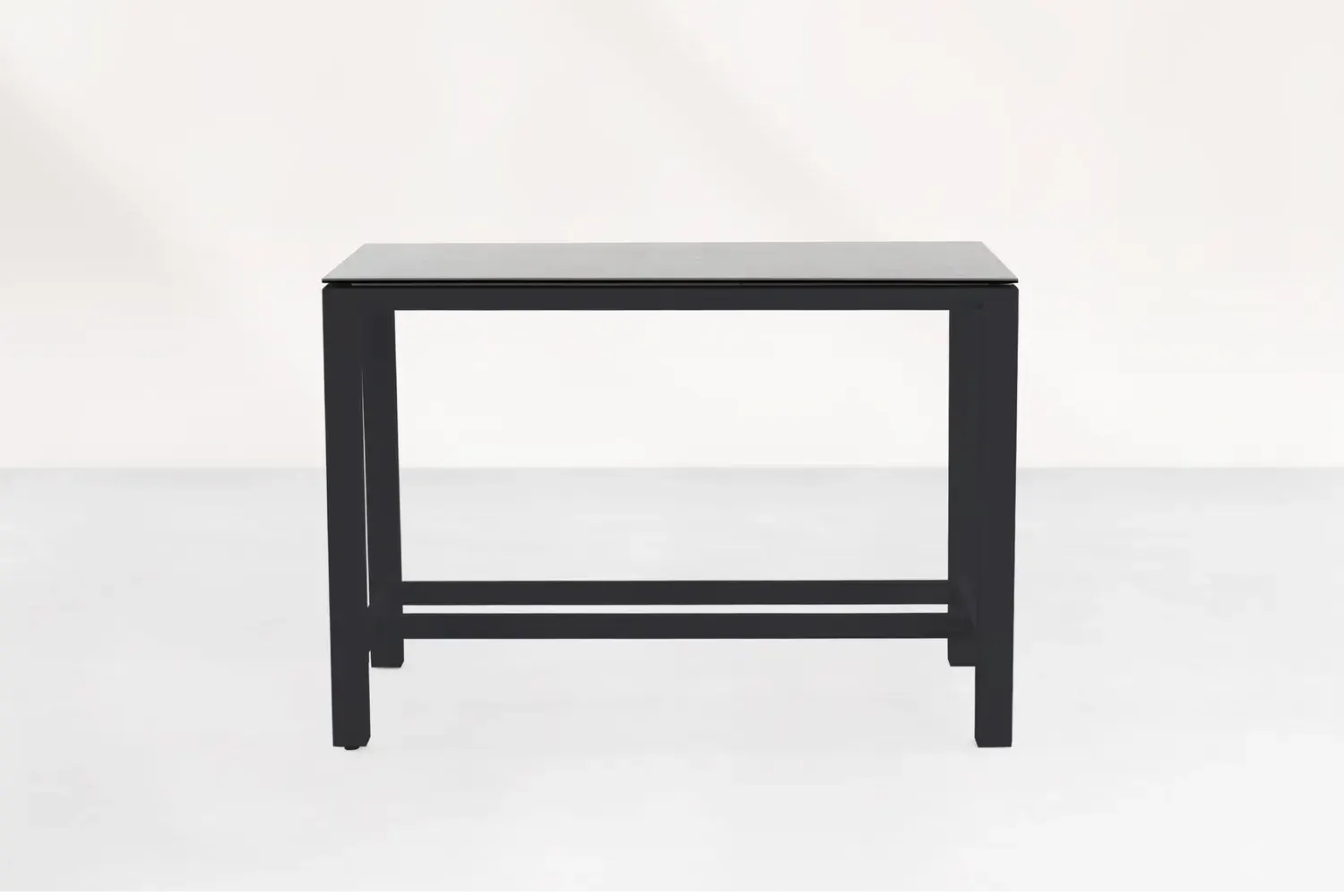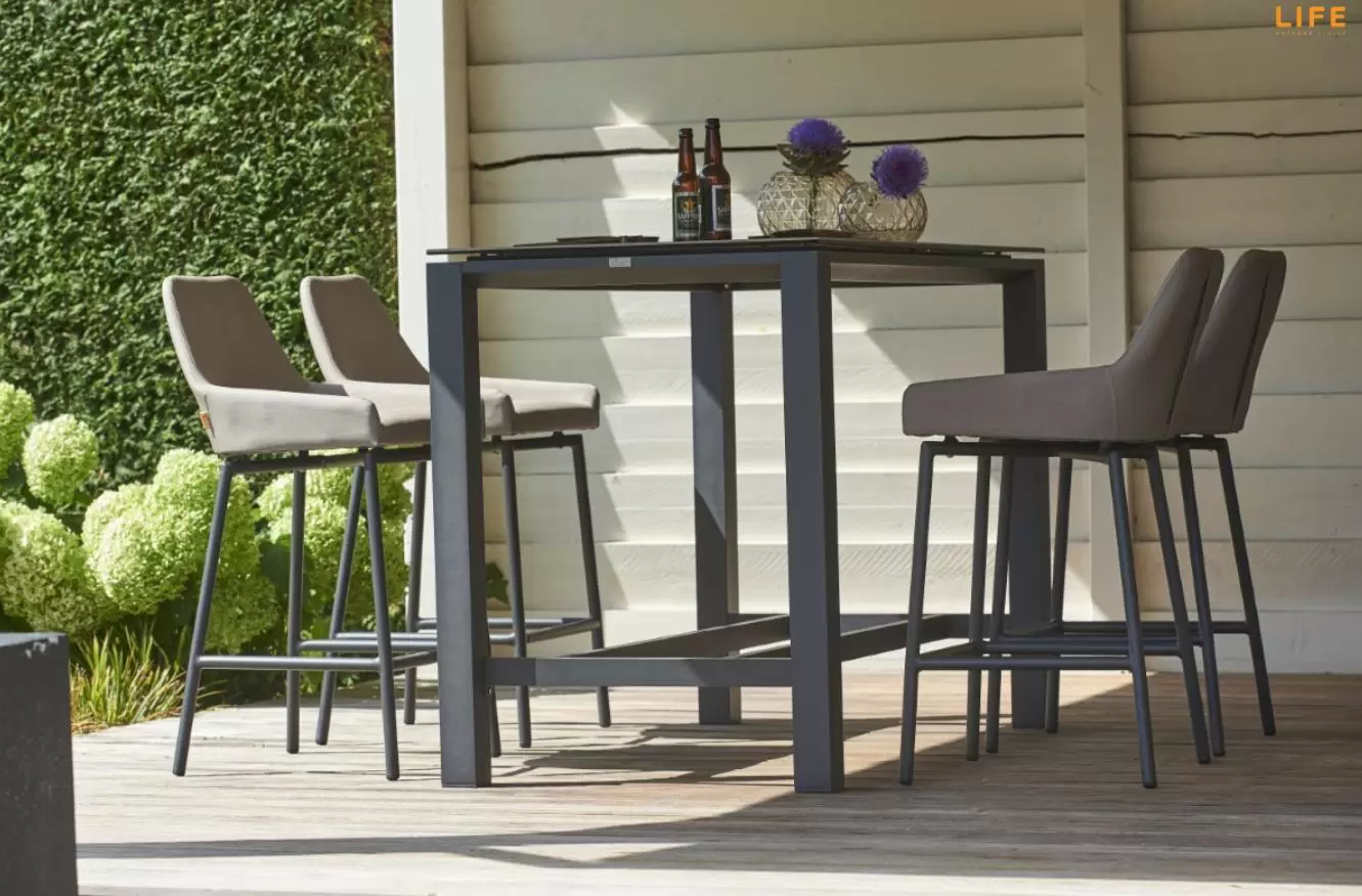 Stylowy stół barowy do ogrodu lub na taras z podstawą aluminiową w kolorze białym lub ciemnoszarym oraz ceramicznym blatem, idealny do użytku z wysokimi krzesłami barowymi.