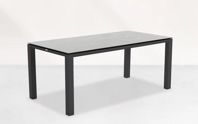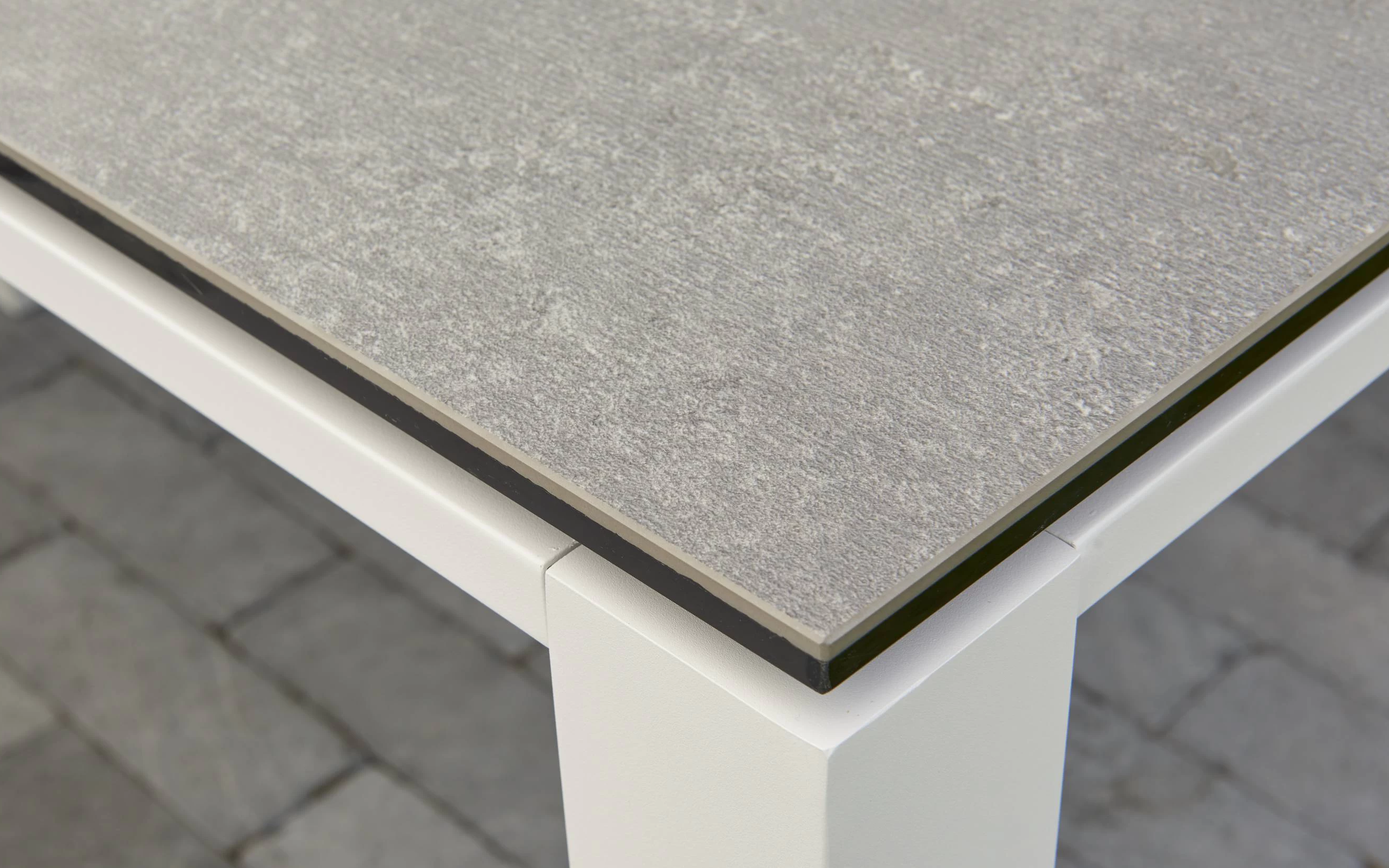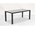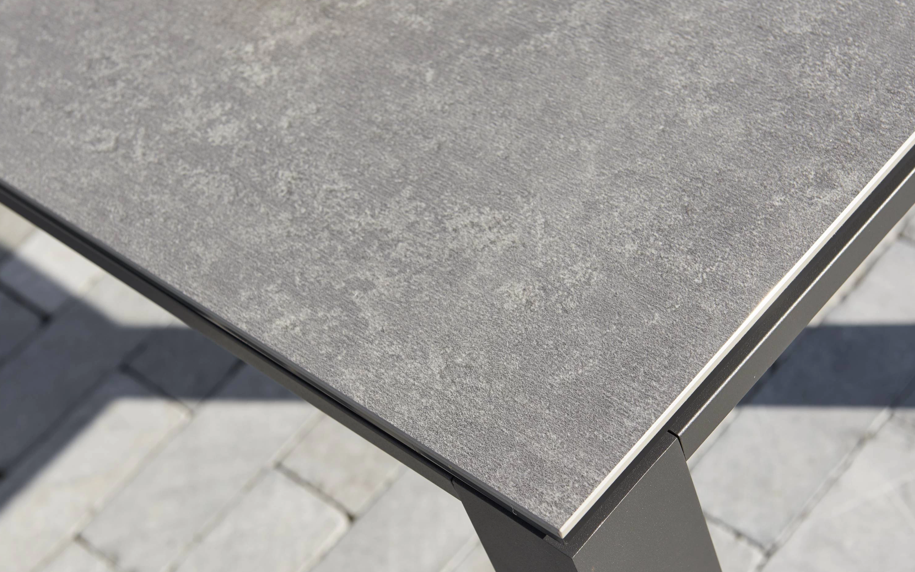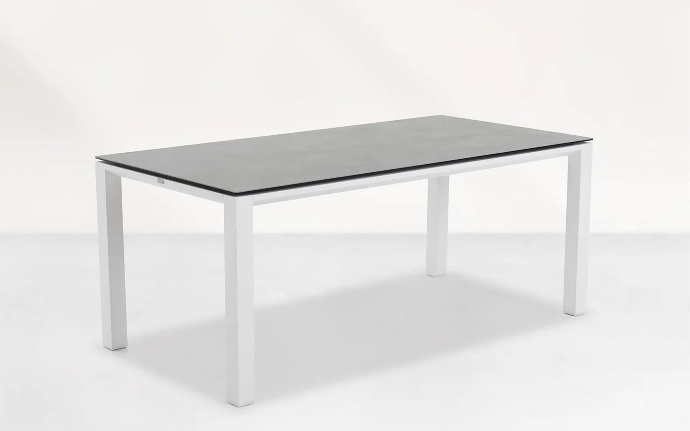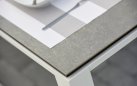 Elegancki stół ogrodowy z podstawą aluminiową w kolorze białym lub ciemnoszarym oraz trwałym ceramicznym blatem, idealny do ogrodów i tarasów.