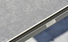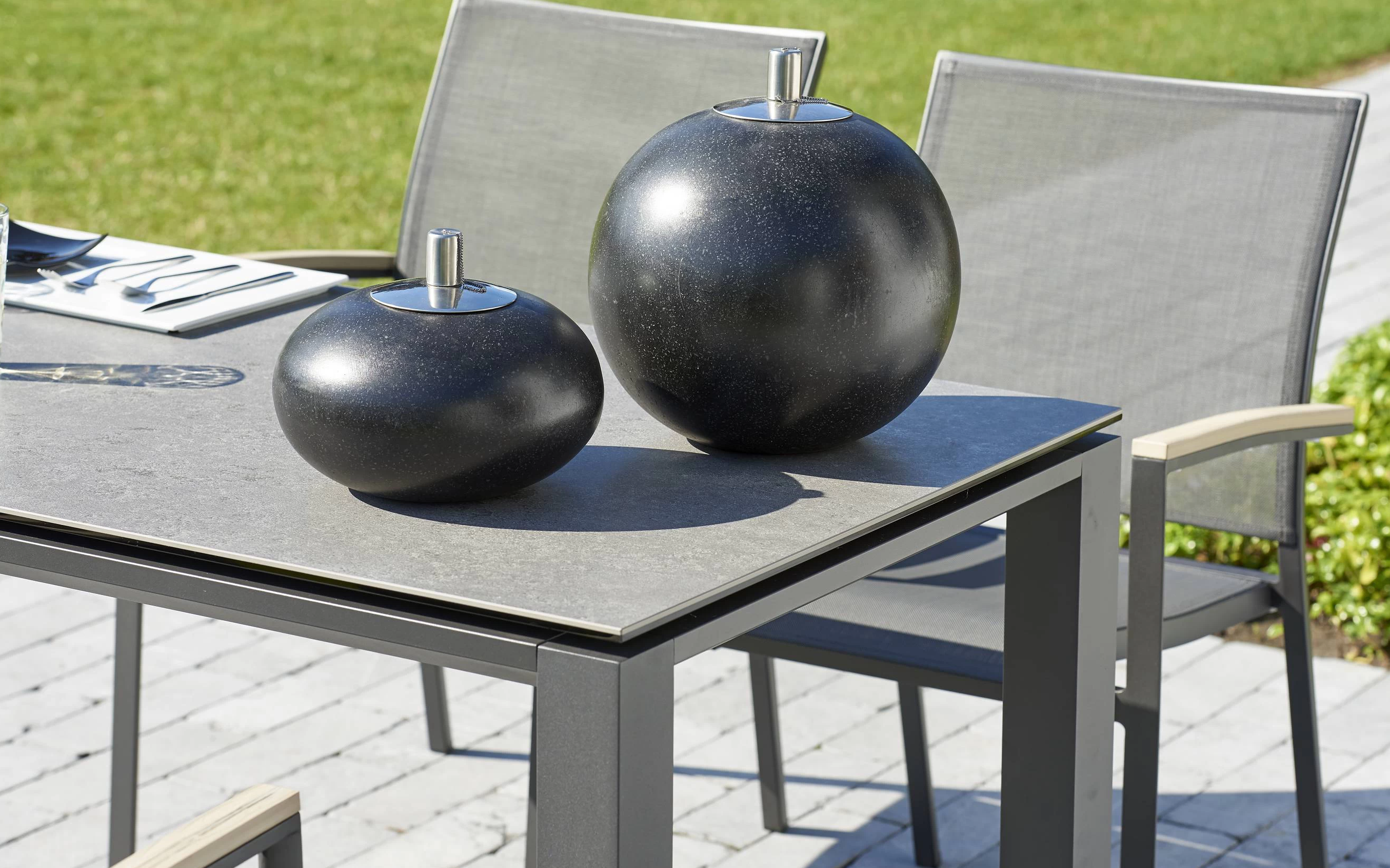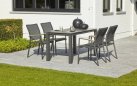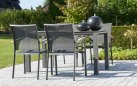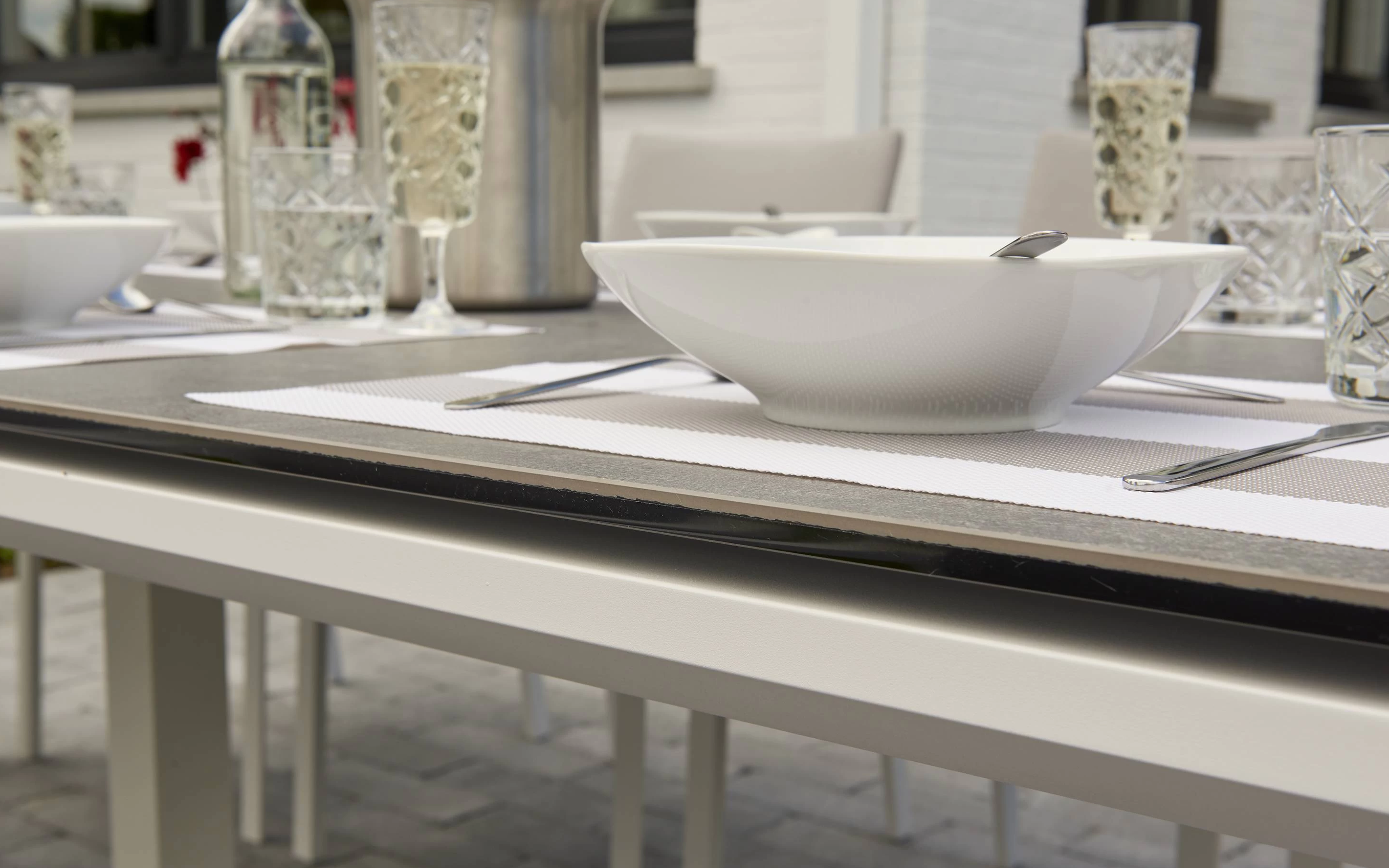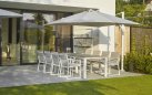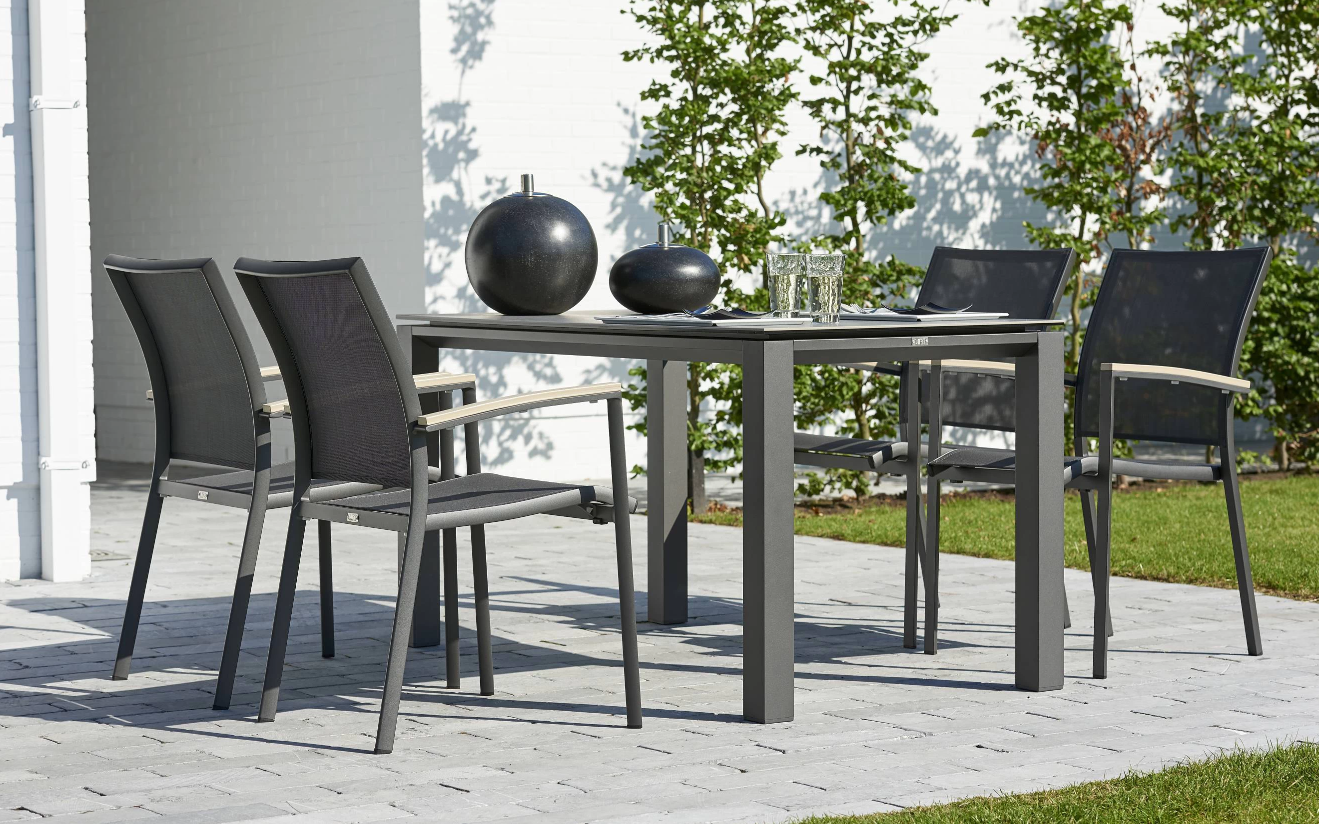 Elegancki stół ogrodowy z podstawą aluminiową w kolorze białym lub ciemnoszarym oraz trwałym ceramicznym blatem, idealny do ogrodów i tarasów.