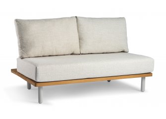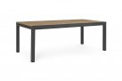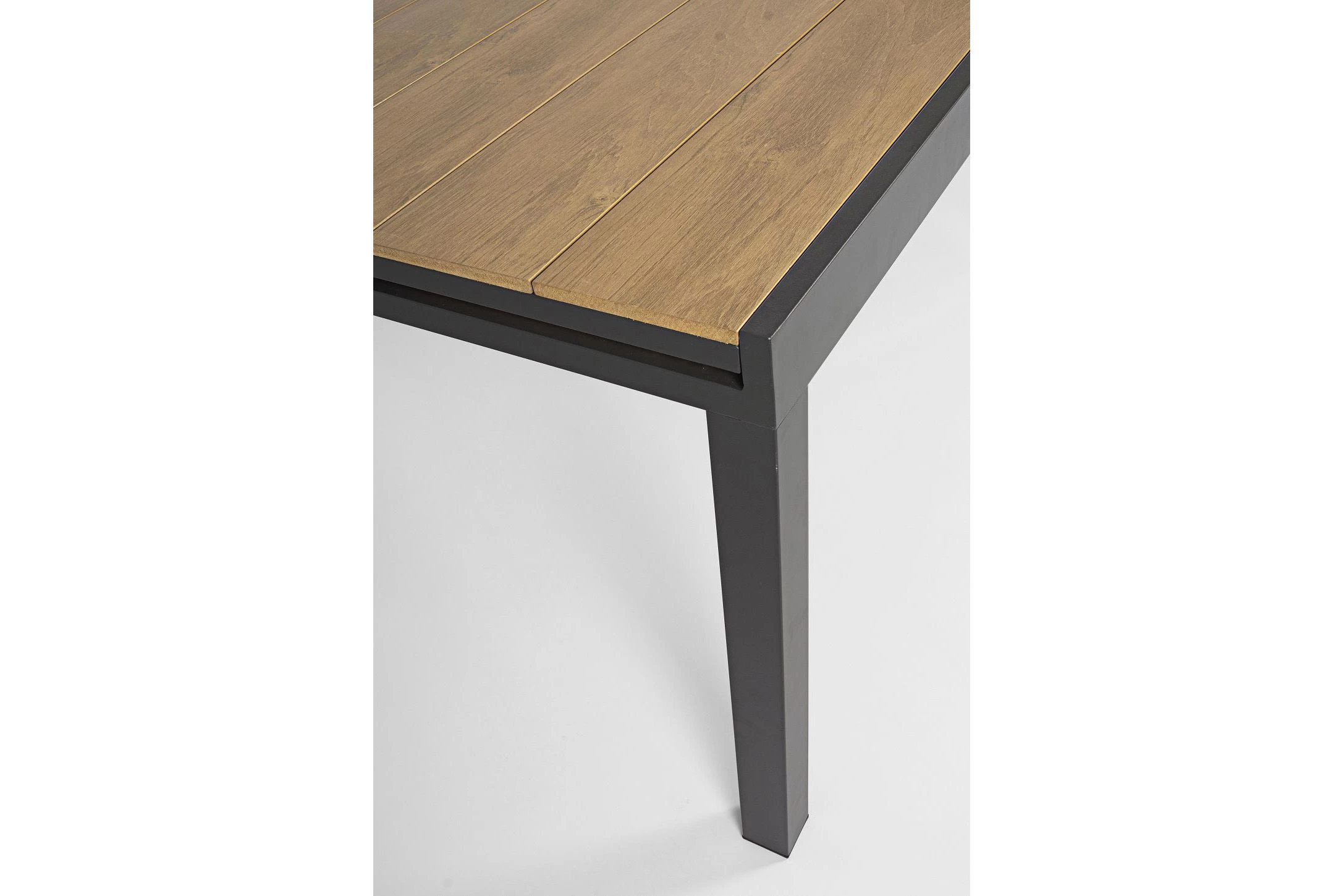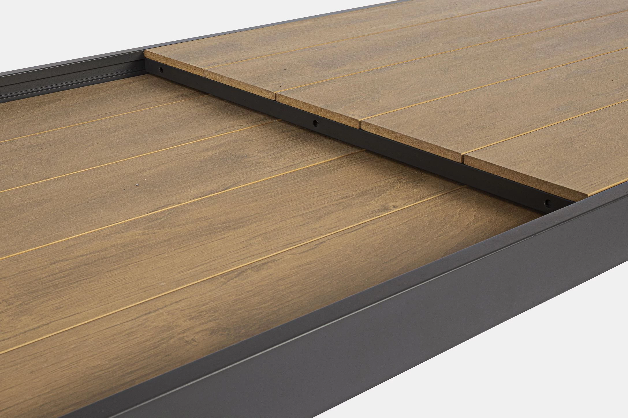 Blat stołu z deseczek kompozytowych o wyglądzie drewna teak. Materiał odporny na działanie warunków zewnętrznych.