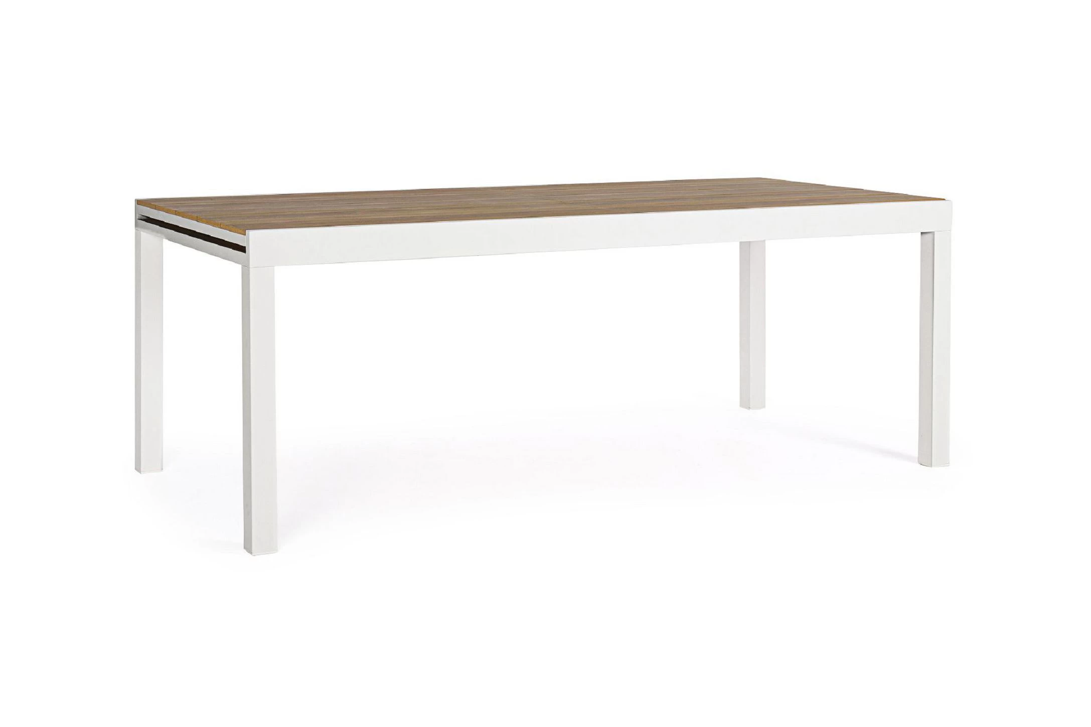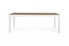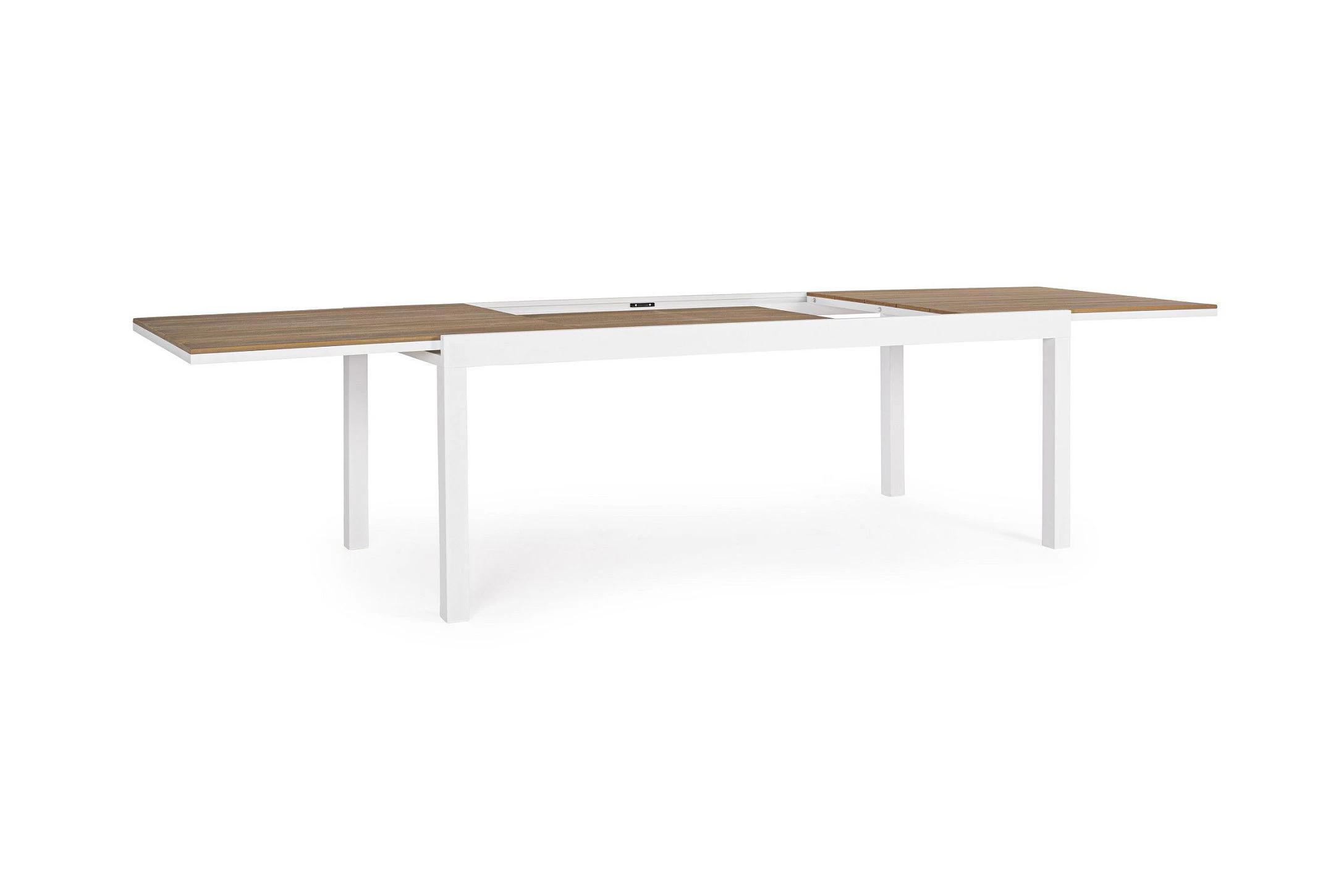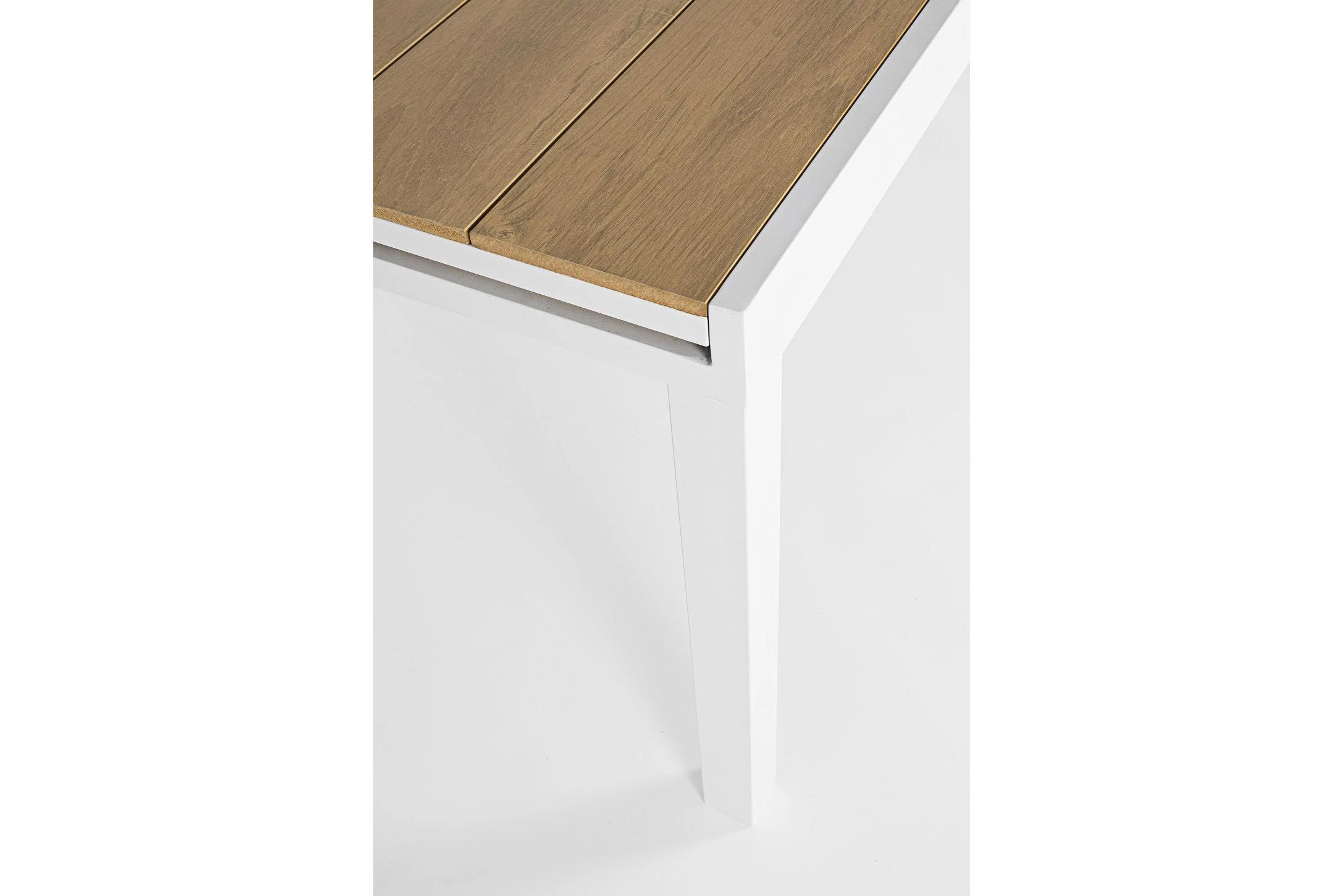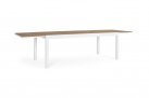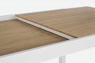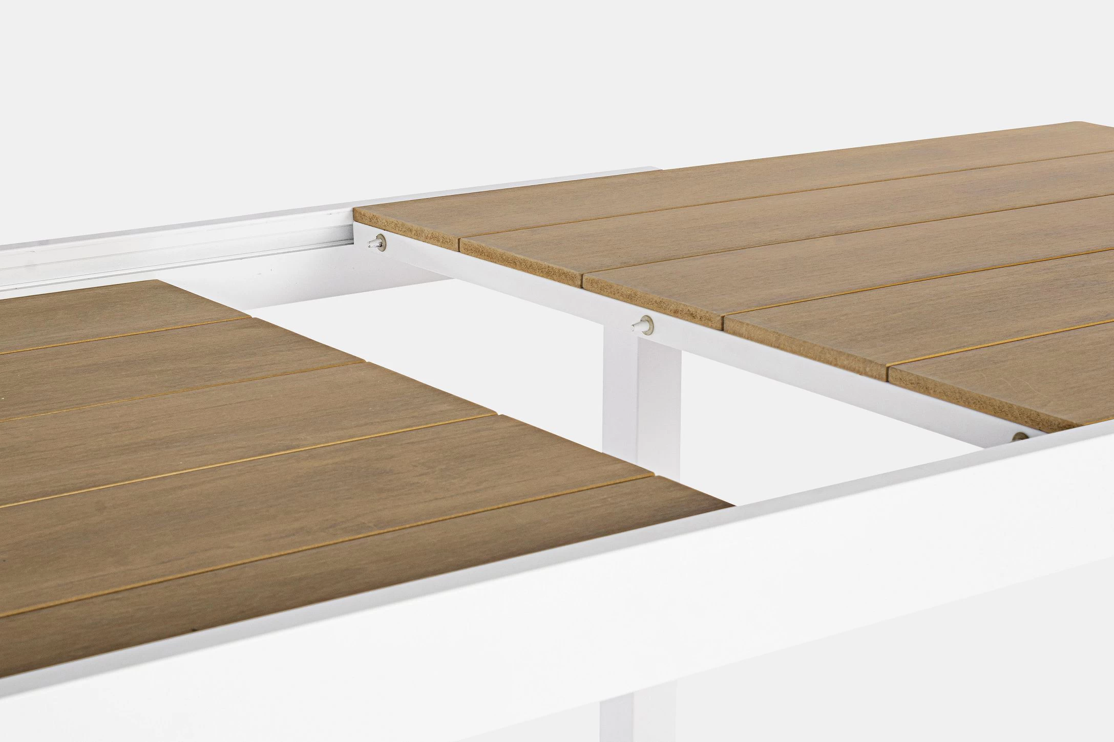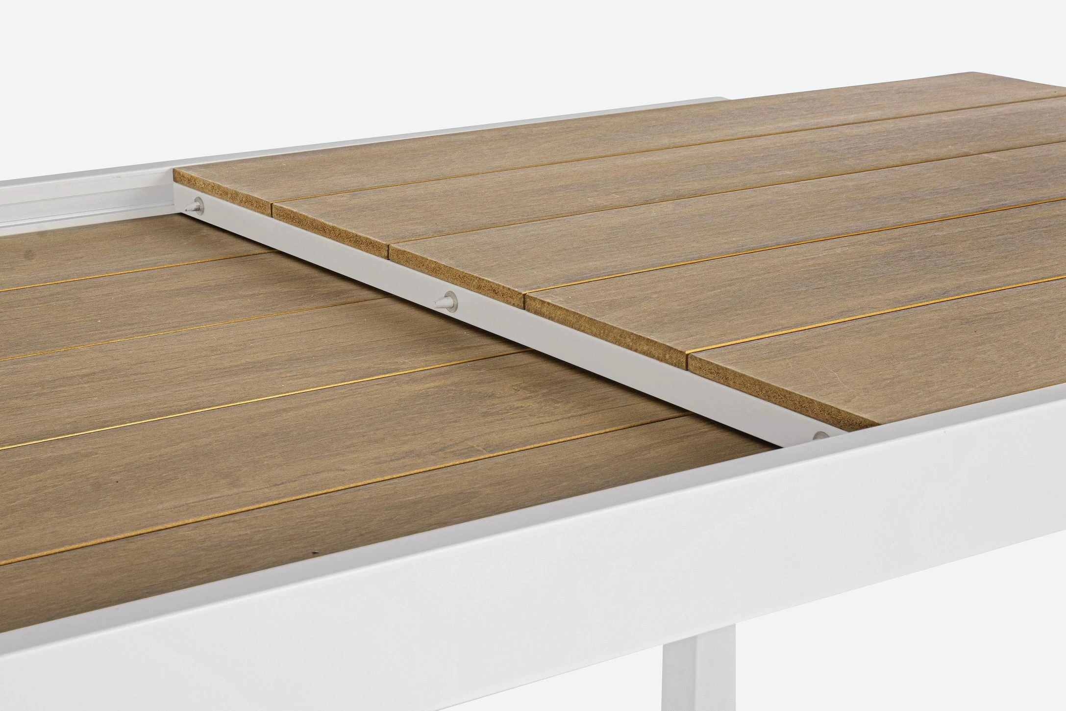 Aluminiowy ogrodowy stół z rozsuwanym blatem od 200 do 300 cm. Blat stołu wykonany z poprzecznych deseczek kompozytowych o wyglądzie drewna teakowego. Kolory podstawy biały lub ciemnoszary.