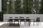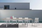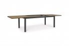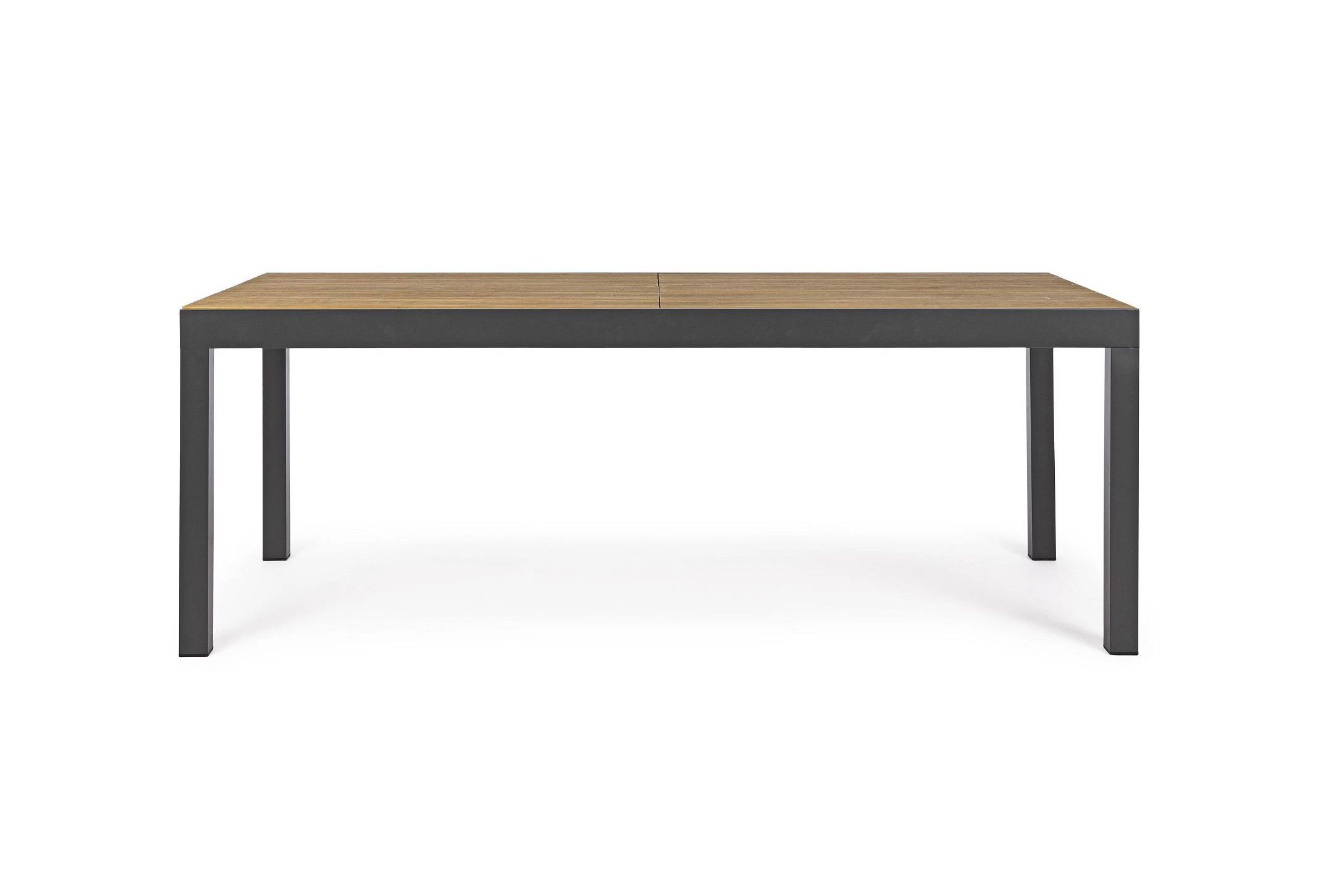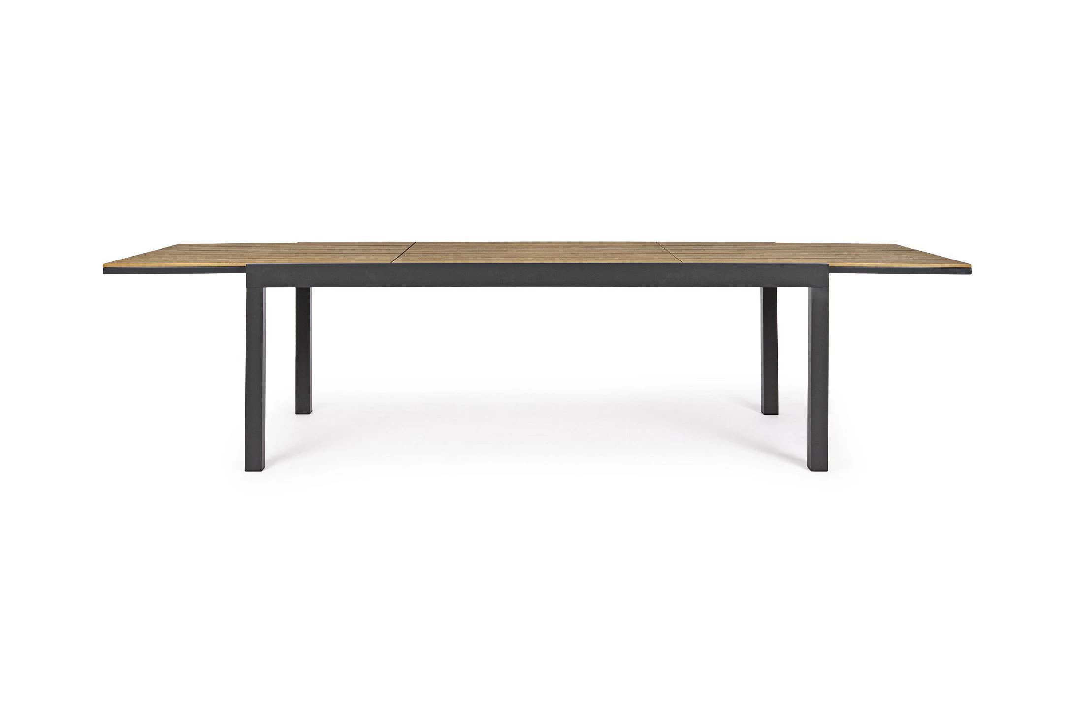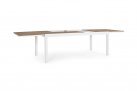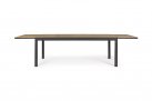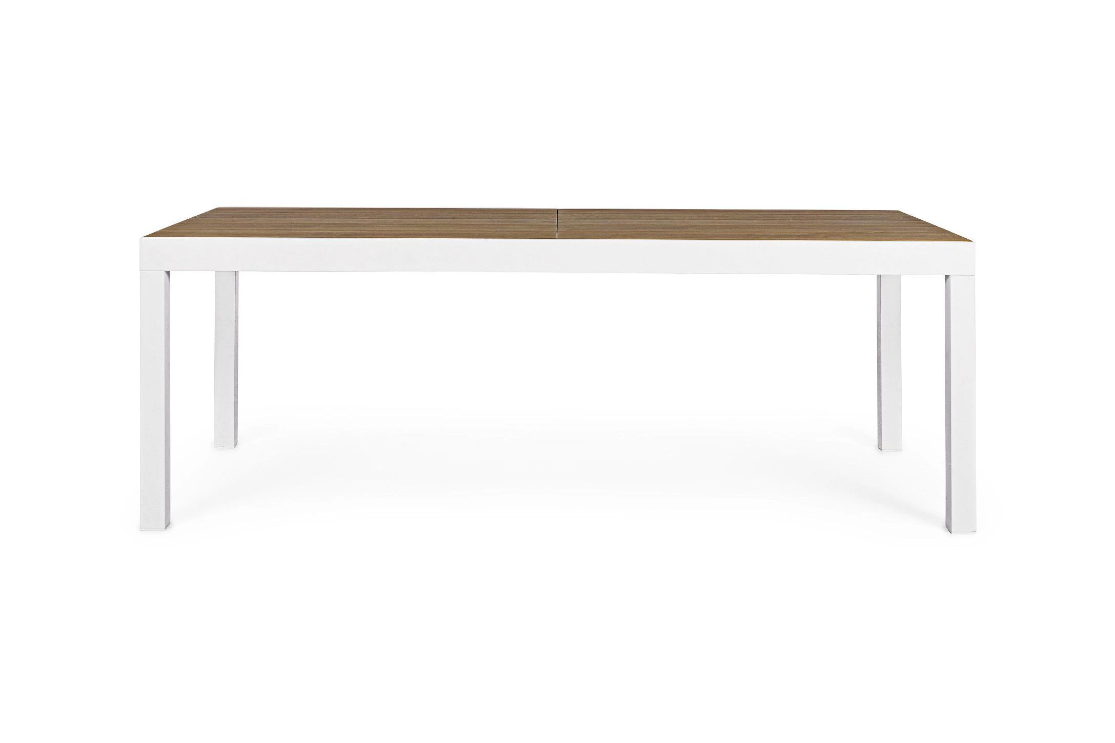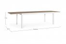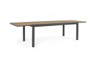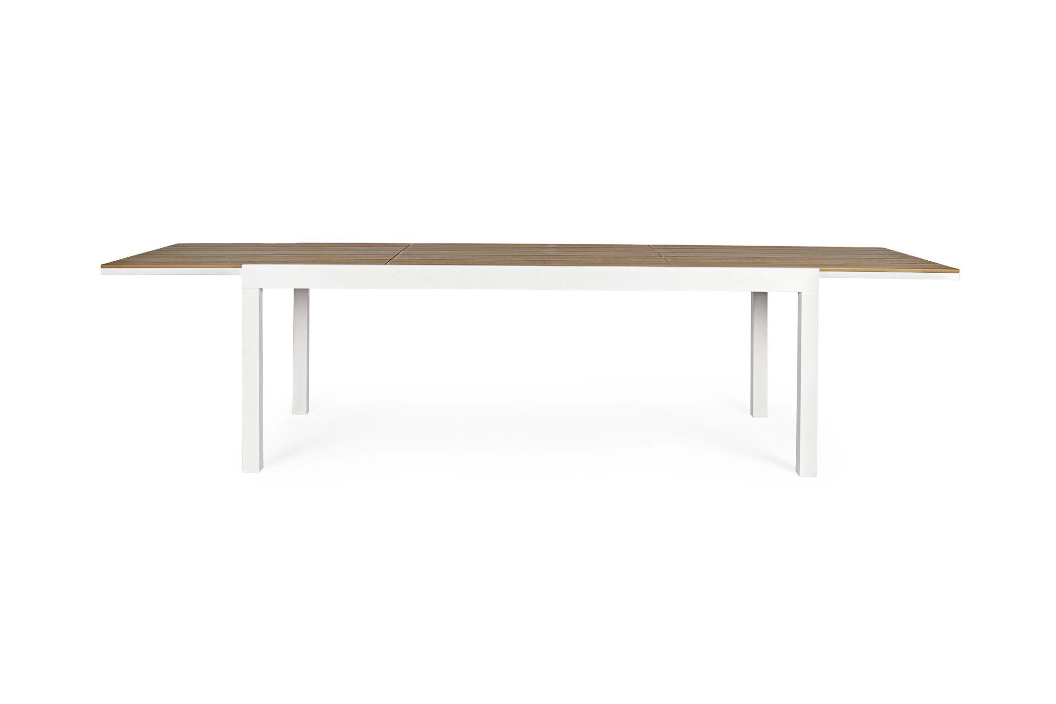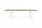 Aluminiowy ogrodowy stół z rozsuwanym blatem od 200 do 300 cm. Blat stołu wykonany z poprzecznych deseczek kompozytowych o wyglądzie drewna teakowego. Kolory podstawy biały lub ciemnoszary.
