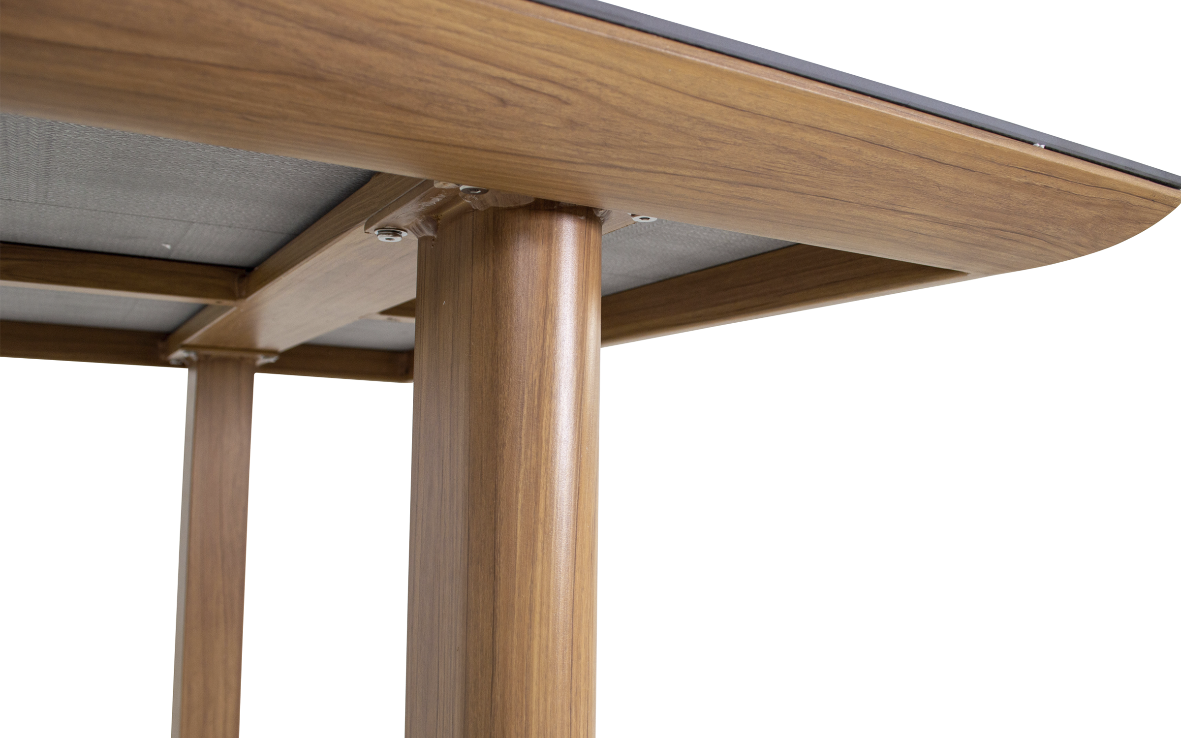 Ten stół łączy naturalną elegancję z nowoczesnym designem i wysoką jakością wykonania, stając się stylowym centrum każdego wnętrza lub przestrzeni ogrodowej. Stabilna konstrukcja z aluminium w wykończeniu optyka drewna nadaje mu ciepły charakter i ponadczasowy wygląd, jednocześnie zachowując wszystkie zalety aluminium – lekkość, trwałość i odporność na warunki atmosferyczne. Obszerna powierzchnia blatu z kamienia spiekanego o grubości 6 mm tworzy nowoczesny kontrast i łączy estetykę z funkcjonalnością. Kamień spiekany wyróżnia się wyjątkową odpornością: jest odporny na zarysowania, wysoką temperaturę, promieniowanie UV oraz łatwy w pielęgnacji. Naturalna struktura powierzchni emanuje spokojem i elegancją, harmonijnie wpisując się w różne style aranżacyjne – od minimalistycznych po inspirowane naturą. Dzięki wymiarom 200×90×75 stół oferuje dużo miejsca na wspólne posiłki, spotkania przy kawie czy kreatywną pracę. Prostokątna forma zapewnia elastyczność ustawienia zarówno w mniejszych, jak i większych przestrzeniach. ESPINAR to coś więcej niż funkcjonalny mebel – to połączenie trwałości, ponadczasowej elegancji i najwyższej jakości materiałów, które podkreślają świadomość designu i praktyczność w codziennym użytkowaniu.
