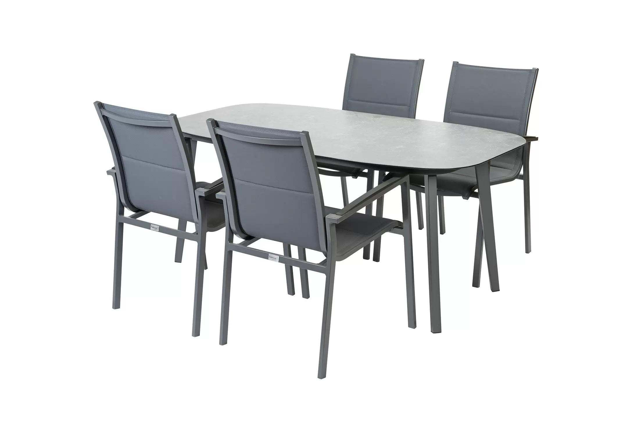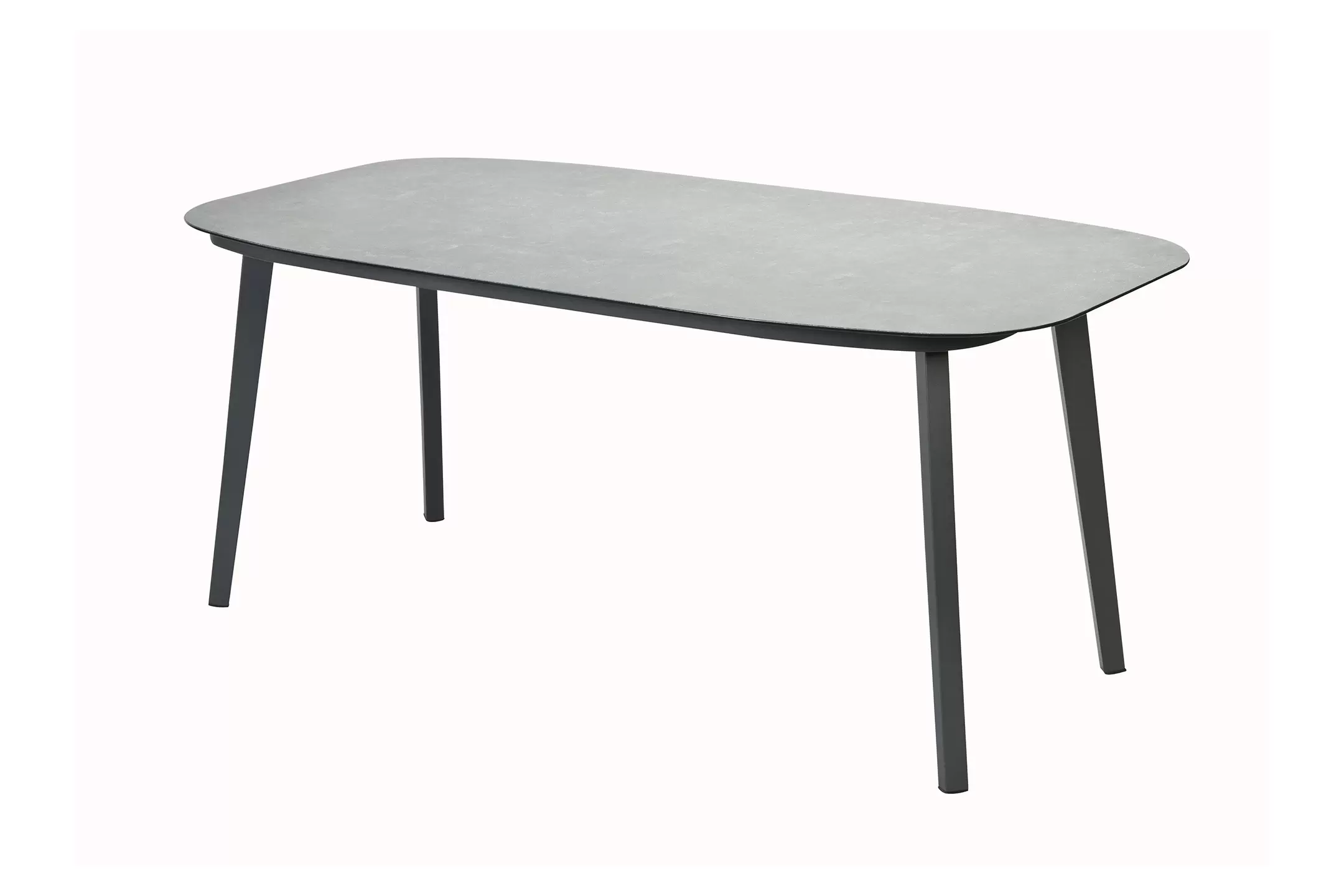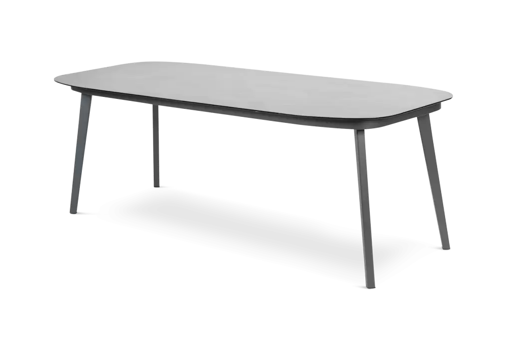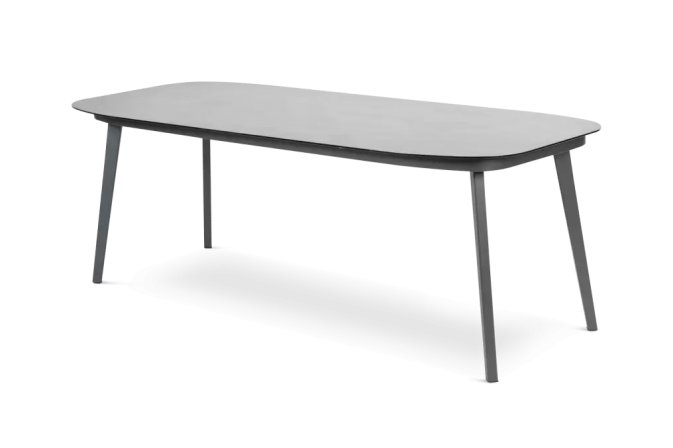 Nowoczesne stoły ogrodowe o aluminiowej ciemnoszarej konstrukcji z zaokrąglonymi ma rogach blatami ceramicznymi.