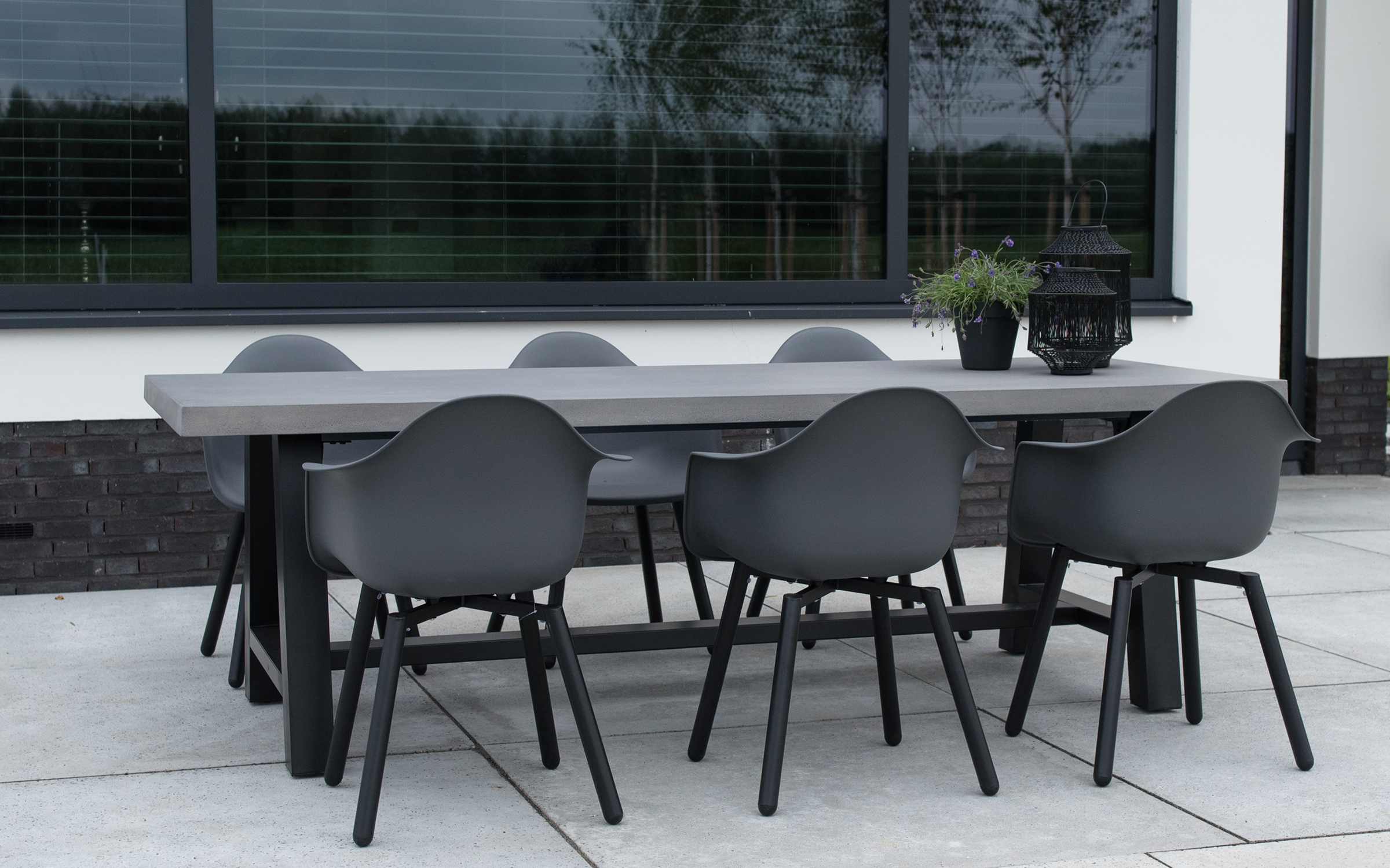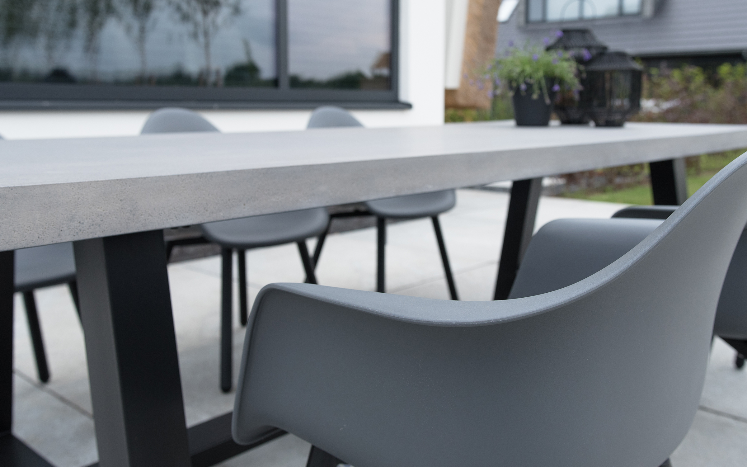 Jego solidna konstrukcja opiera się na ramie z aluminium malowanego proszkowo w głębokim, matowym antracycie, gwarantującej stuprocentową odporność na korozję i wszelkie kaprysy pogody. Prawdziwym klejnotem FRESCO jest jednak jego blat. Wykonany z 6-milimetrowego kamienia spiekanego, wzmocnionego aluminiowym wzmocnieniem typu plaster miodu, zachwyca naturalną, szlachetną kolorystyką w odcieniach szarości. Ten materiał premium jest niemal niezniszczalny: niestraszne mu zarysowania, intensywne promienie UV, wilgoć ani wysokie temperatury, co czyni stół niezwykle praktycznym w codziennym użytkowaniu.