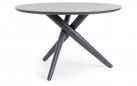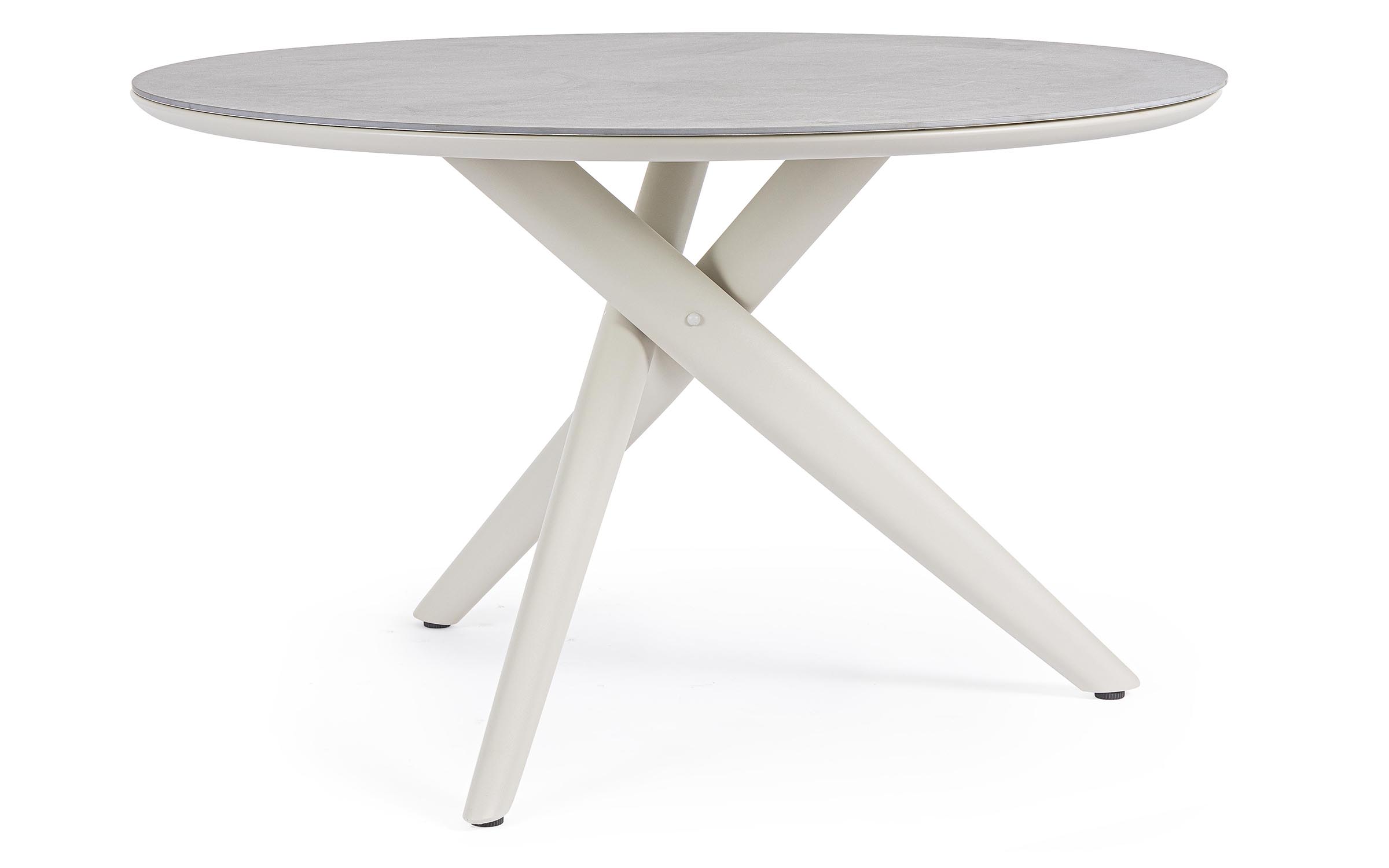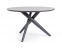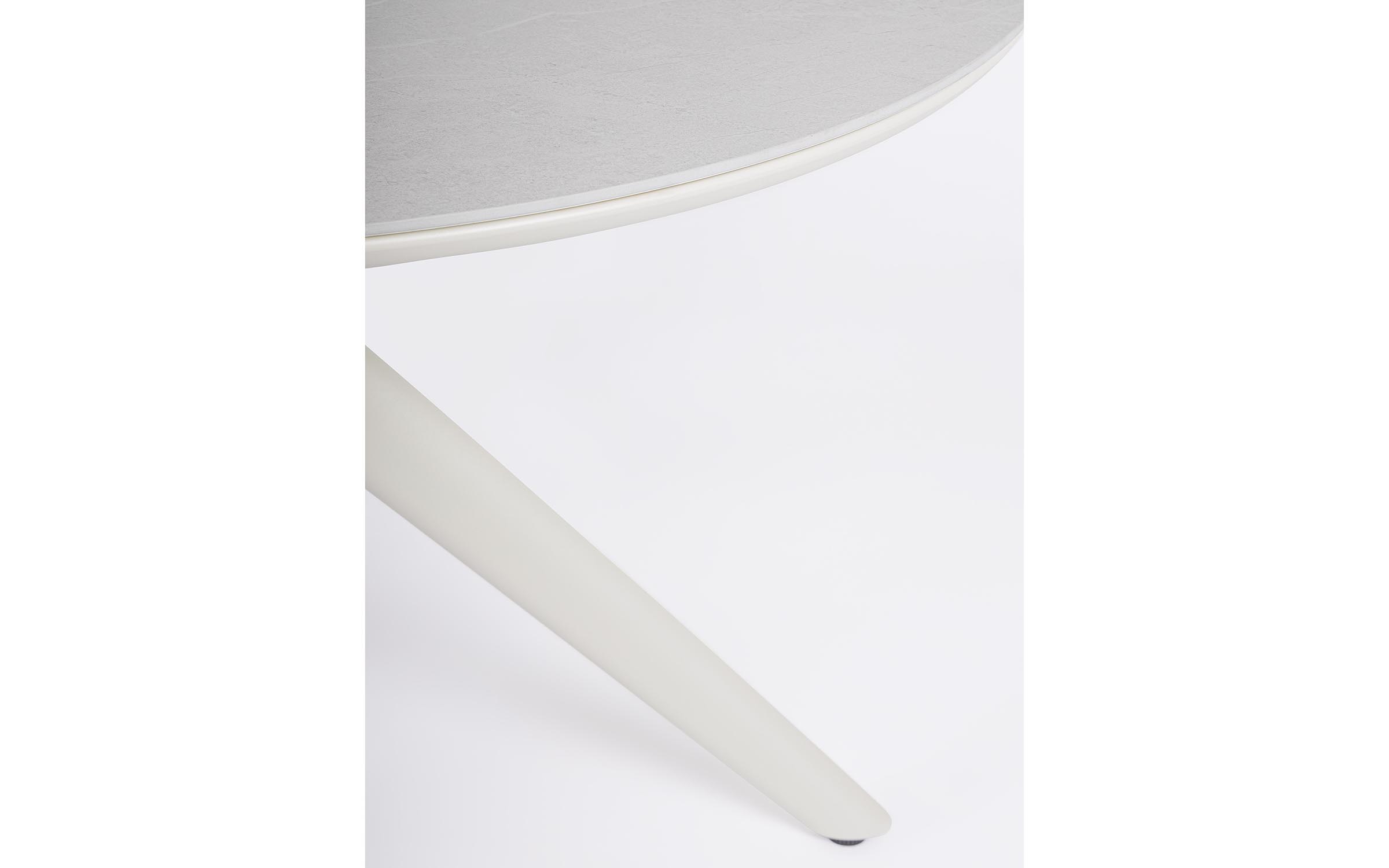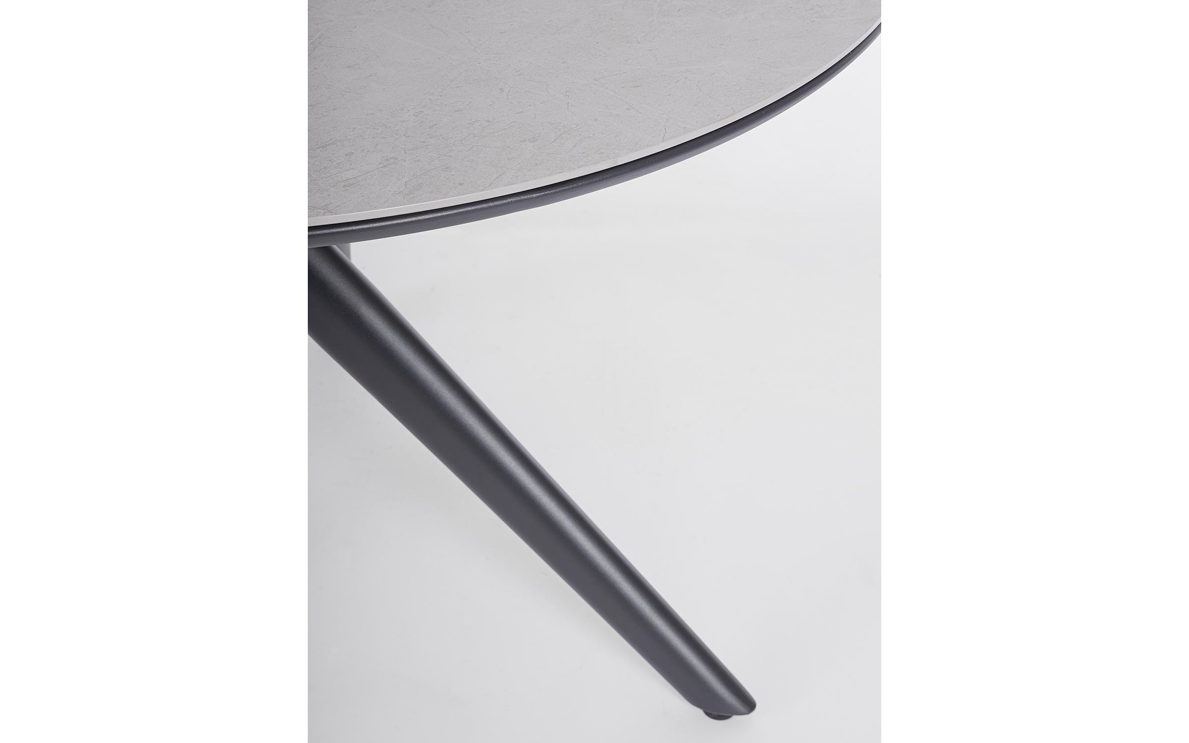 Okrągły stół na trzech skrzyżowanych nogach wykonanych z aluminium przykryty nowoczesnym blatem z kamienia spiekanego. Grubość blatu 11 mm.