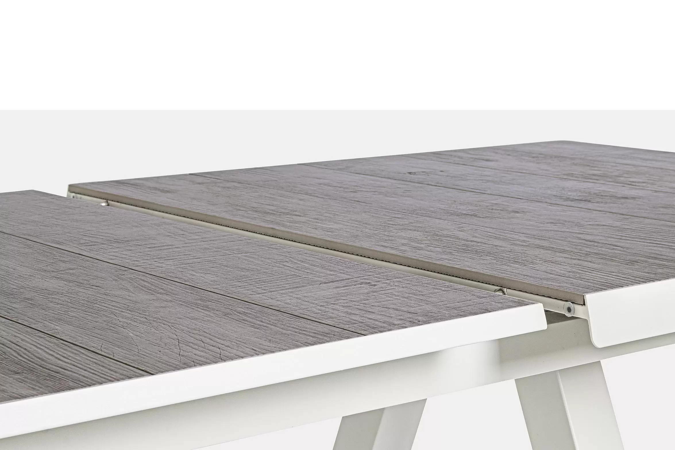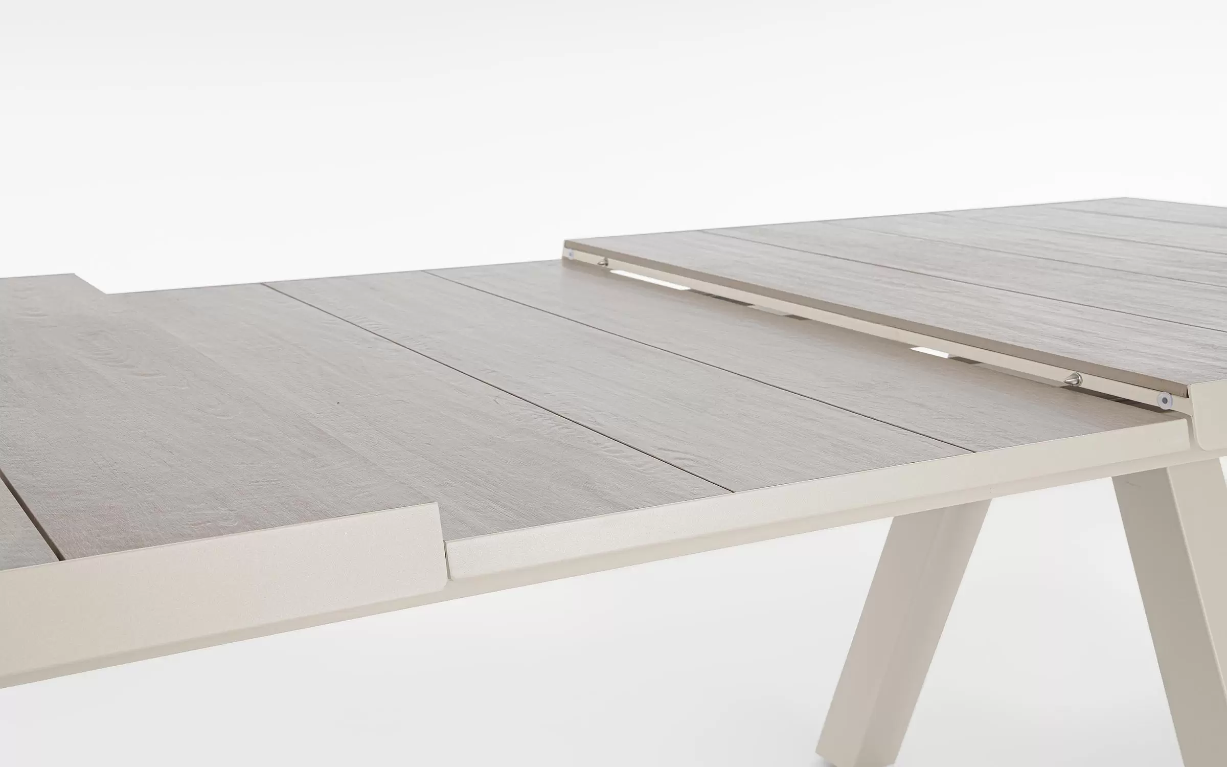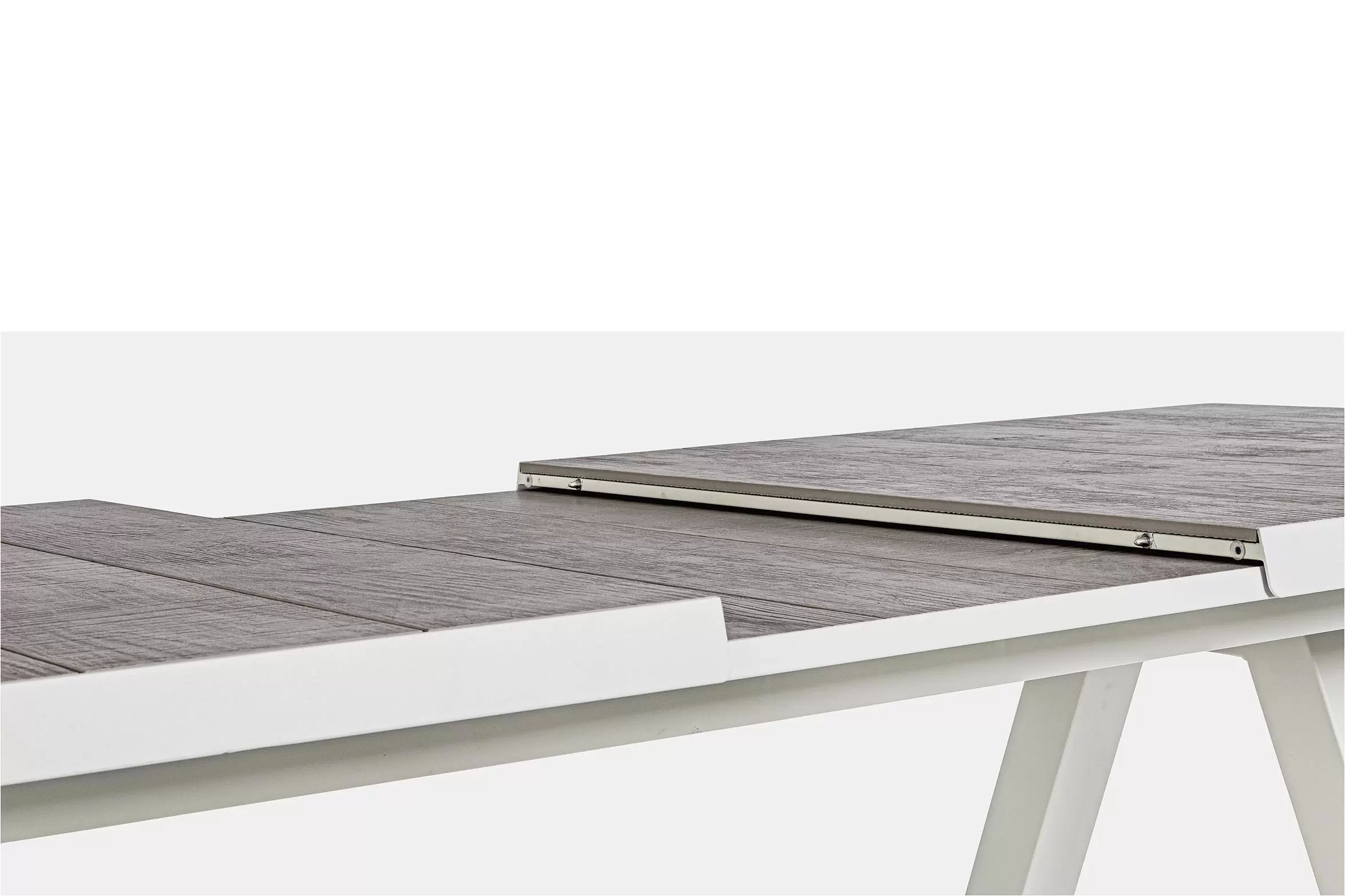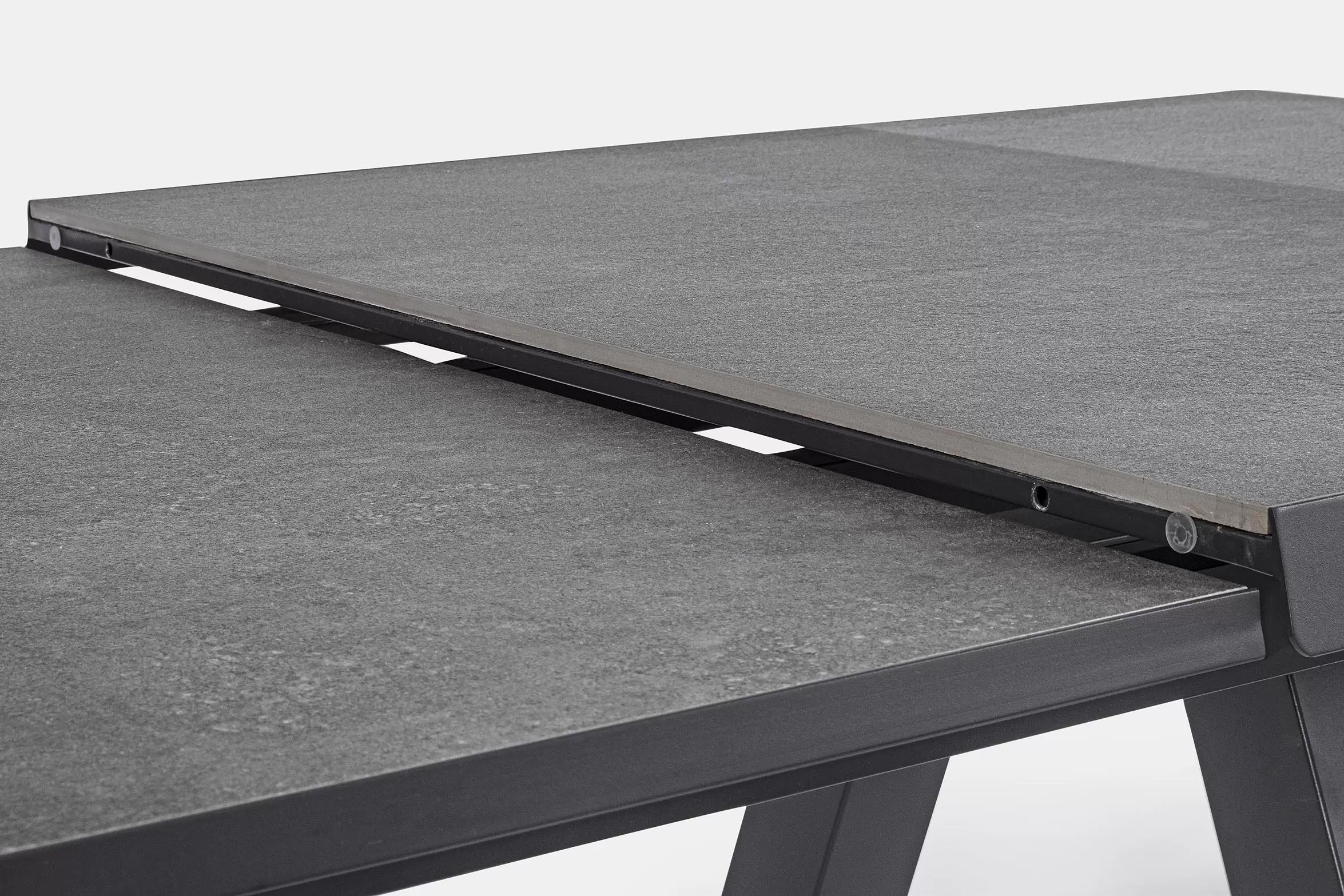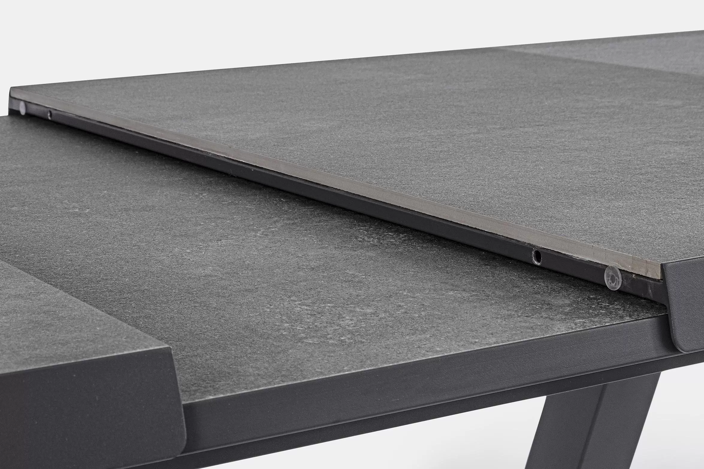 Konstrukcja aluminiowa stołu i mebli malowana proszkowo. System rozkładania automatyczny - rozsuwanie z jednej strony powoduje odsunięcie blatu z drugiej strony. Ponowne pociągnięcie podnosi wstawkę na poziom blatu.