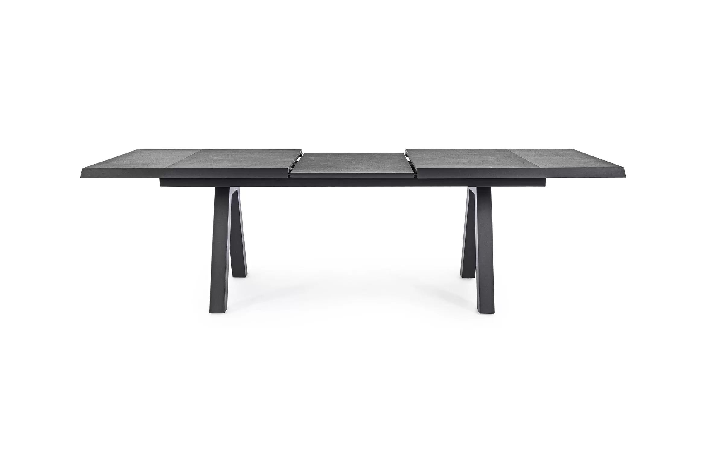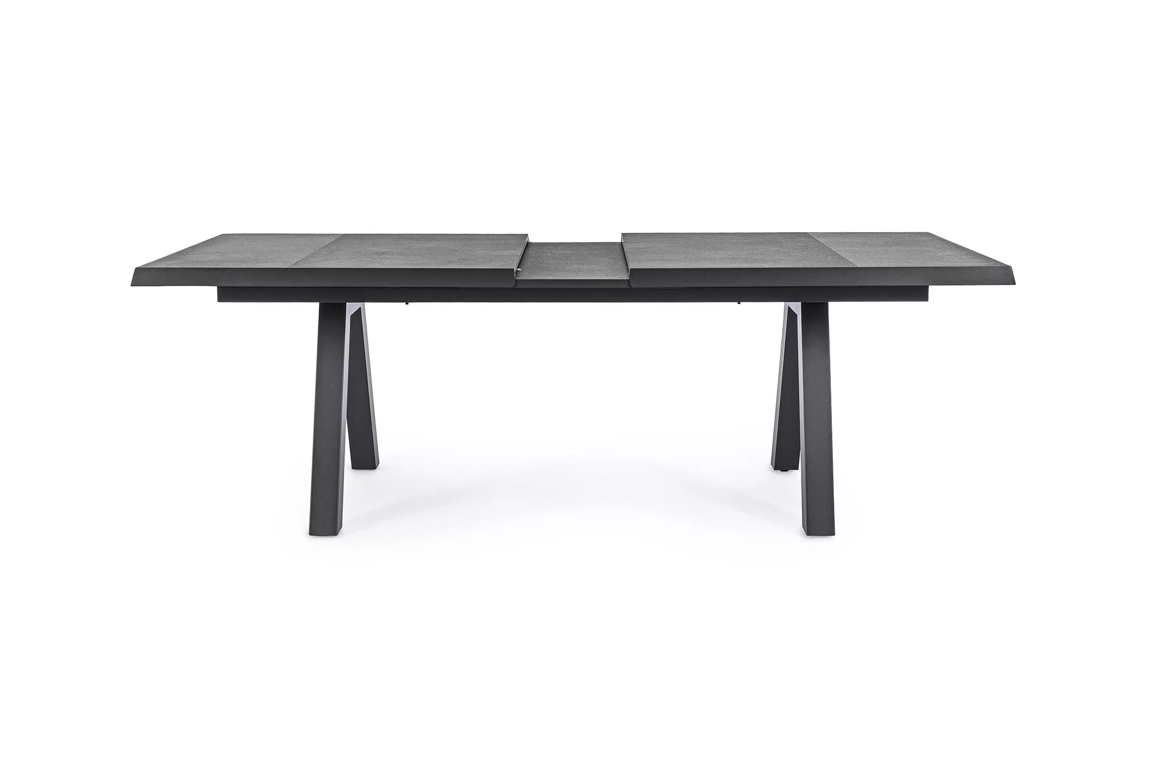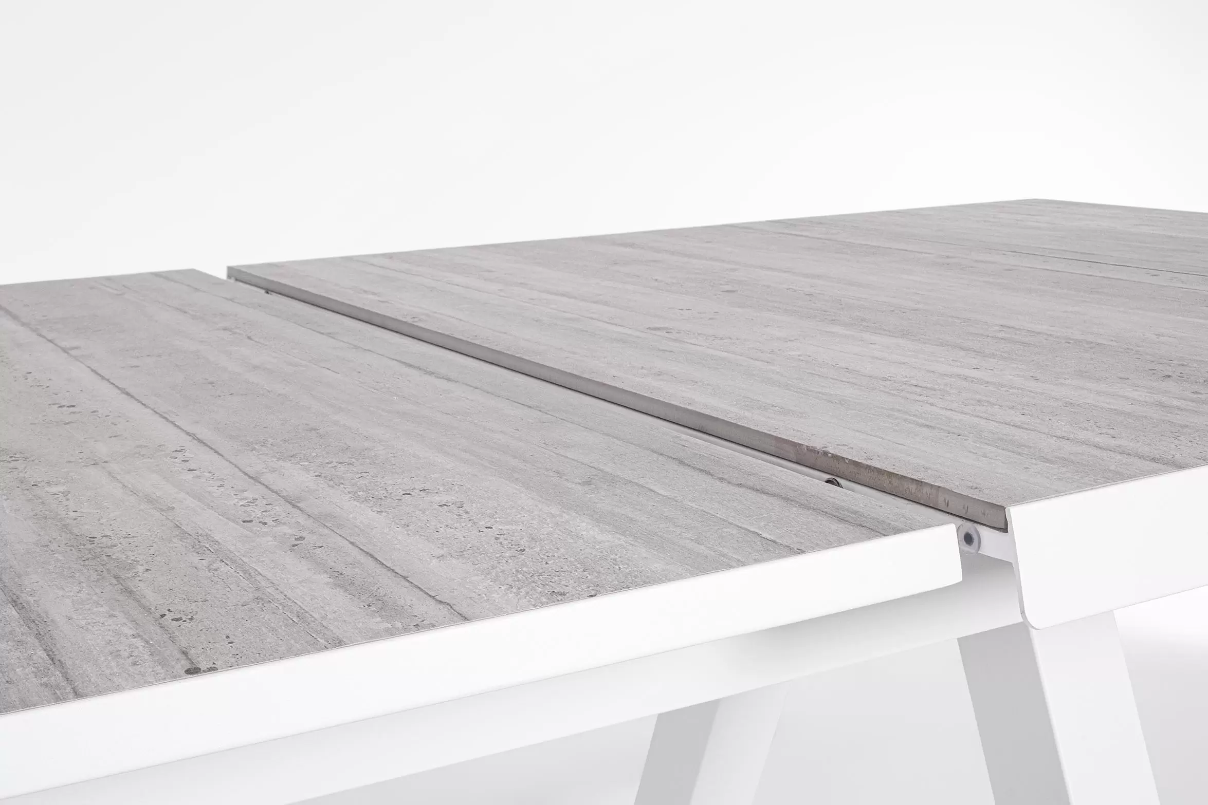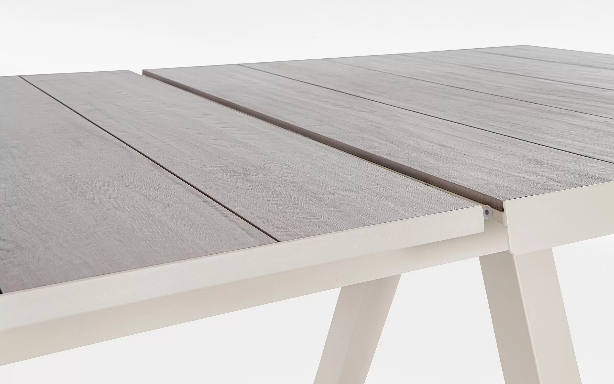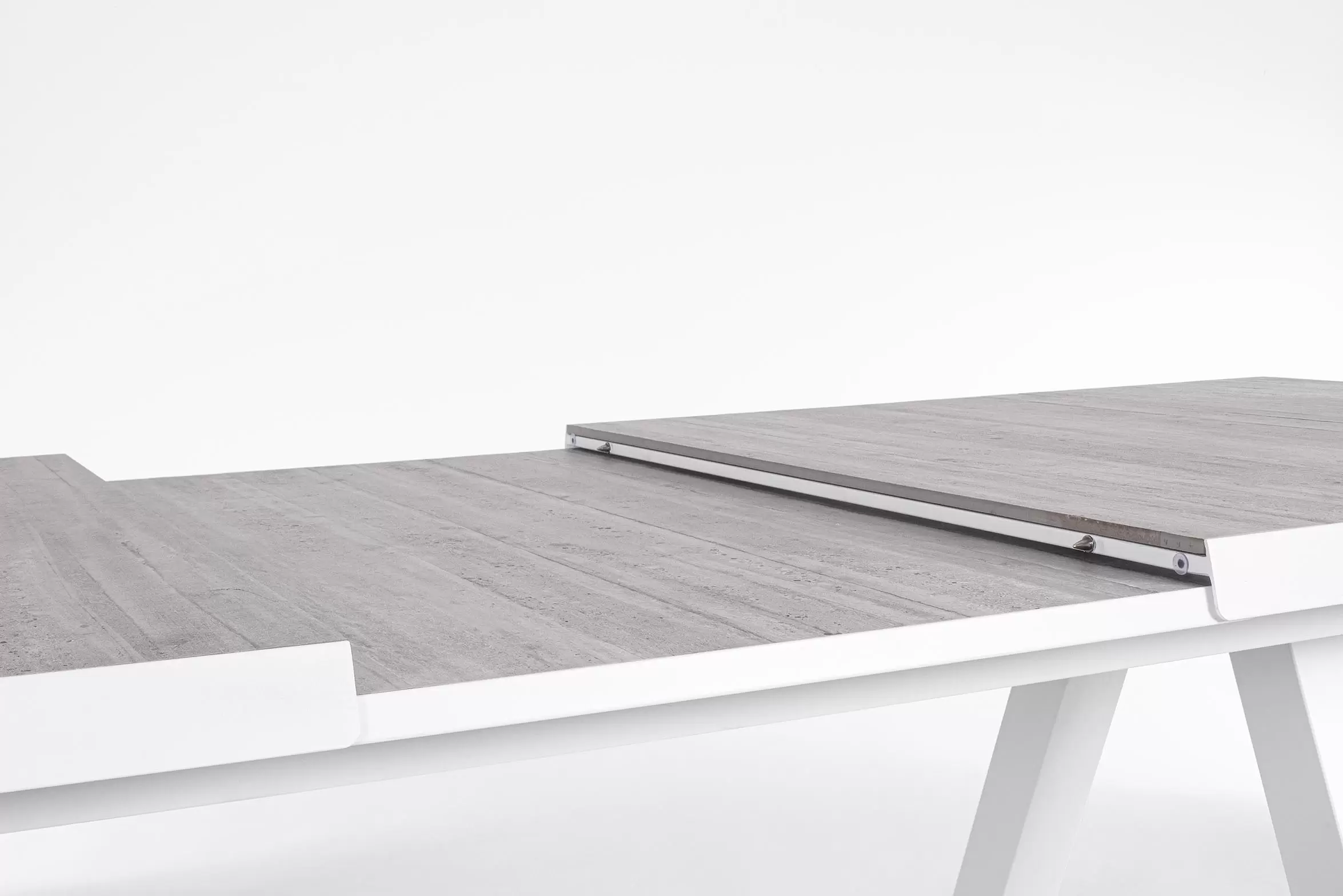 Konstrukcja aluminiowa stołu i mebli malowana proszkowo. System rozkładania automatyczny - rozsuwanie z jednej strony powoduje odsunięcie blatu z drugiej strony. Ponowne pociągnięcie podnosi wstawkę na poziom blatu.