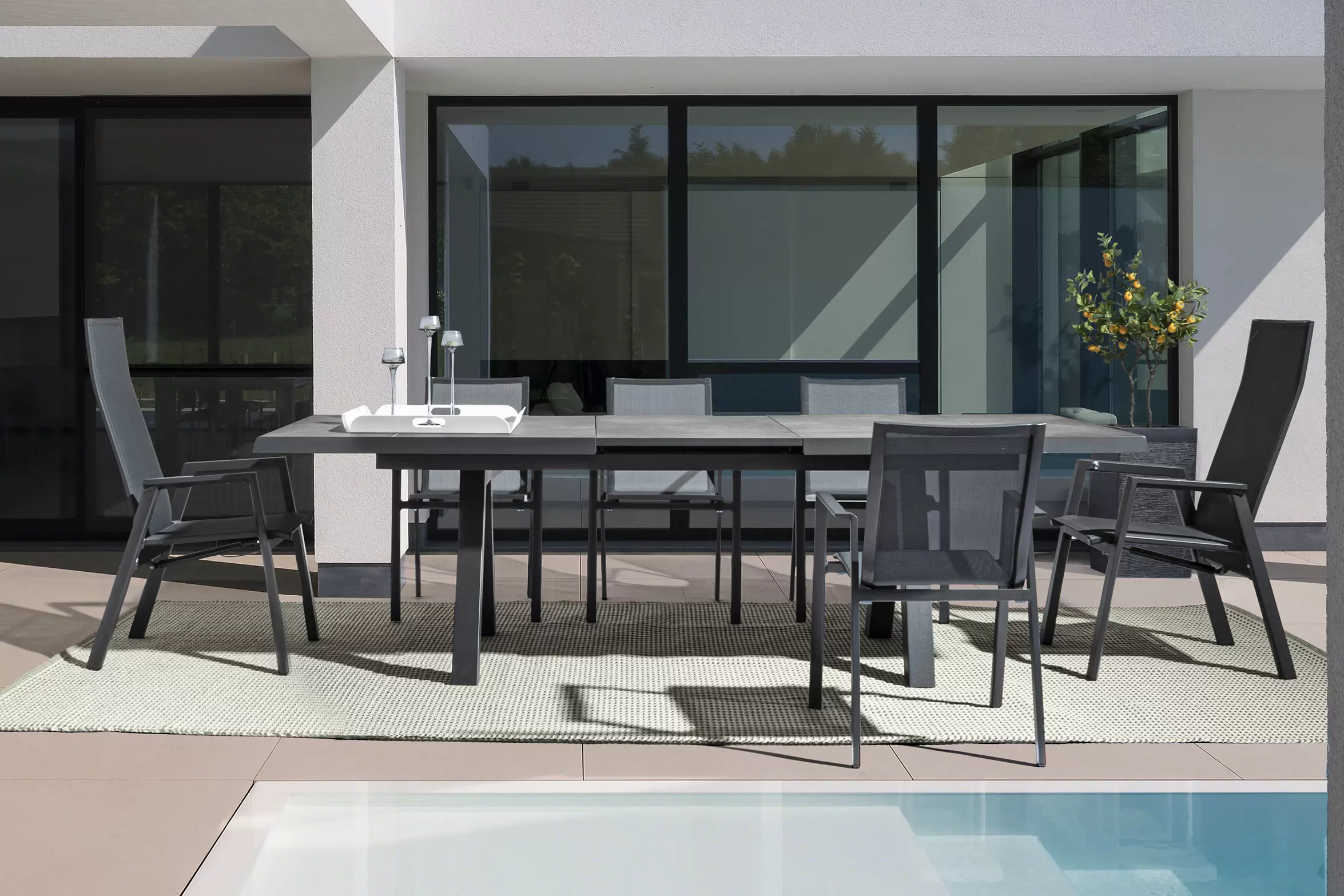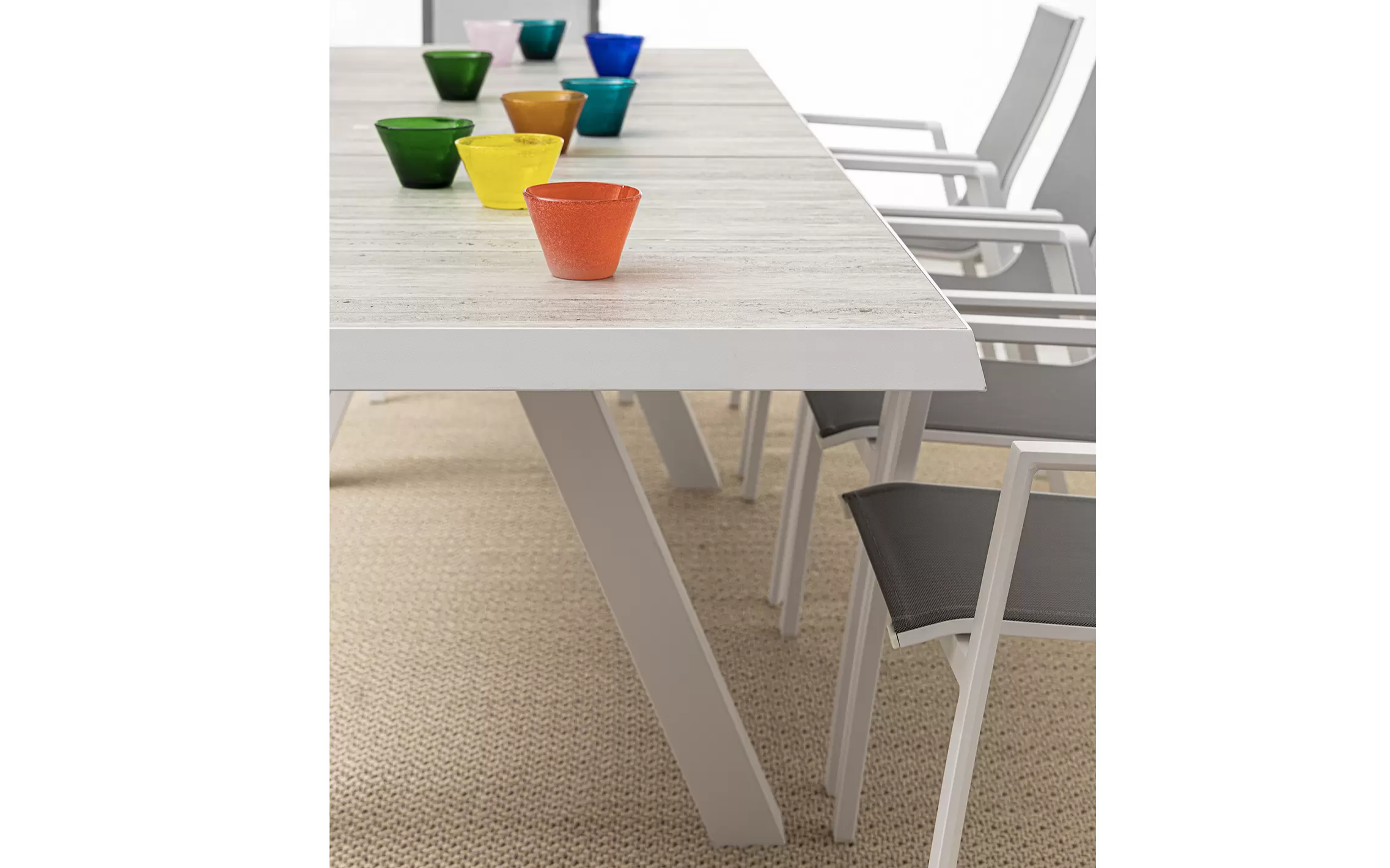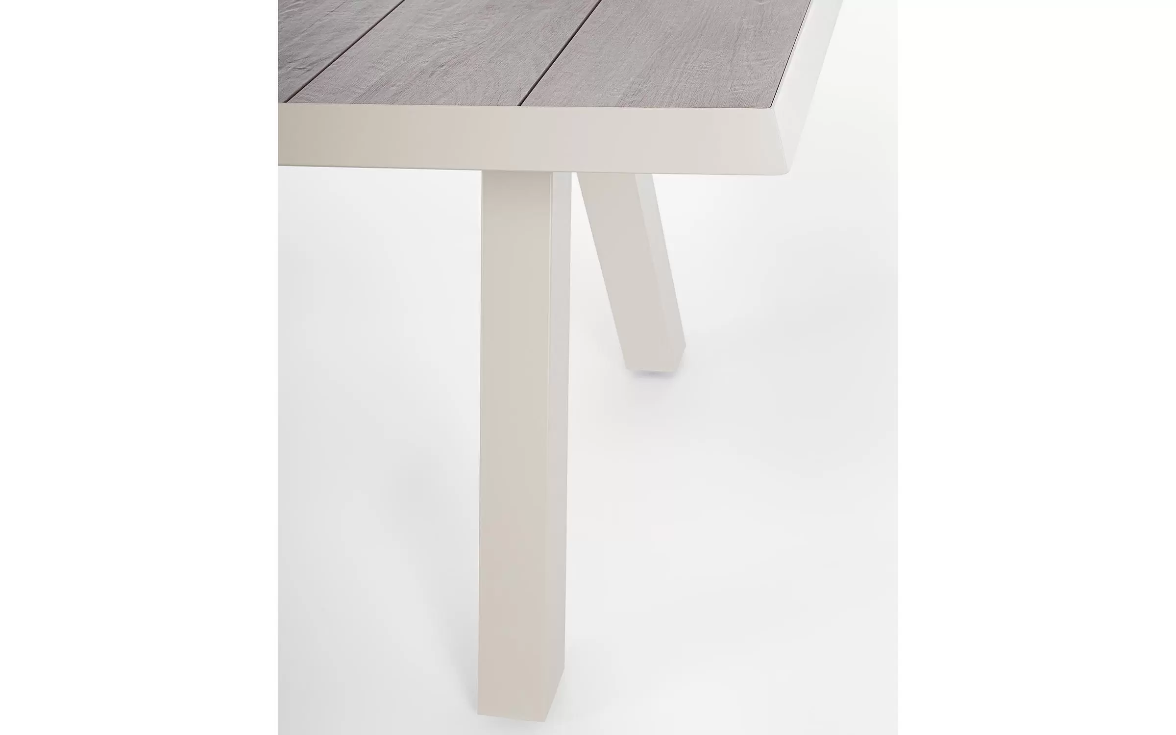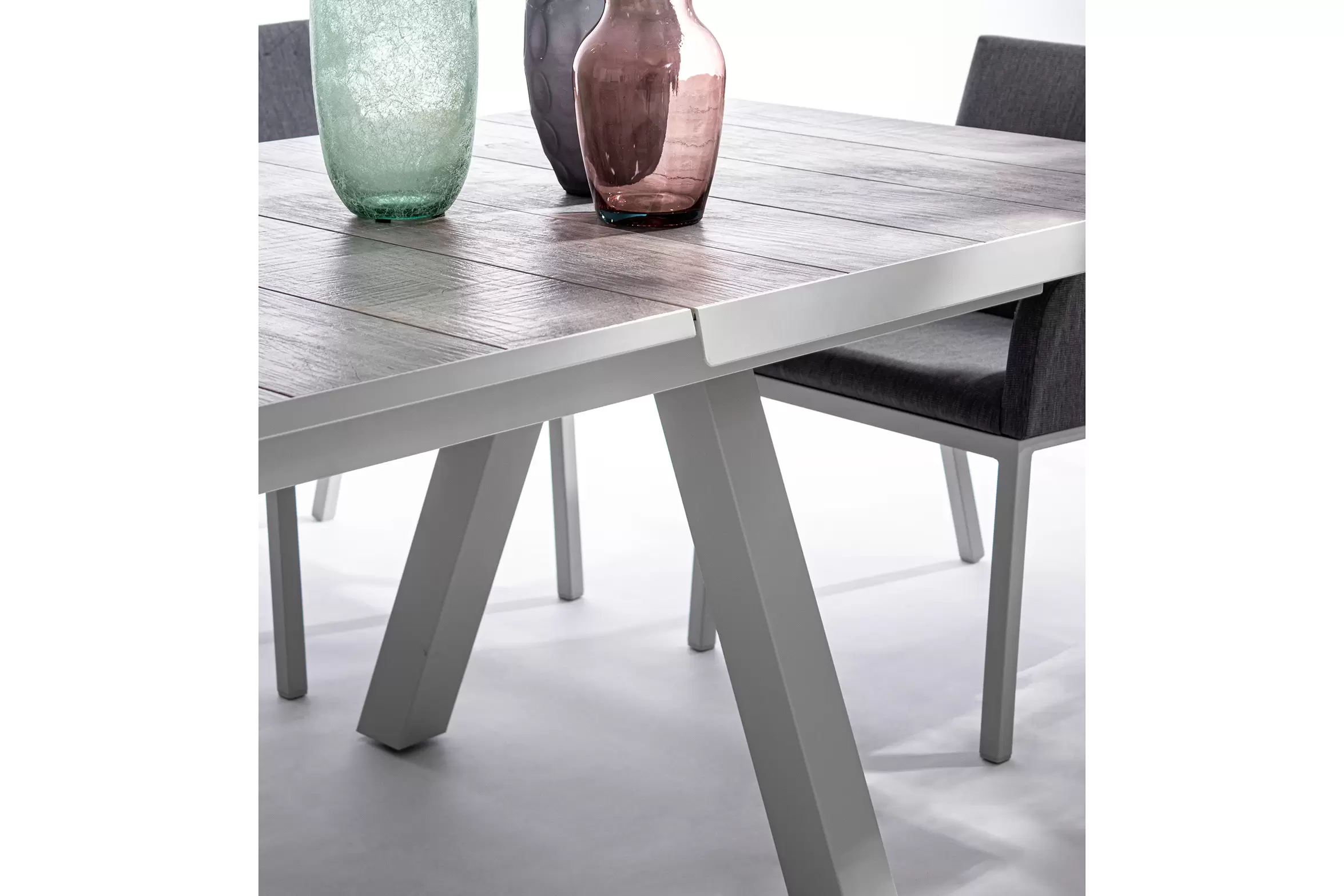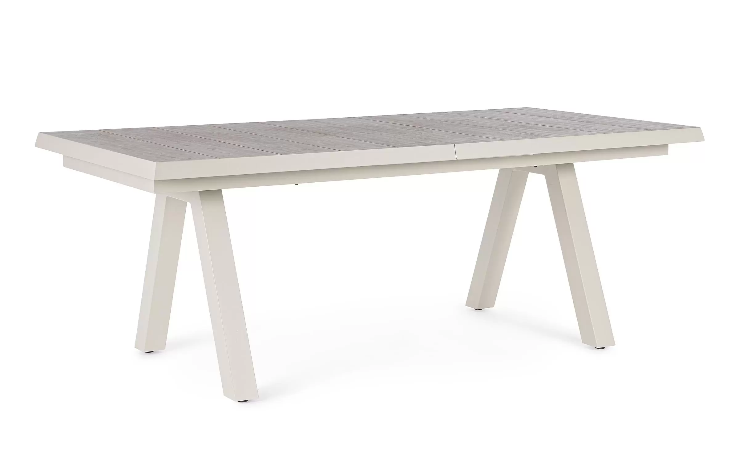 Konstrukcja aluminiowa stołu i mebli malowana proszkowo. System rozkładania automatyczny - rozsuwanie z jednej strony powoduje odsunięcie blatu z drugiej strony. Ponowne pociągnięcie podnosi wstawkę na poziom blatu.