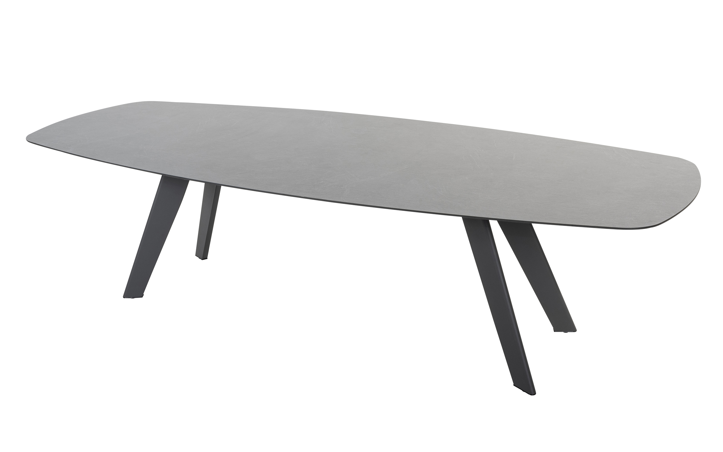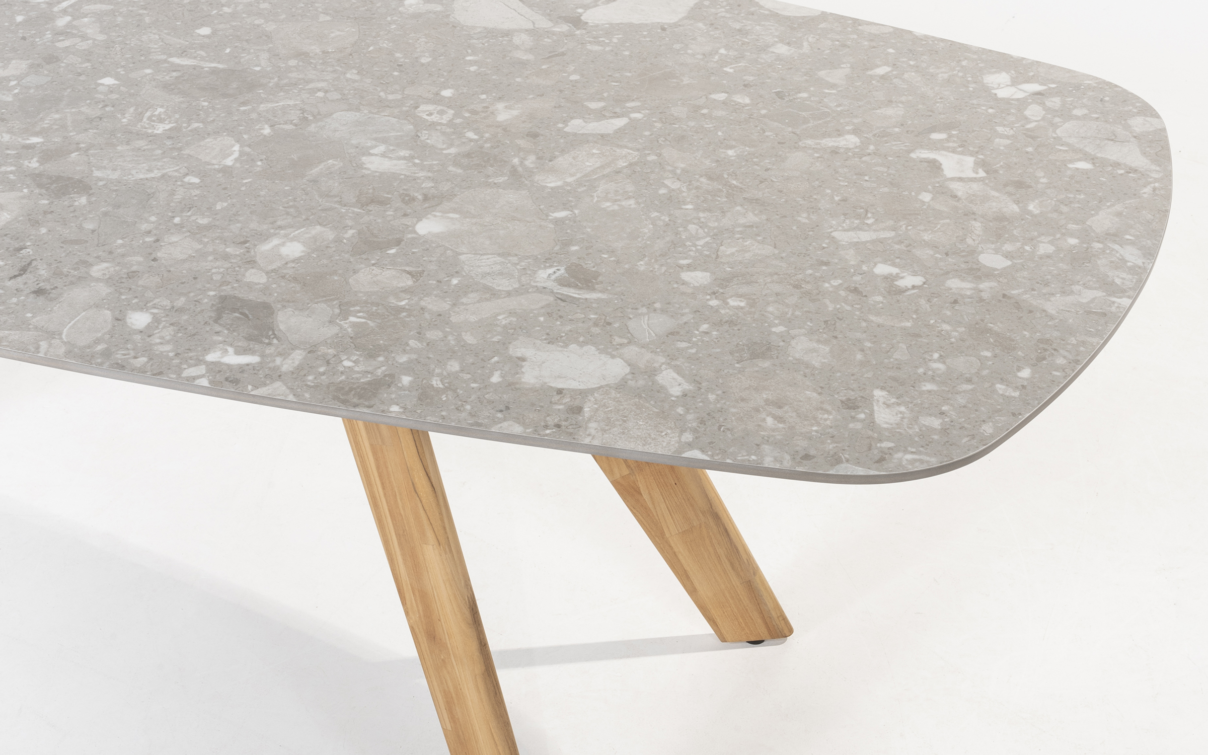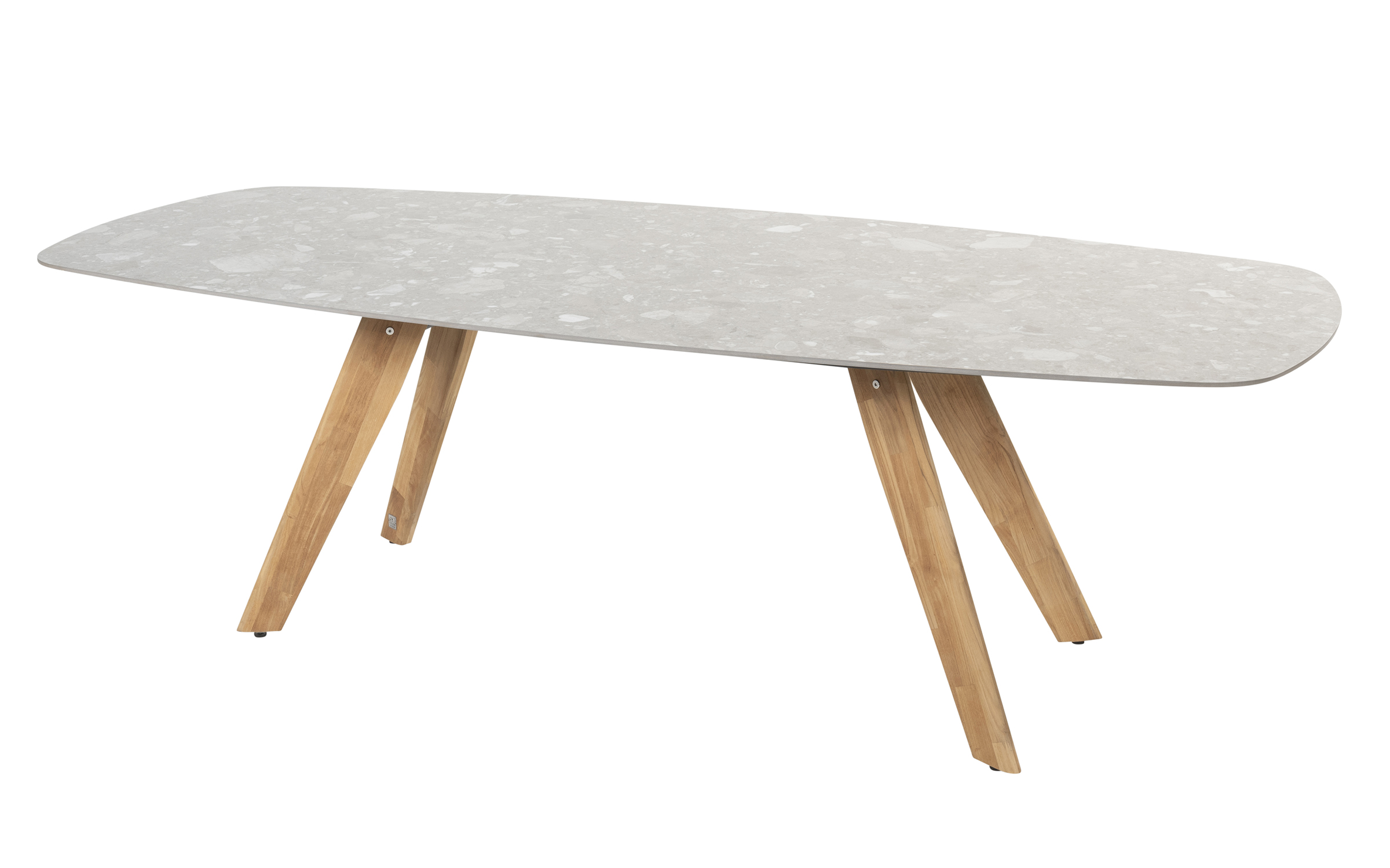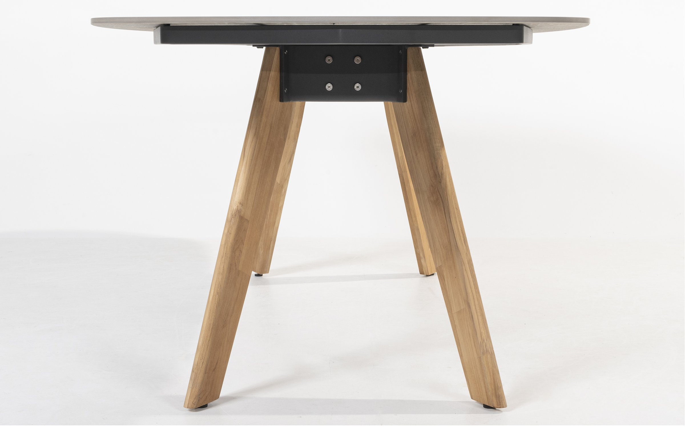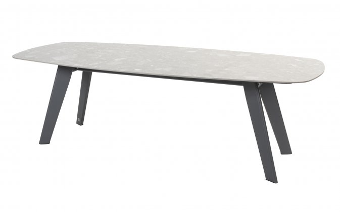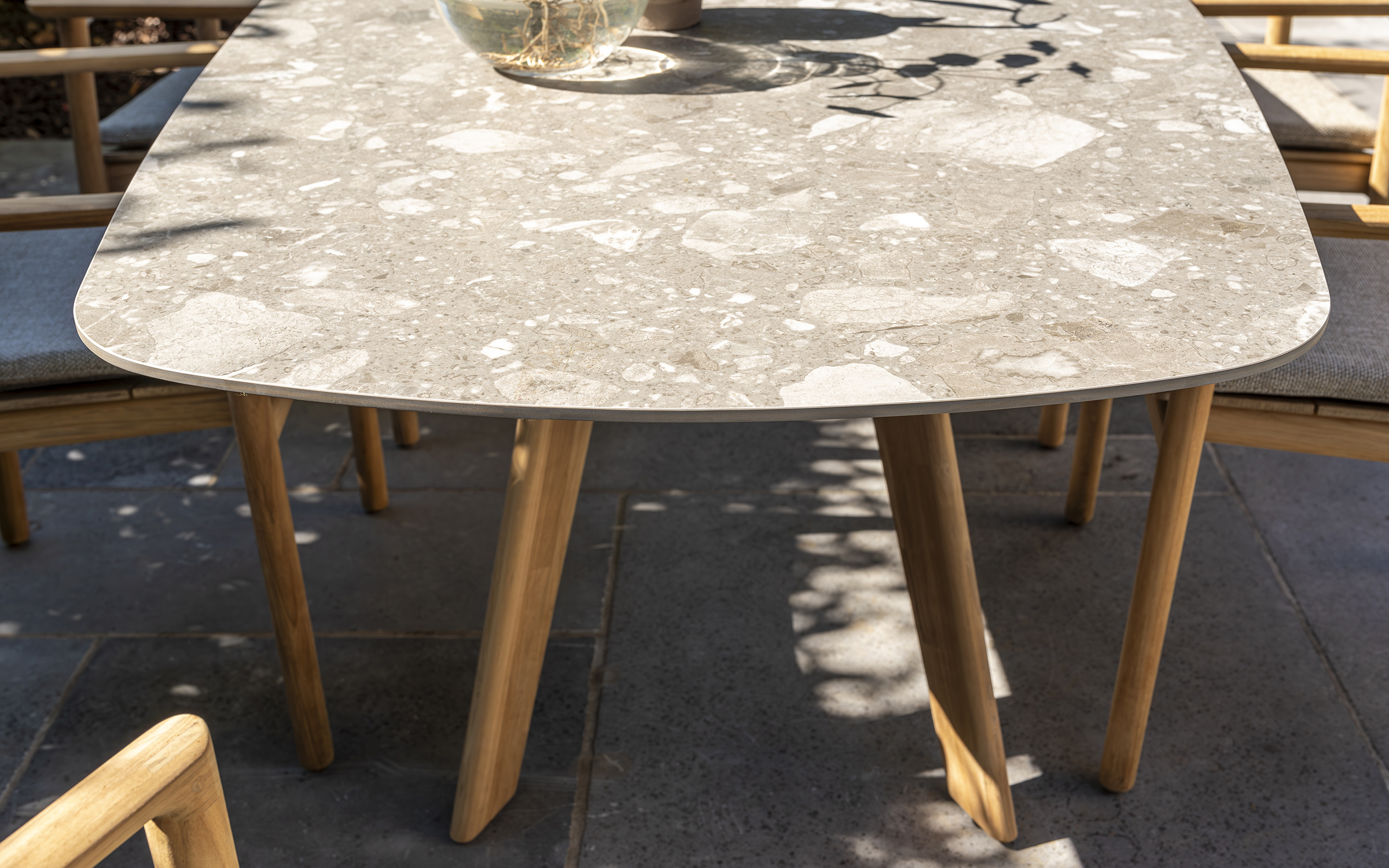 Stół 4 Seasons Outdoor Montana z blatem ceramiczym o wymiarach 240 x 103 cm odporny na warunki atmosferyczne stół ma solidną i trwałą podstawę ze stali nierdzewnej lub z drewna teakowego oraz blat z ceramiki w kształcie "beczki".