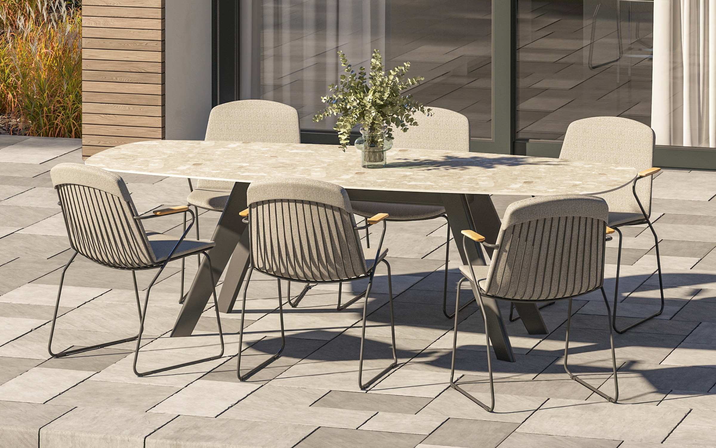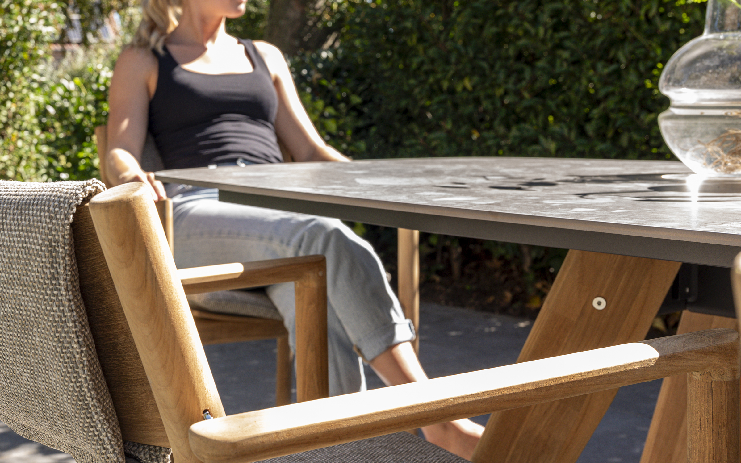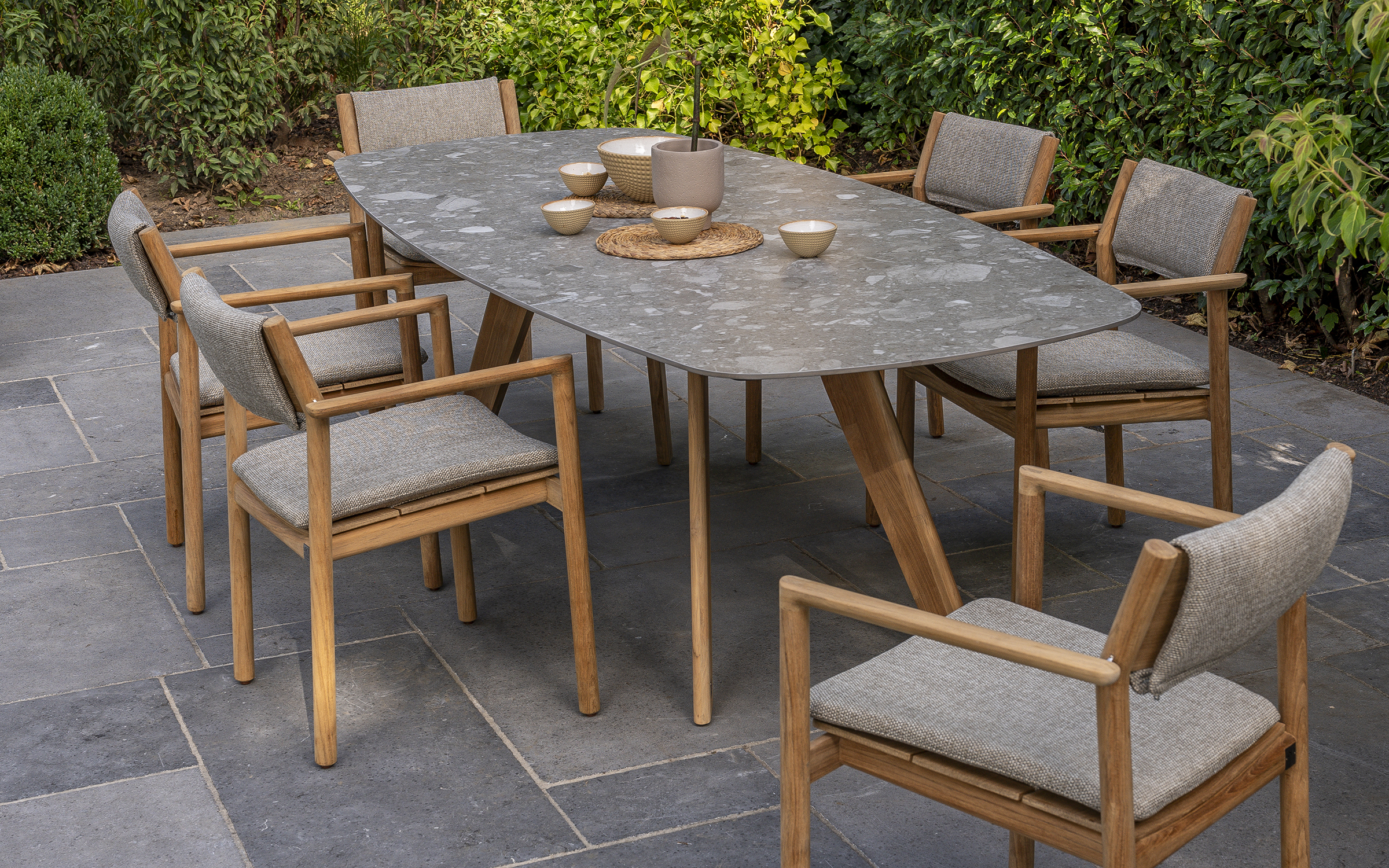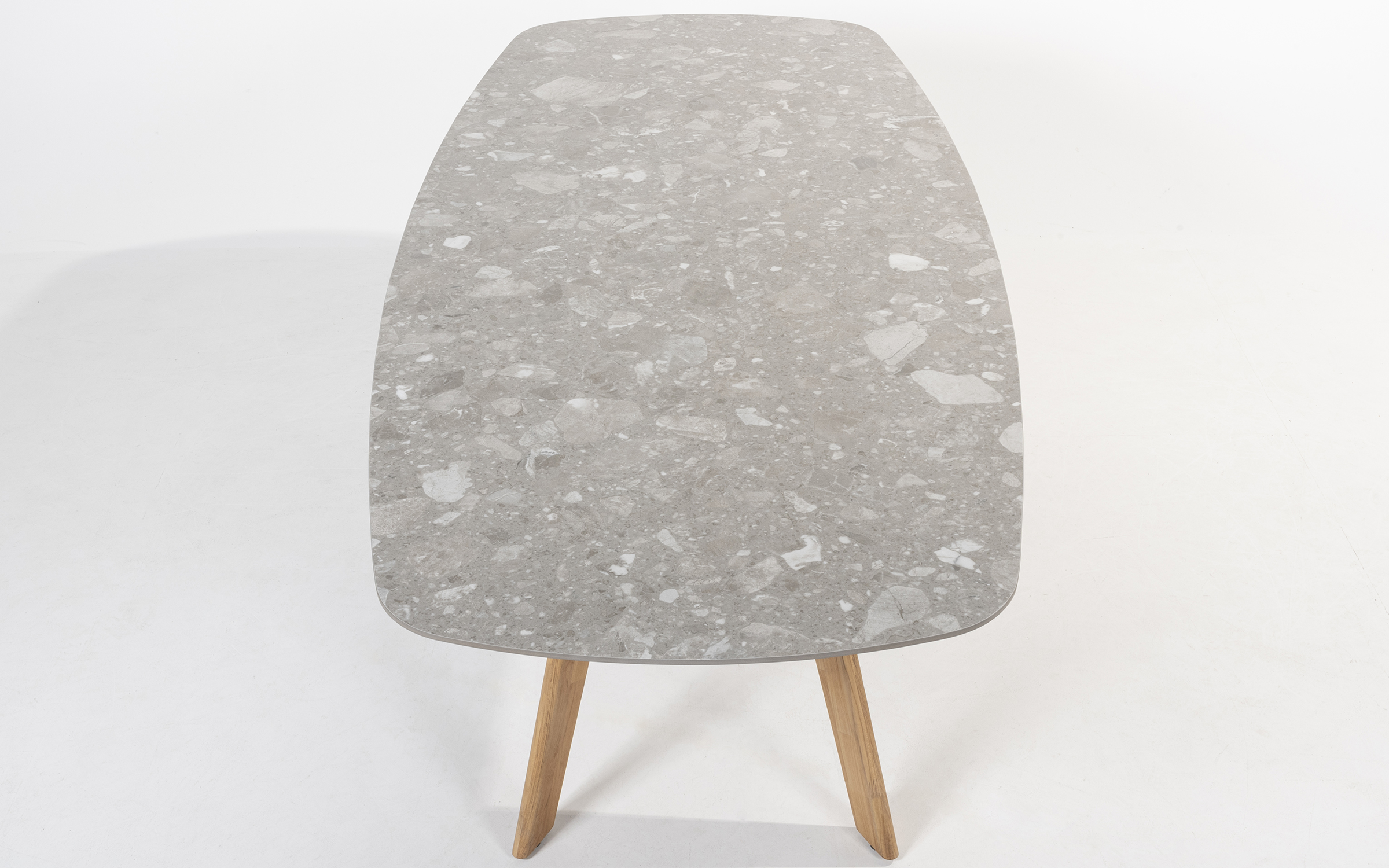 Stół 4 Seasons Outdoor Montana z blatem ceramiczym o wymiarach 240 x 103 cm odporny na warunki atmosferyczne stół ma solidną i trwałą podstawę ze stali nierdzewnej lub z drewna teakowego oraz blat z ceramiki w kształcie "beczki".