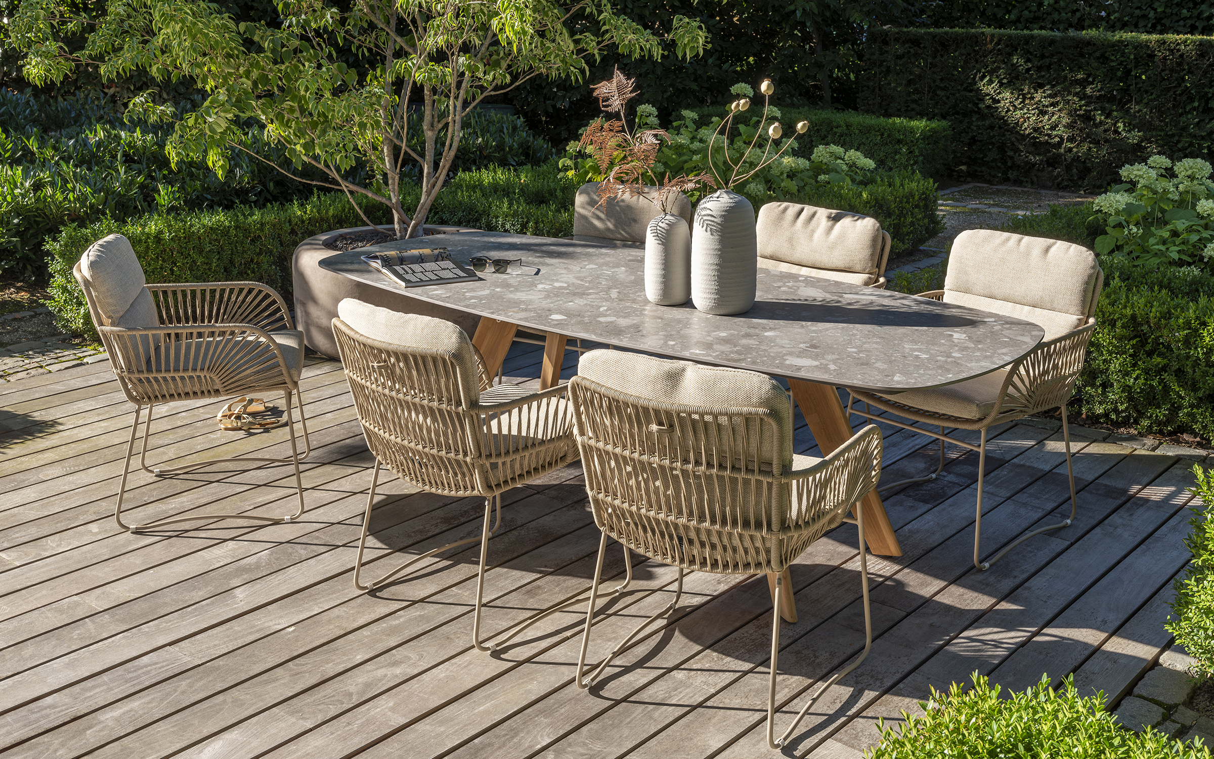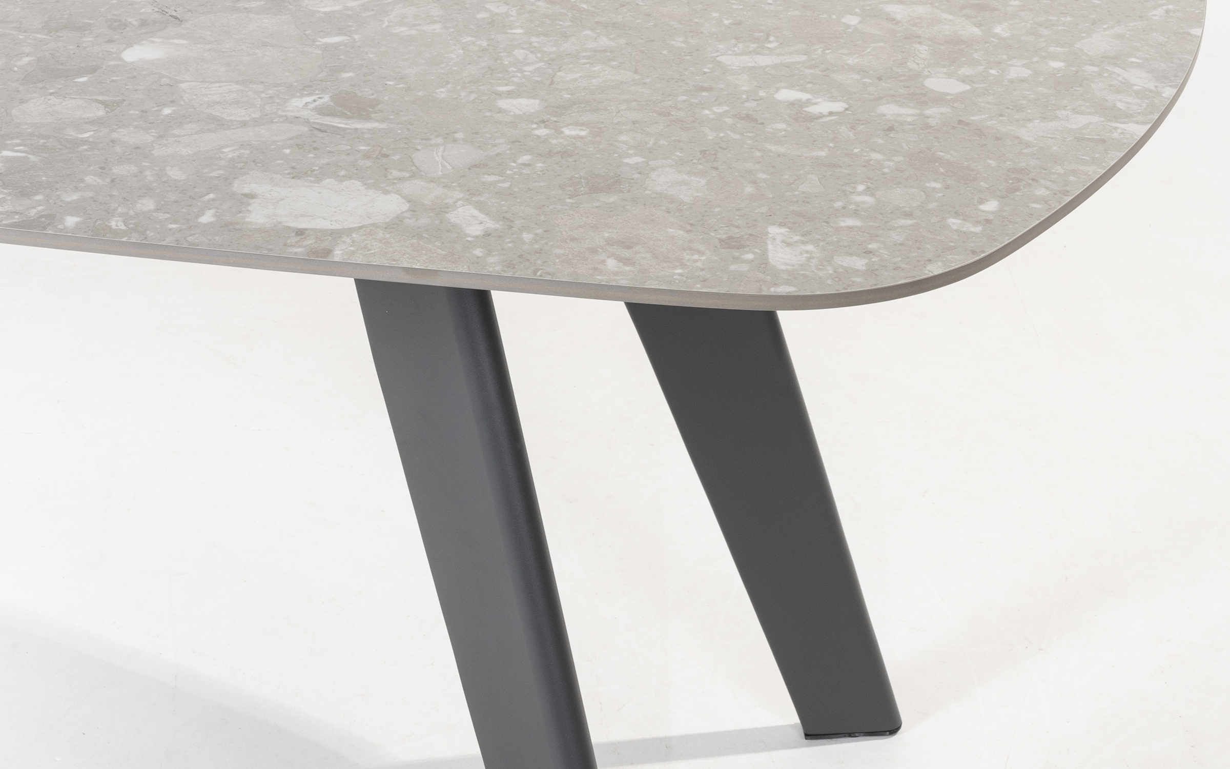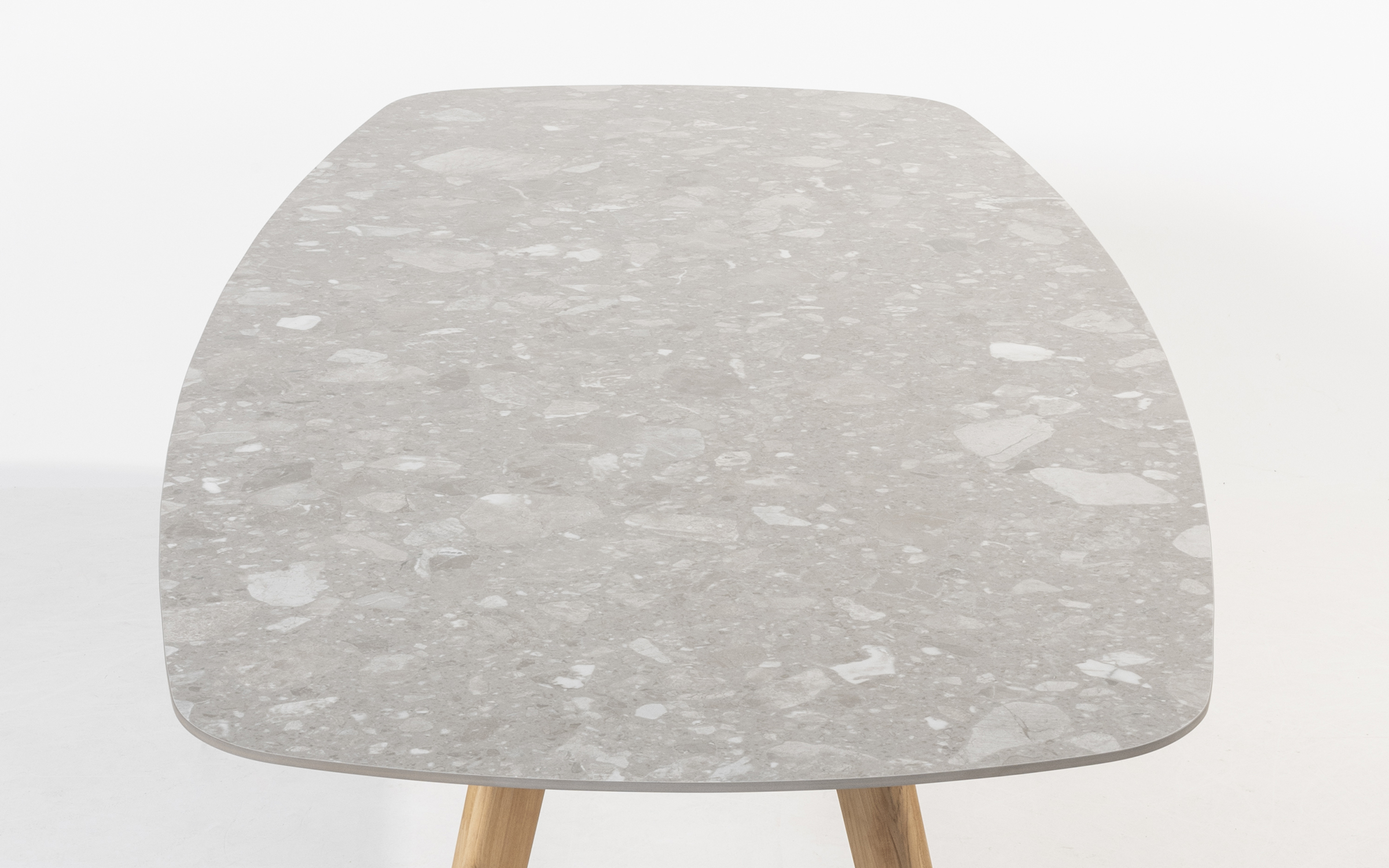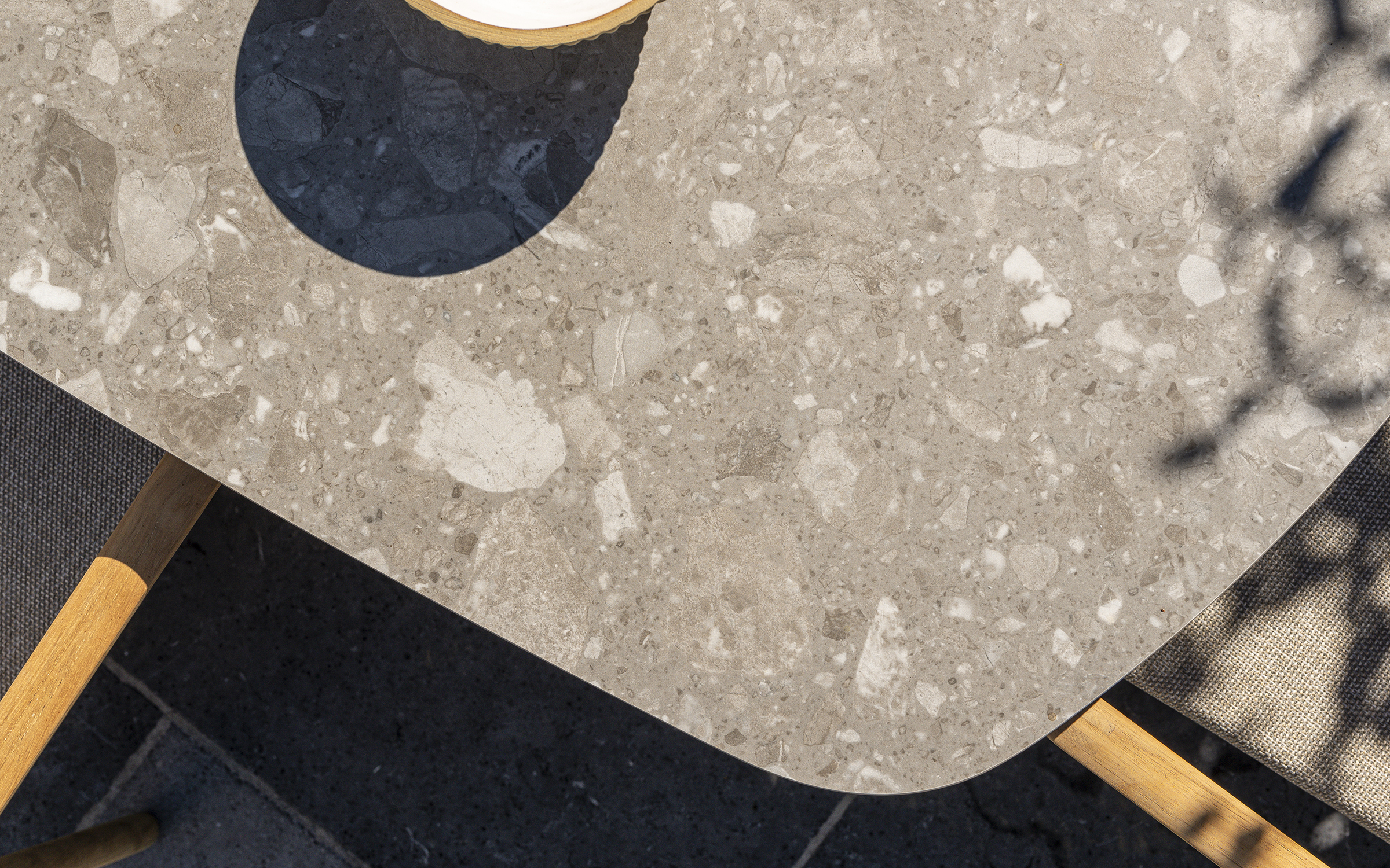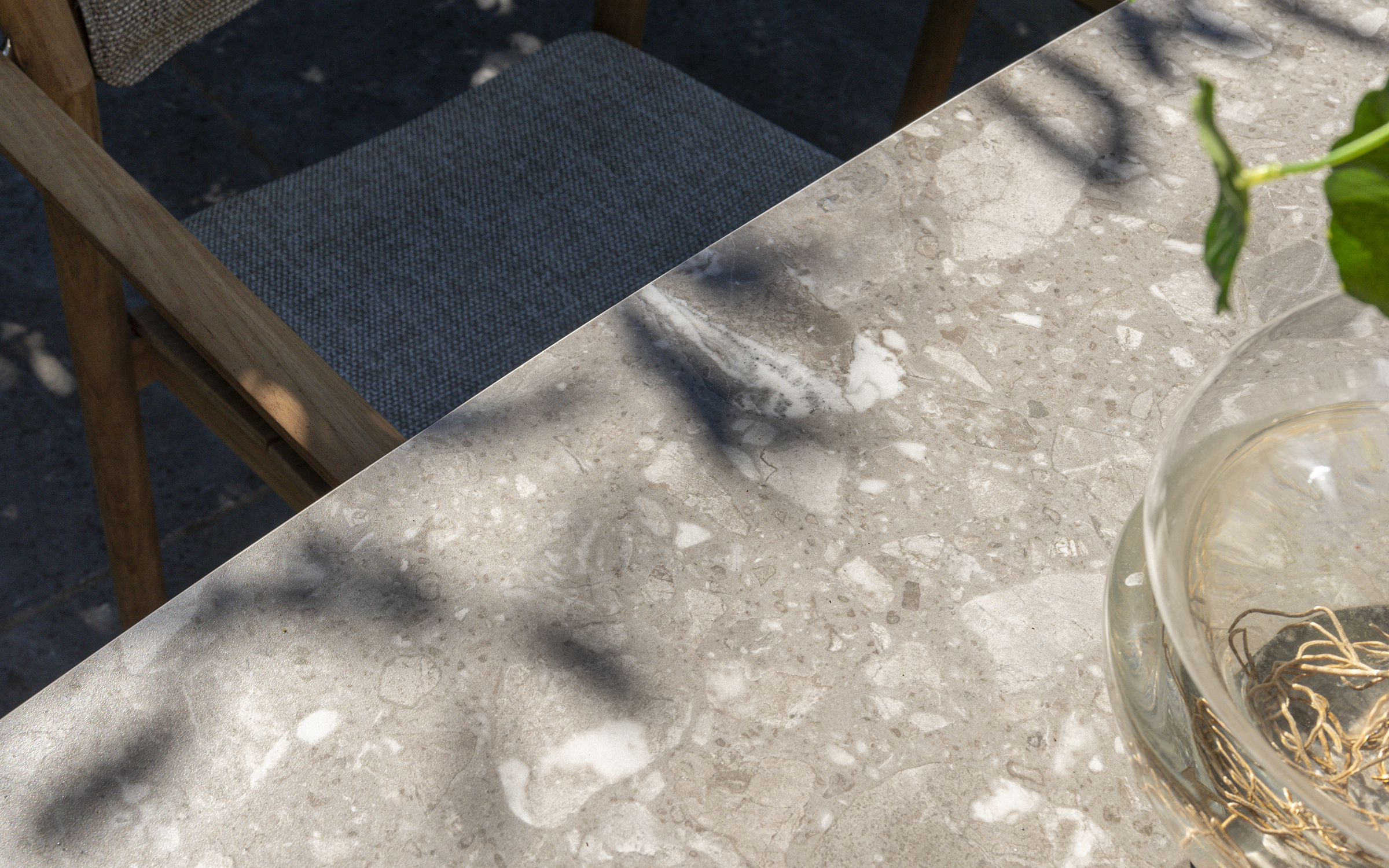 Stół 4 Seasons Outdoor Montana z blatem ceramiczym o wymiarach 240 x 103 cm odporny na warunki atmosferyczne stół ma solidną i trwałą podstawę ze stali nierdzewnej lub z drewna teakowego oraz blat z ceramiki w kształcie "beczki".