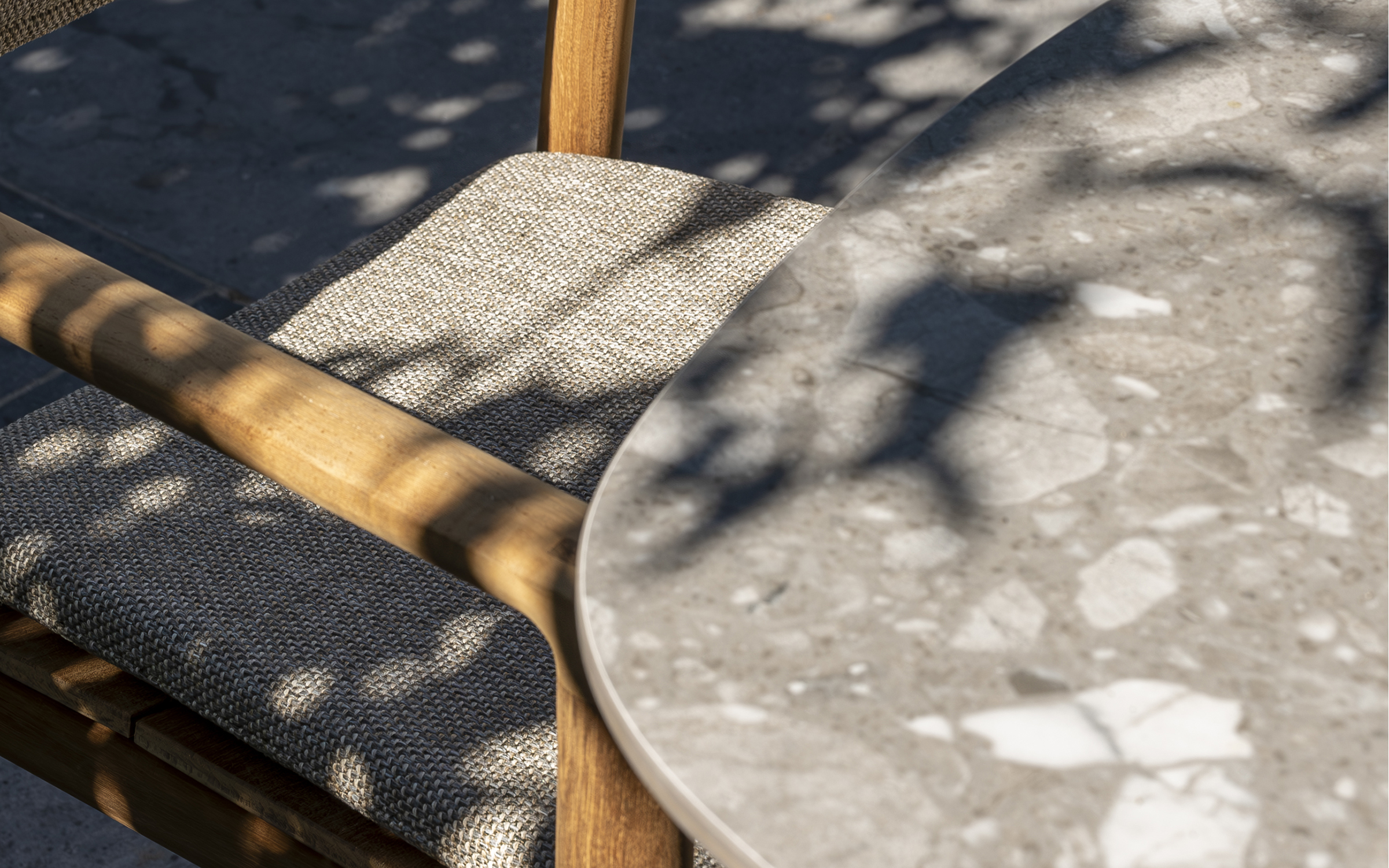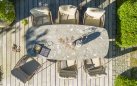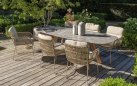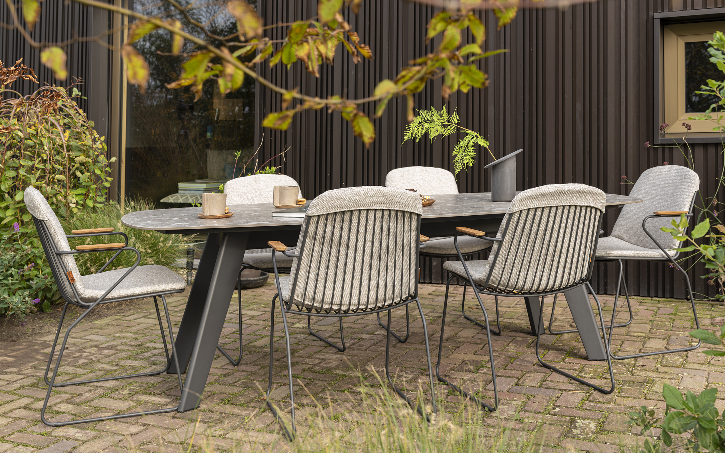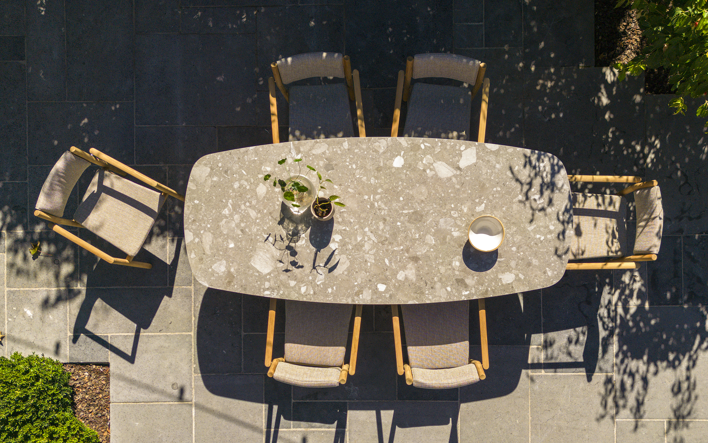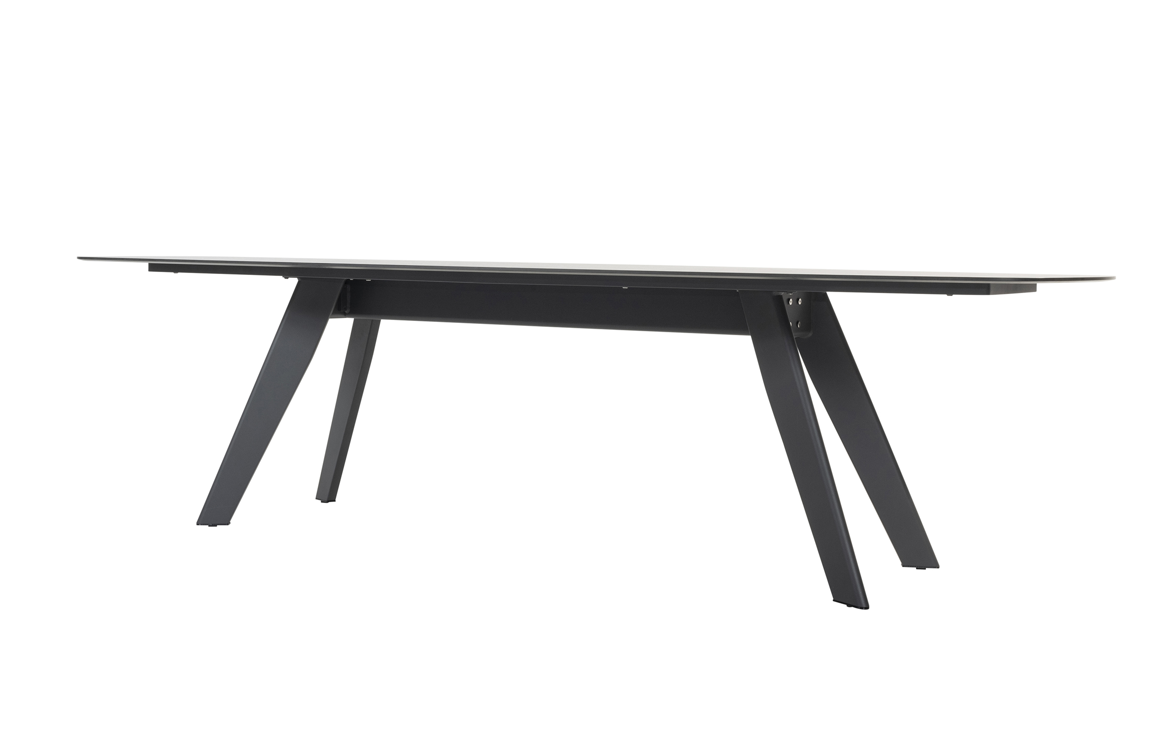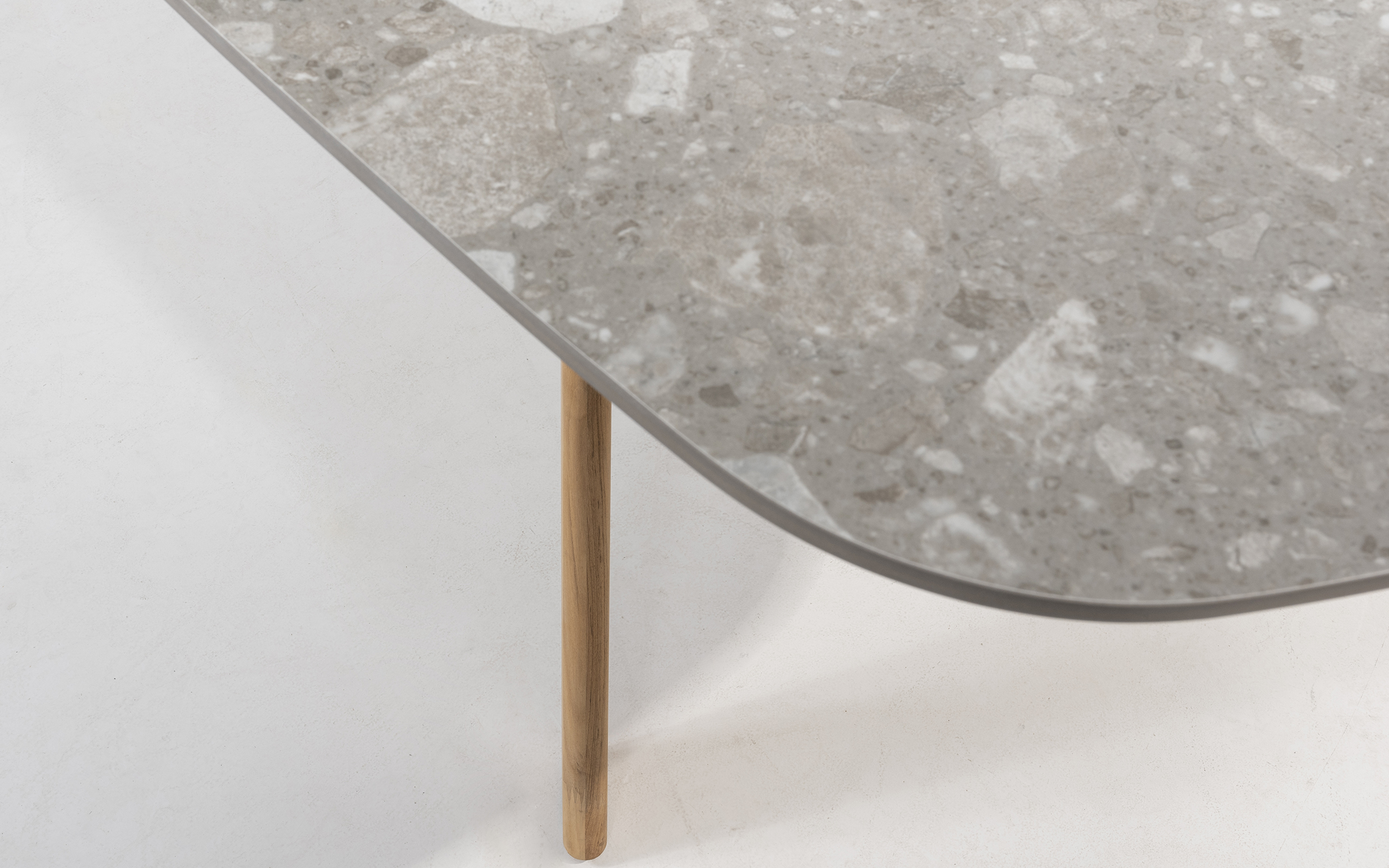 Stół 4 Seasons Outdoor Montana z blatem ceramiczym o wymiarach 240 x 103 cm odporny na warunki atmosferyczne stół ma solidną i trwałą podstawę ze stali nierdzewnej lub z drewna teakowego oraz blat z ceramiki w kształcie "beczki".