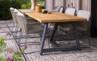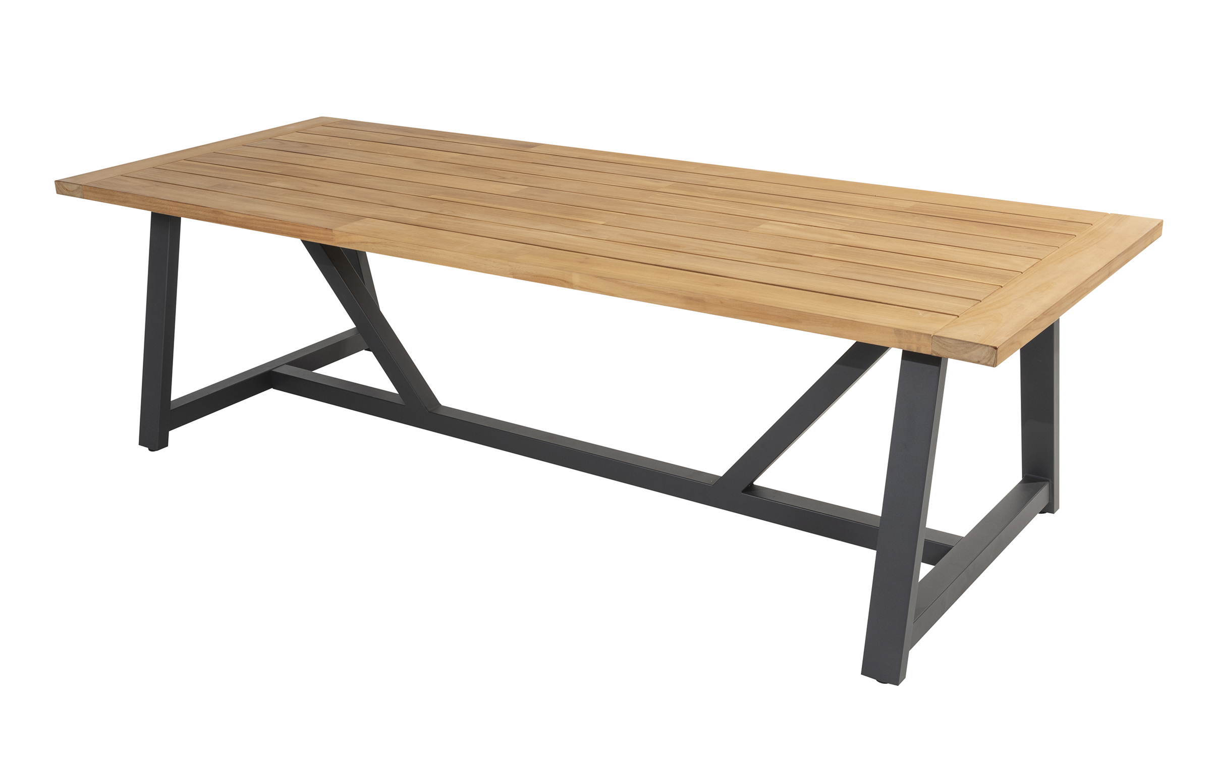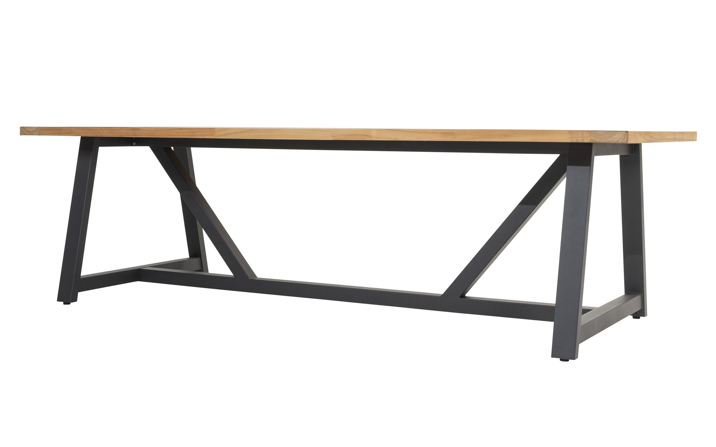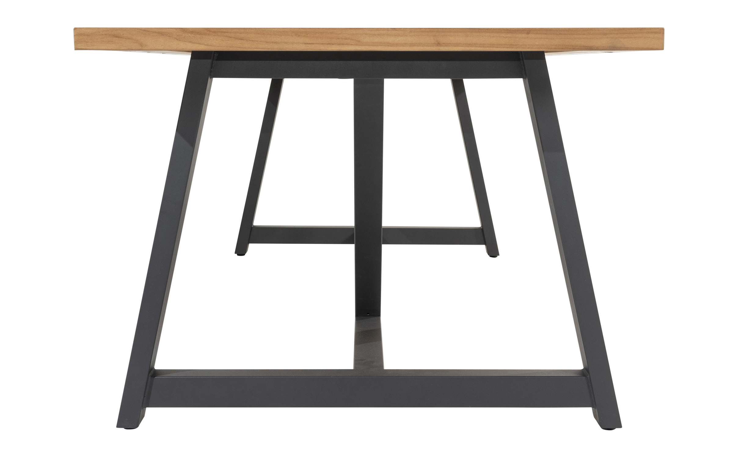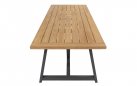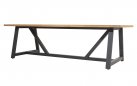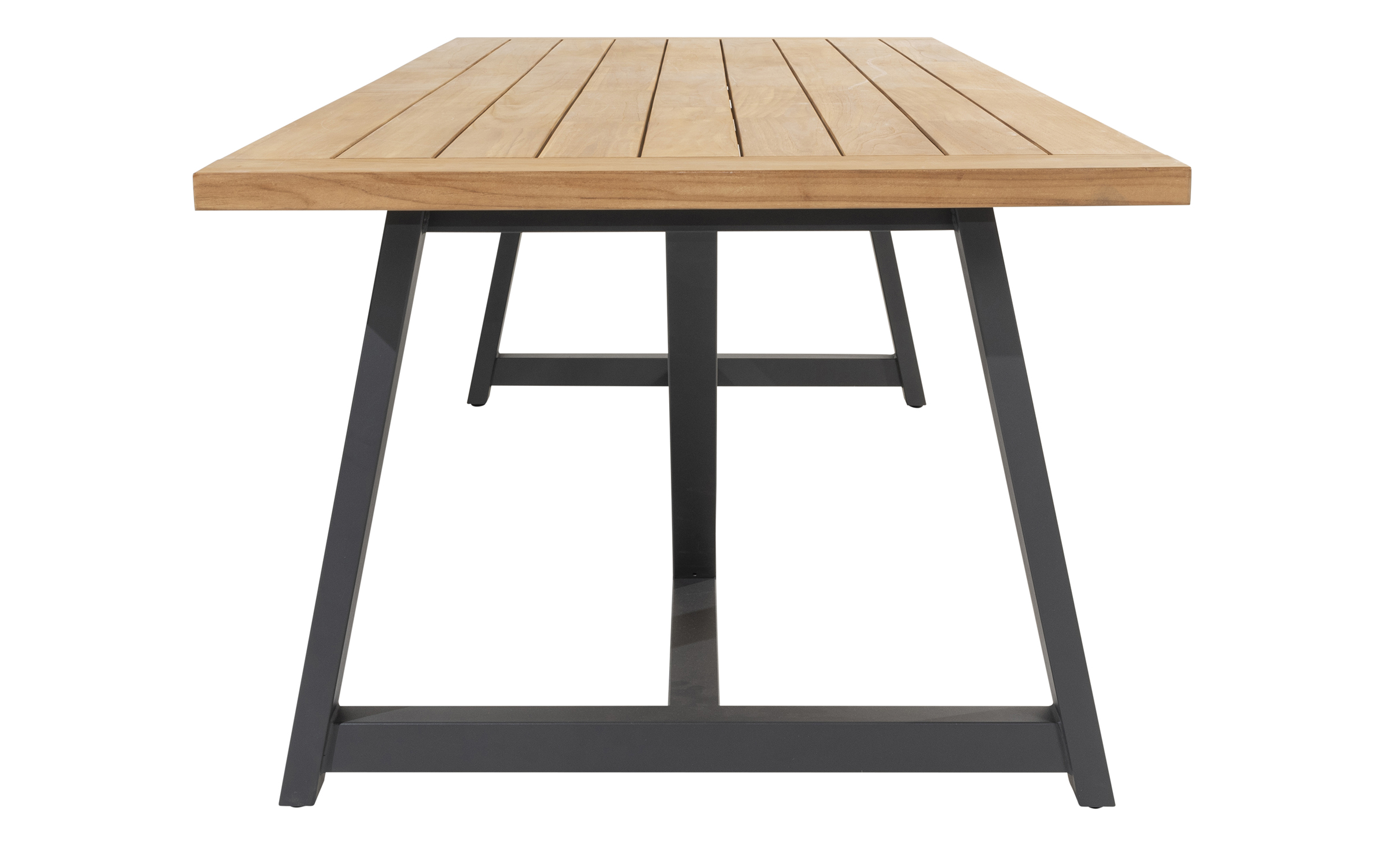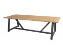 Stół ma podstawę ze stali nierdzewnej malowanej proszkowo z dużym blatem z drewna tekowego o wymiarach 260 x 100 cm na górze.
