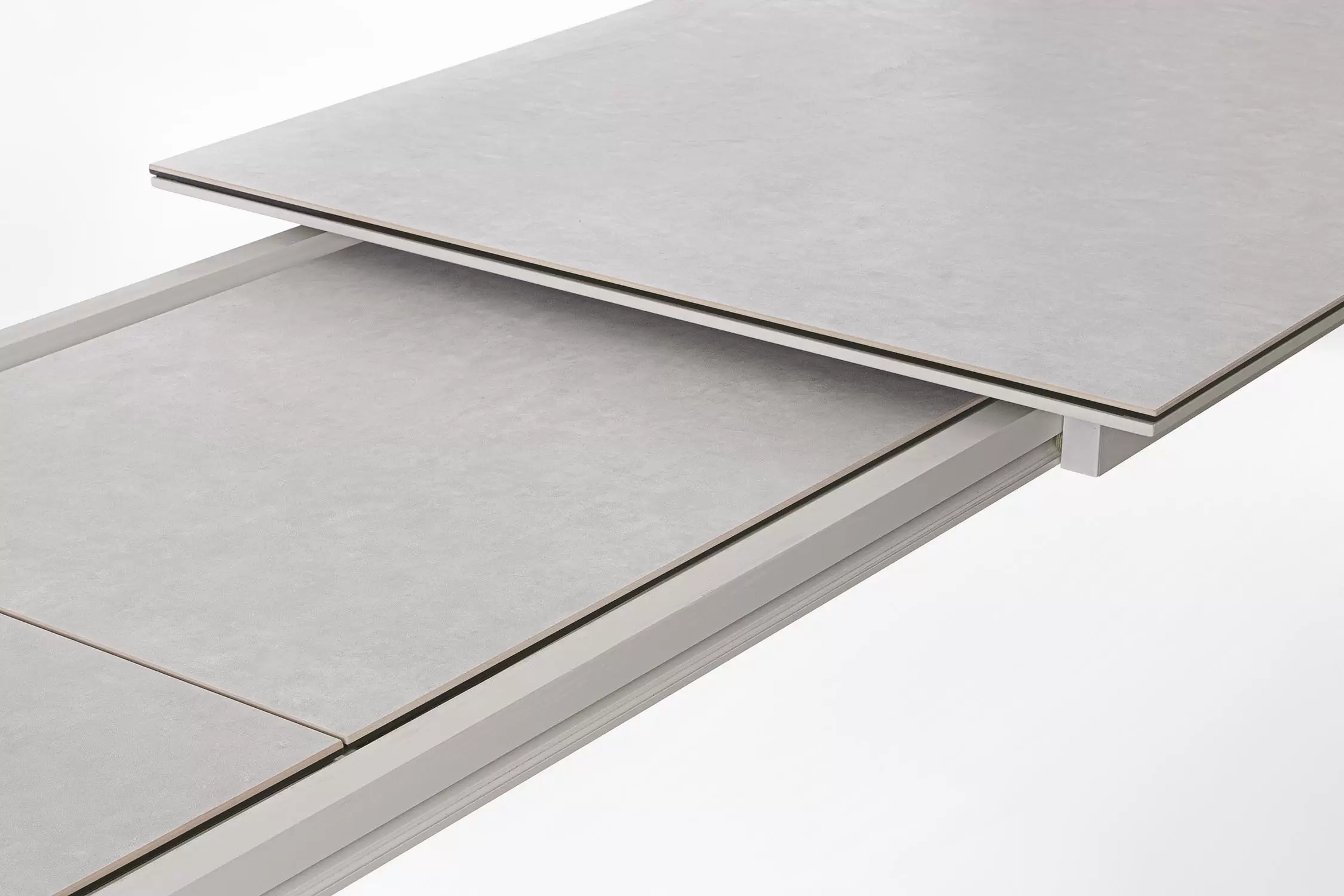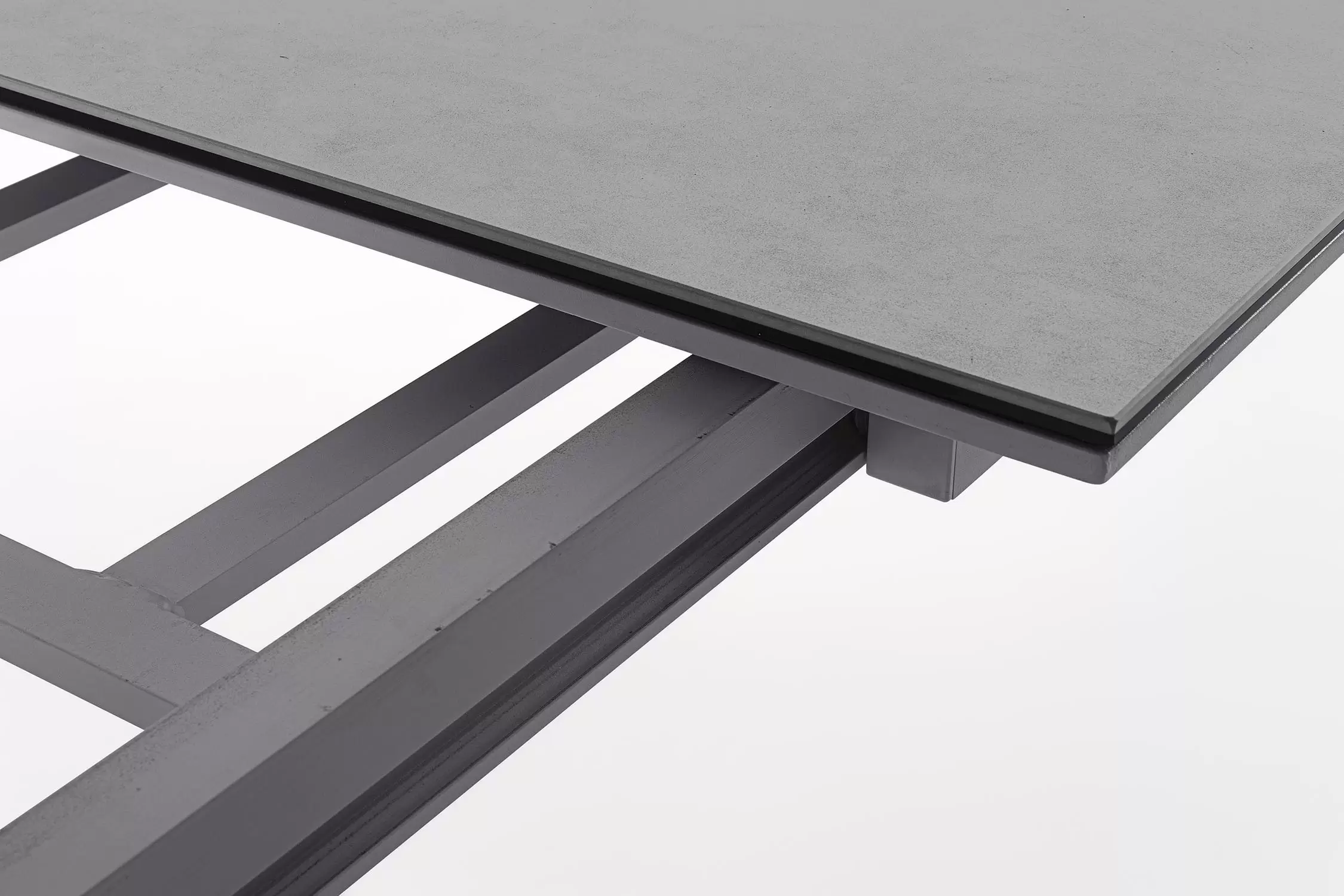 Nowoczesny duży stół na taras aluminiowy z możliwością dwustopniowego wydłużania blatu. System rozkładania teleskopowy. Blat stołu ceramiczny na osnowie ze szkła hartowanego o grubości 9 mm.