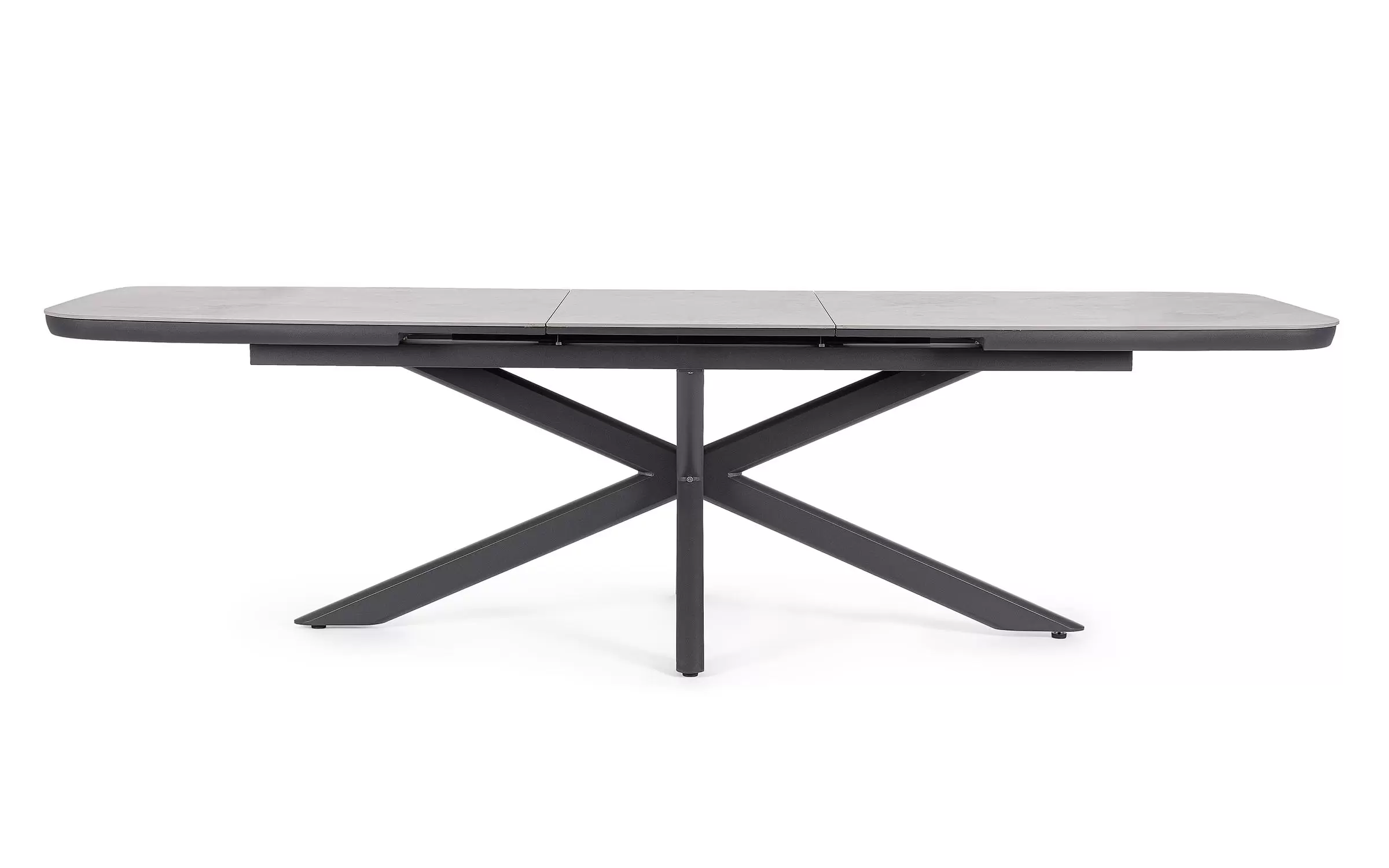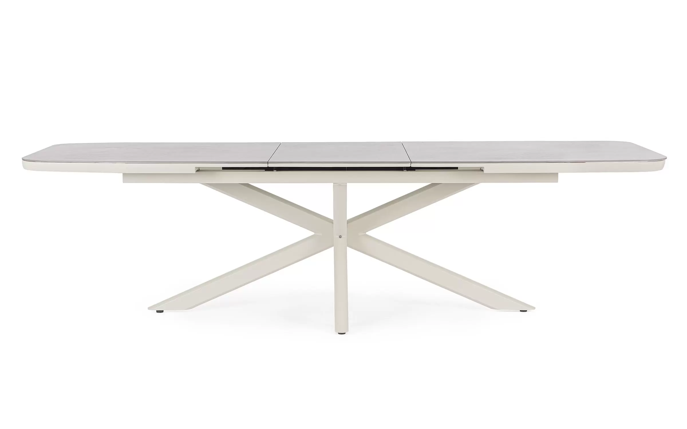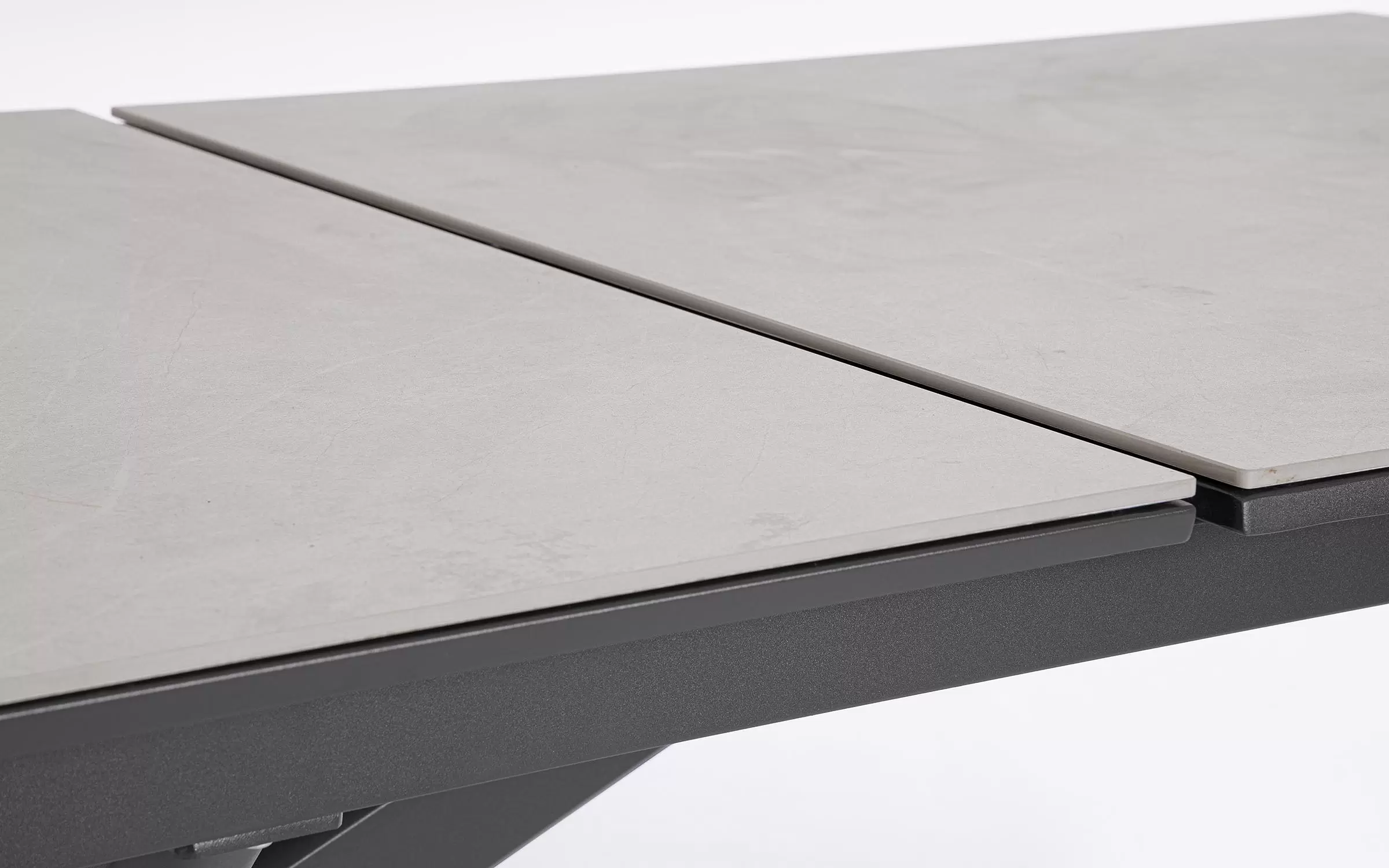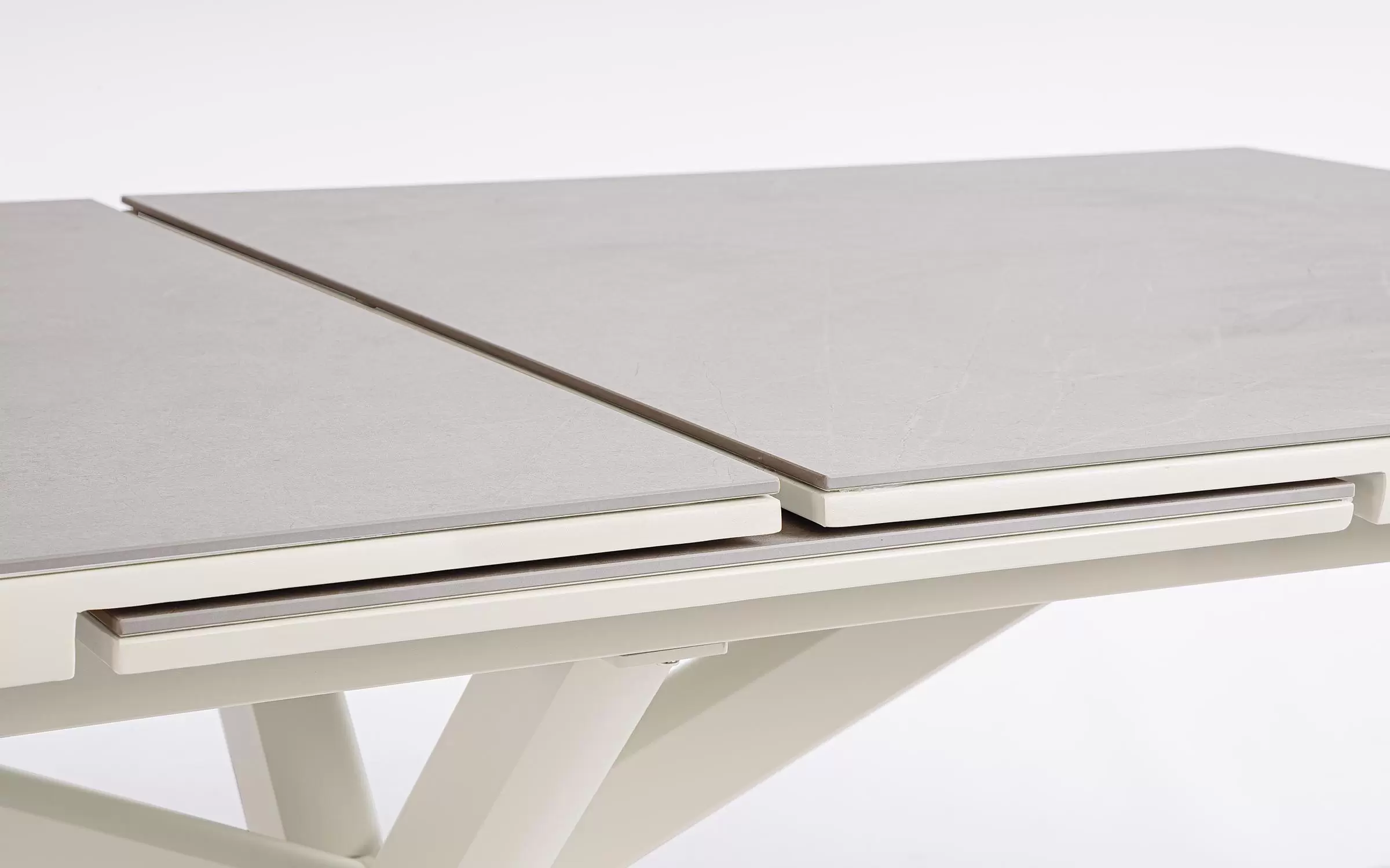 Konstrukcja aluminiowa stołu malowana proszkowo. System rozkładania automatyczny - rozsuwanie z jednej strony powoduje odsunięcie blatu z drugiej strony. Ponowne pociągnięcie podnosi wstawkę na poziom blatu.