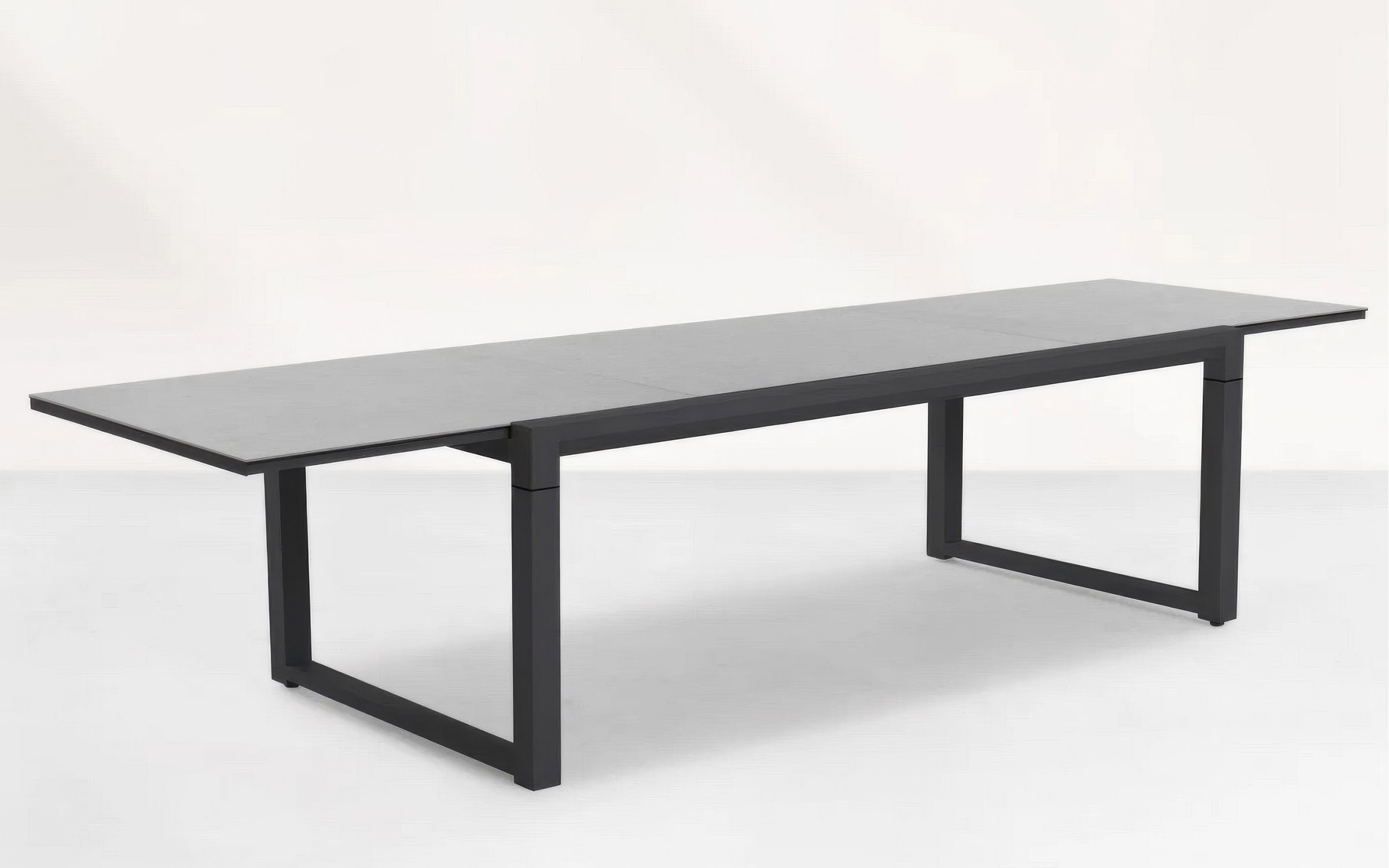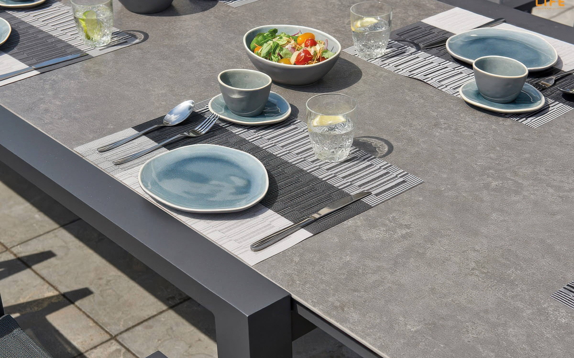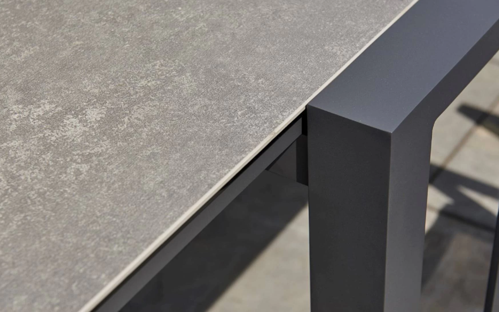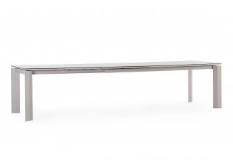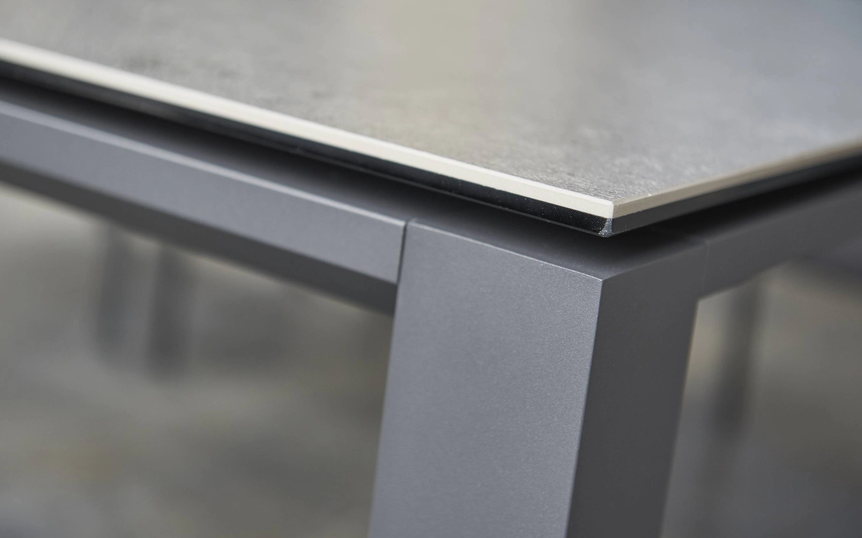 Stół Primavera jest dostępny jako rozkładany stół od 220 cm do 340 cm z trwałym i eleganckim blatem ceramicznym w szarym wykończeniu "beton look". Mechanizm rozsuwania jest idealnie płynny, a wyciąganie środkowego elementu jest bardzo proste ponieważ wstawka porusza się na mimośrodowym połączeniu. Jedno pociągnięcie do góry i wskakuje na odpowiednie miejsce. Nogi w kolorze ciemnoszarym.