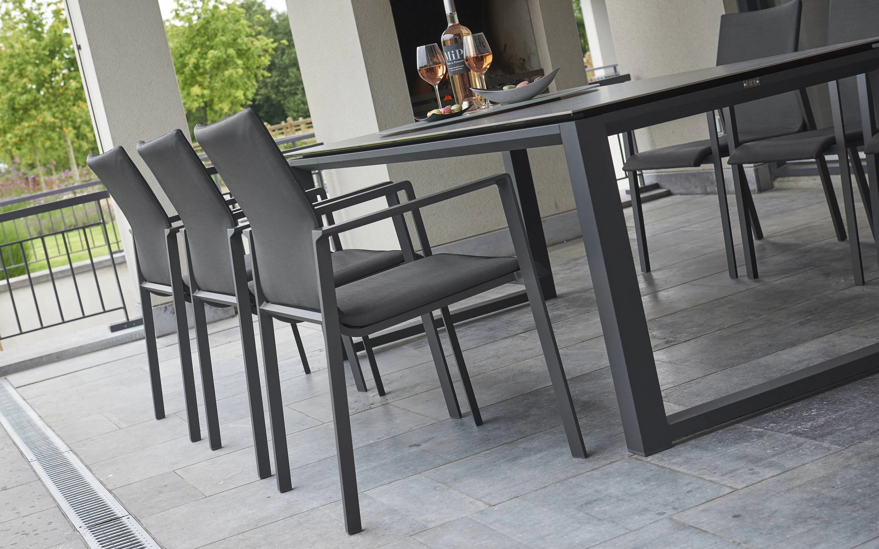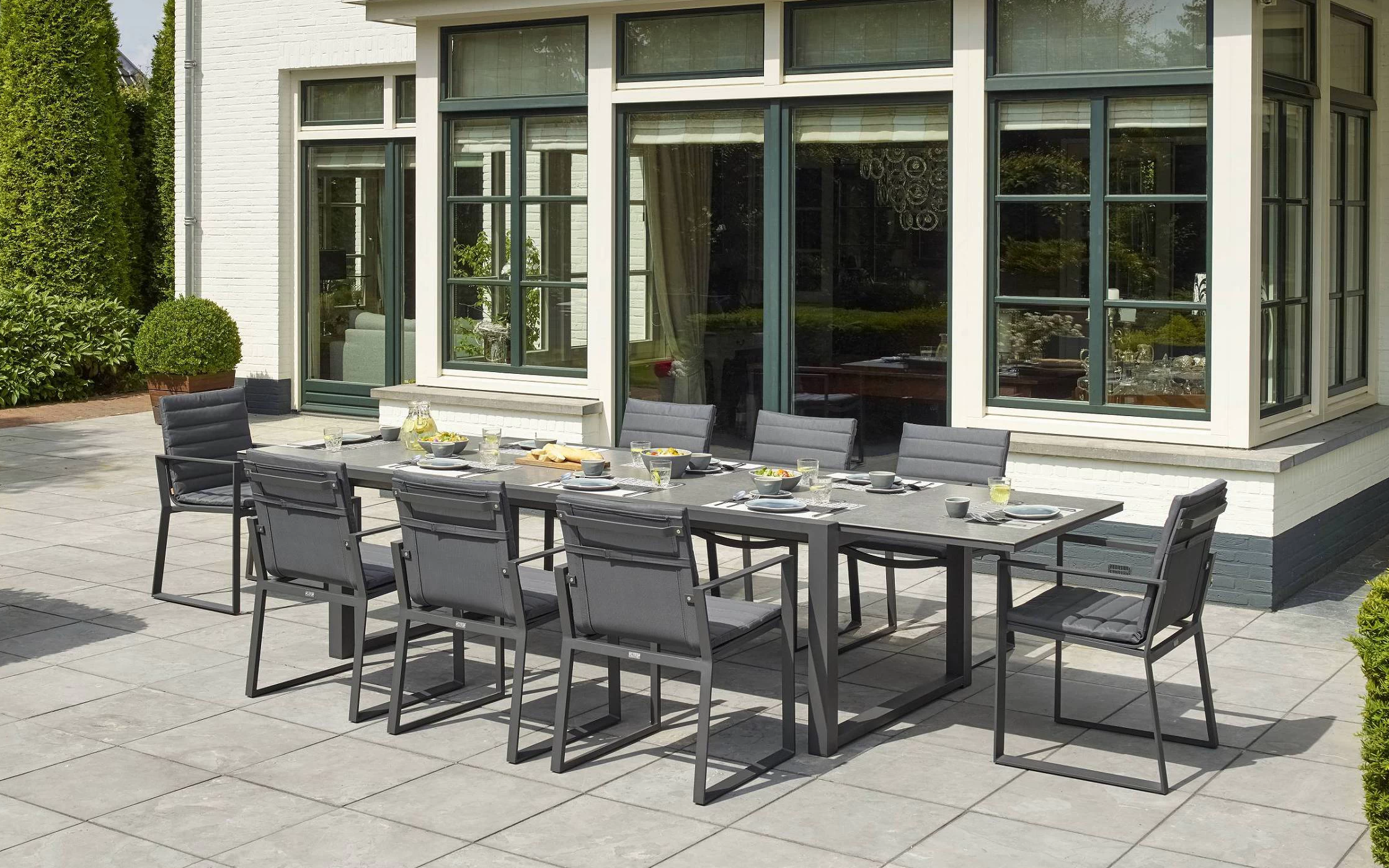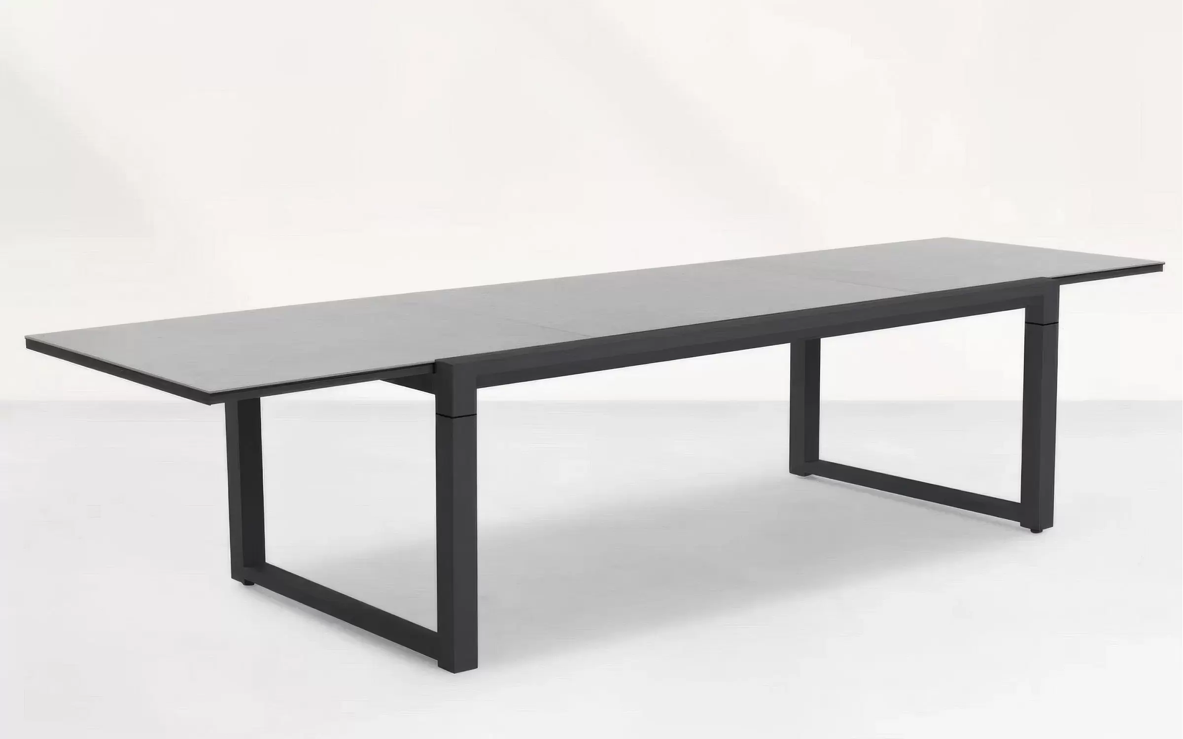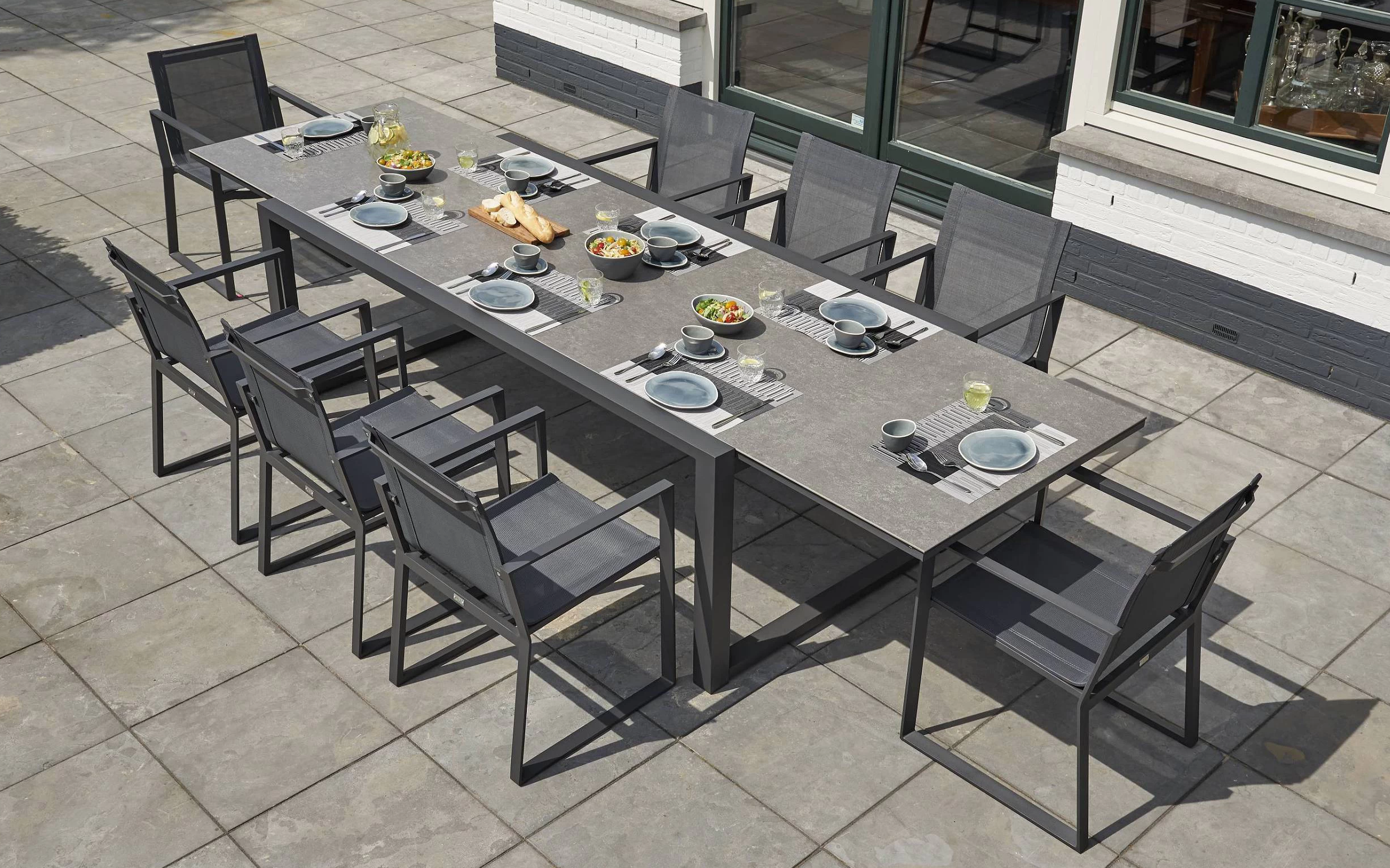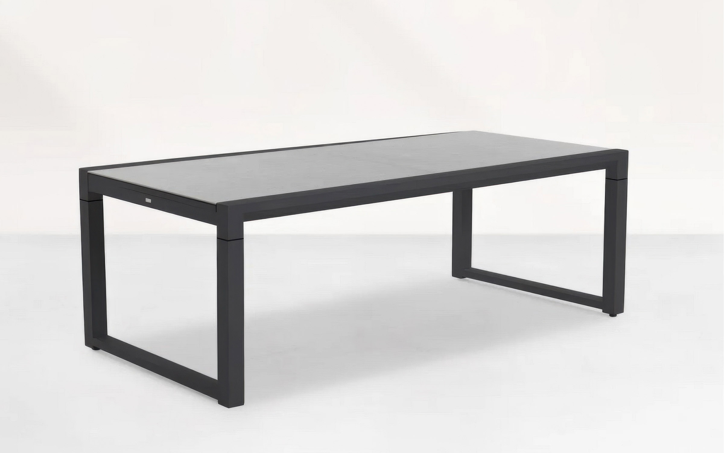 Stół Primavera jest dostępny jako rozkładany stół od 220 cm do 340 cm z trwałym i eleganckim blatem ceramicznym w szarym wykończeniu "beton look". Mechanizm rozsuwania jest idealnie płynny, a wyciąganie środkowego elementu jest bardzo proste ponieważ wstawka porusza się na mimośrodowym połączeniu. Jedno pociągnięcie do góry i wskakuje na odpowiednie miejsce. Nogi w kolorze ciemnoszarym.