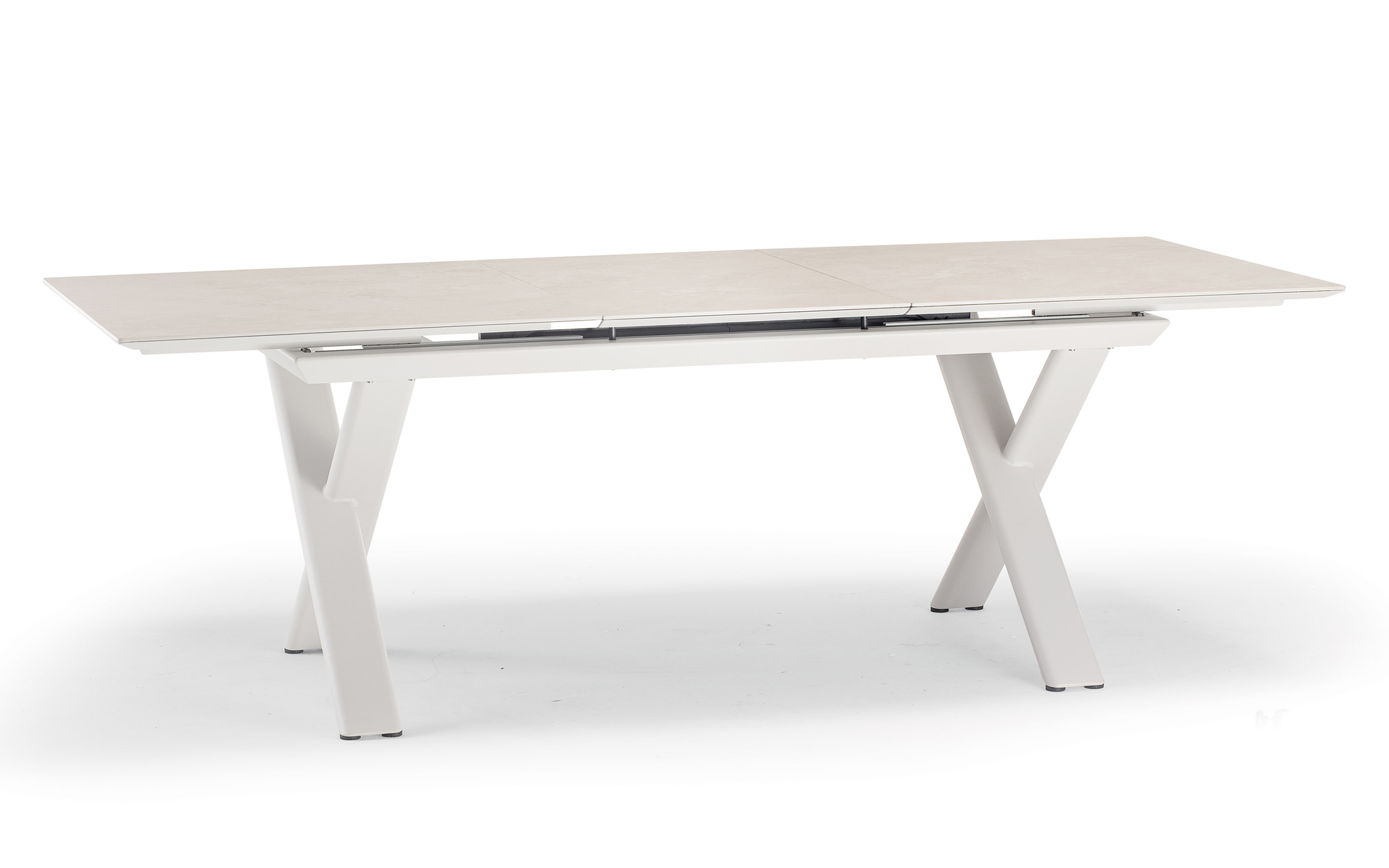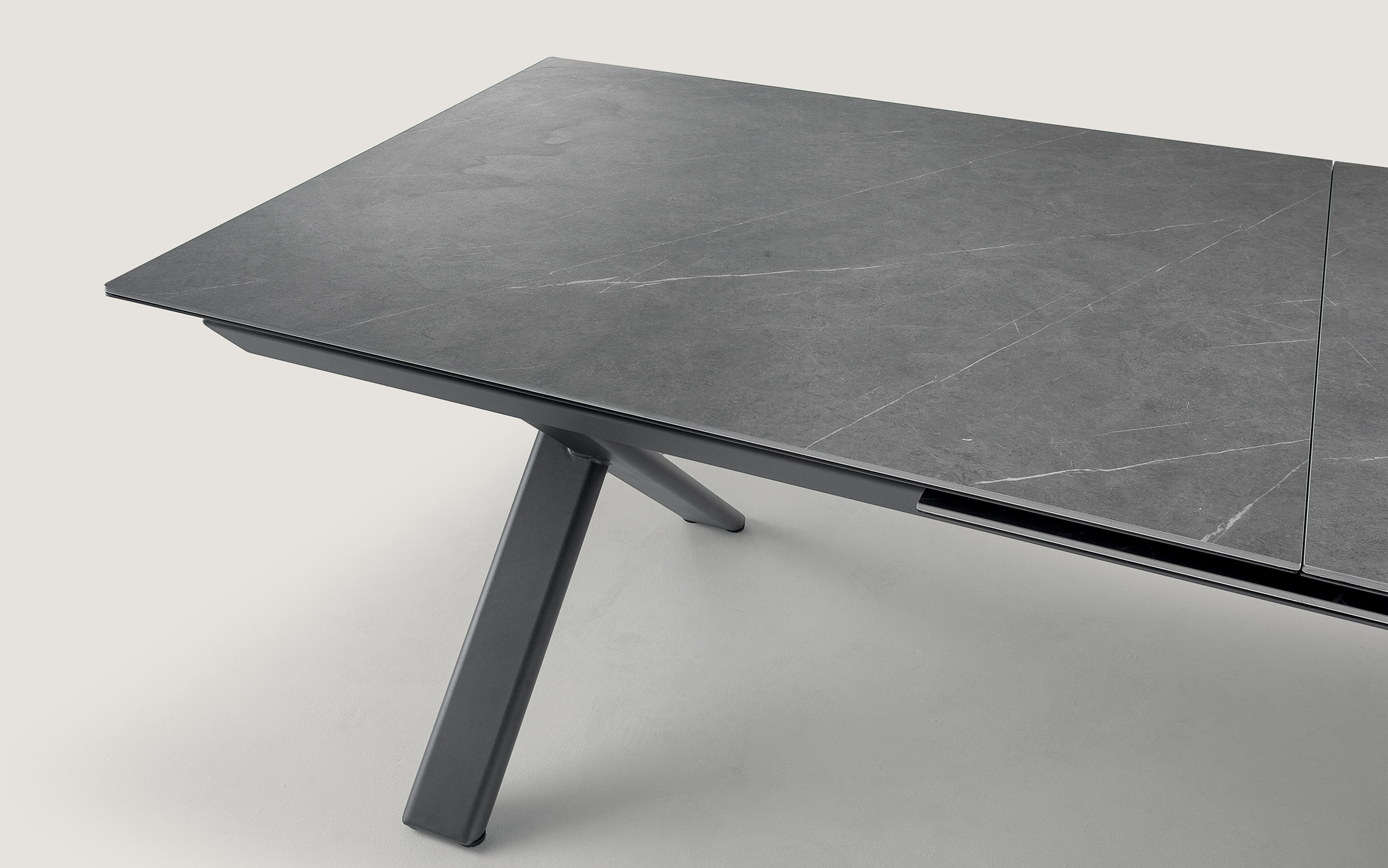 Konstrukcja aluminiowa malowana proszkowo w kolorze antracytowym. Blat wykonany z kamienia spiekanego – materiału odpornego na uderzenia, zarysowania, promieniowanie UV i wilgoć. Mechanizm rozkładania zintegrowany z ramą stołu.