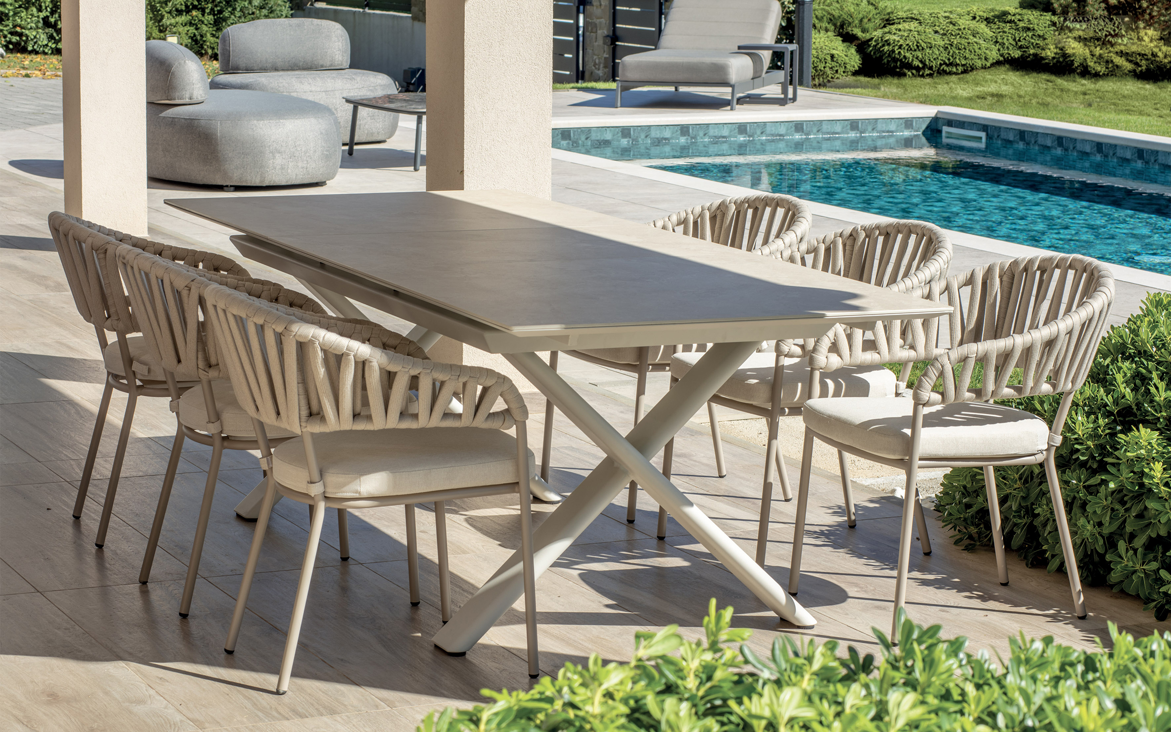 Stół ogrodowy SALINA marki Grattoni to wyrafinowana propozycja dla osób poszukujących harmonii między nowoczesną estetyką a wyjątkową funkcjonalnością w swojej strefie wypoczynku. Sercem mebla jest imponujący blat wykonany z kamienia spiekanego, który nie tylko zachwyca szlachetnym wyglądem, ale przede wszystkim oferuje bezkompromisową odporność na zarysowania, uderzenia oraz zmienne czynniki atmosferyczne. Całość opiera się na stabilnej, a zarazem lekkiej konstrukcji z aluminium malowanego proszkowo w eleganckim odcieniu antracytu, co gwarantuje pełne zabezpieczenie przed korozją i wieloletnią trwałość.