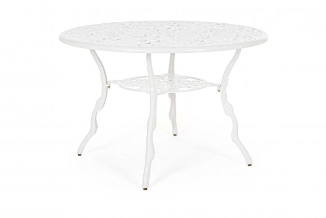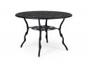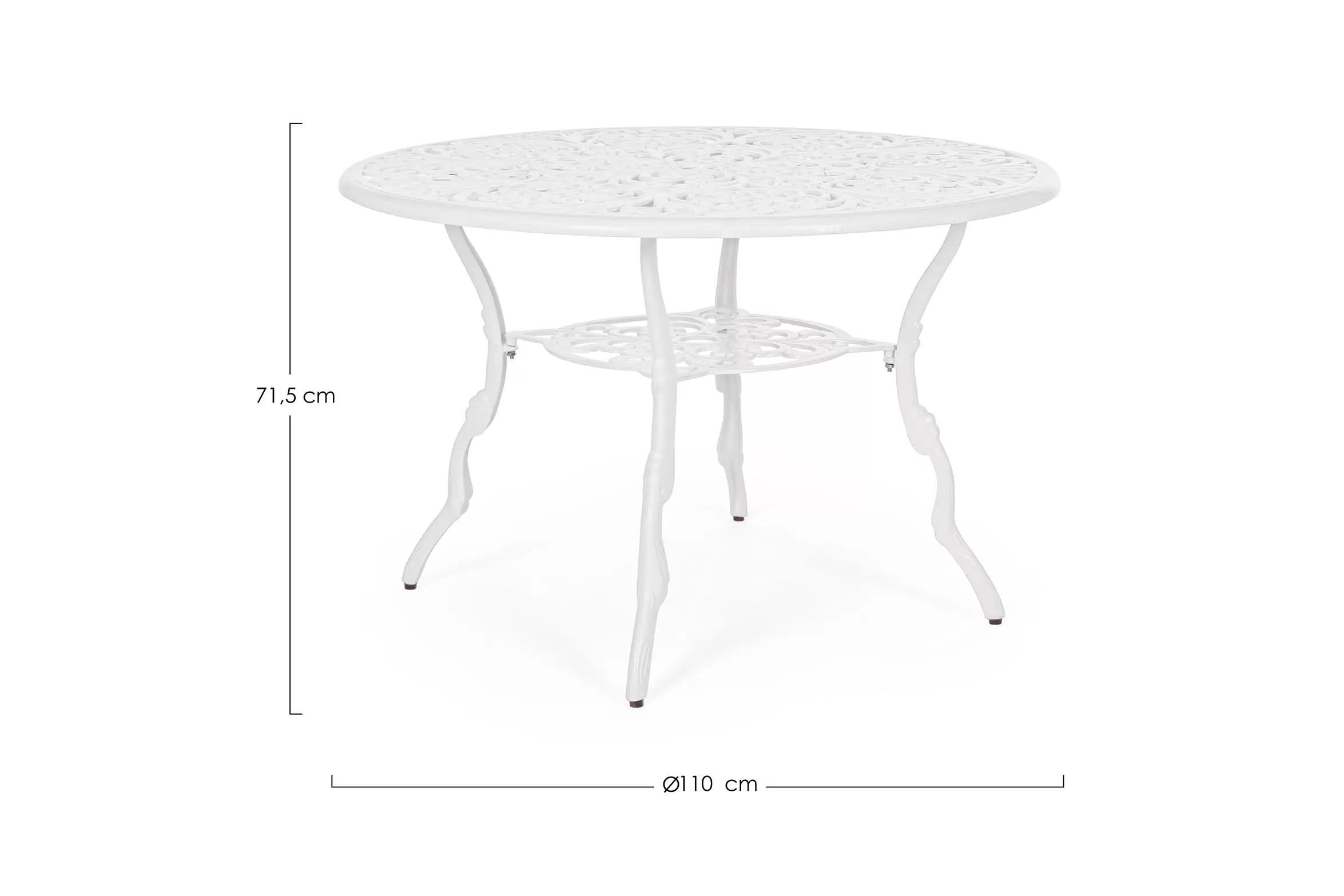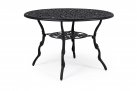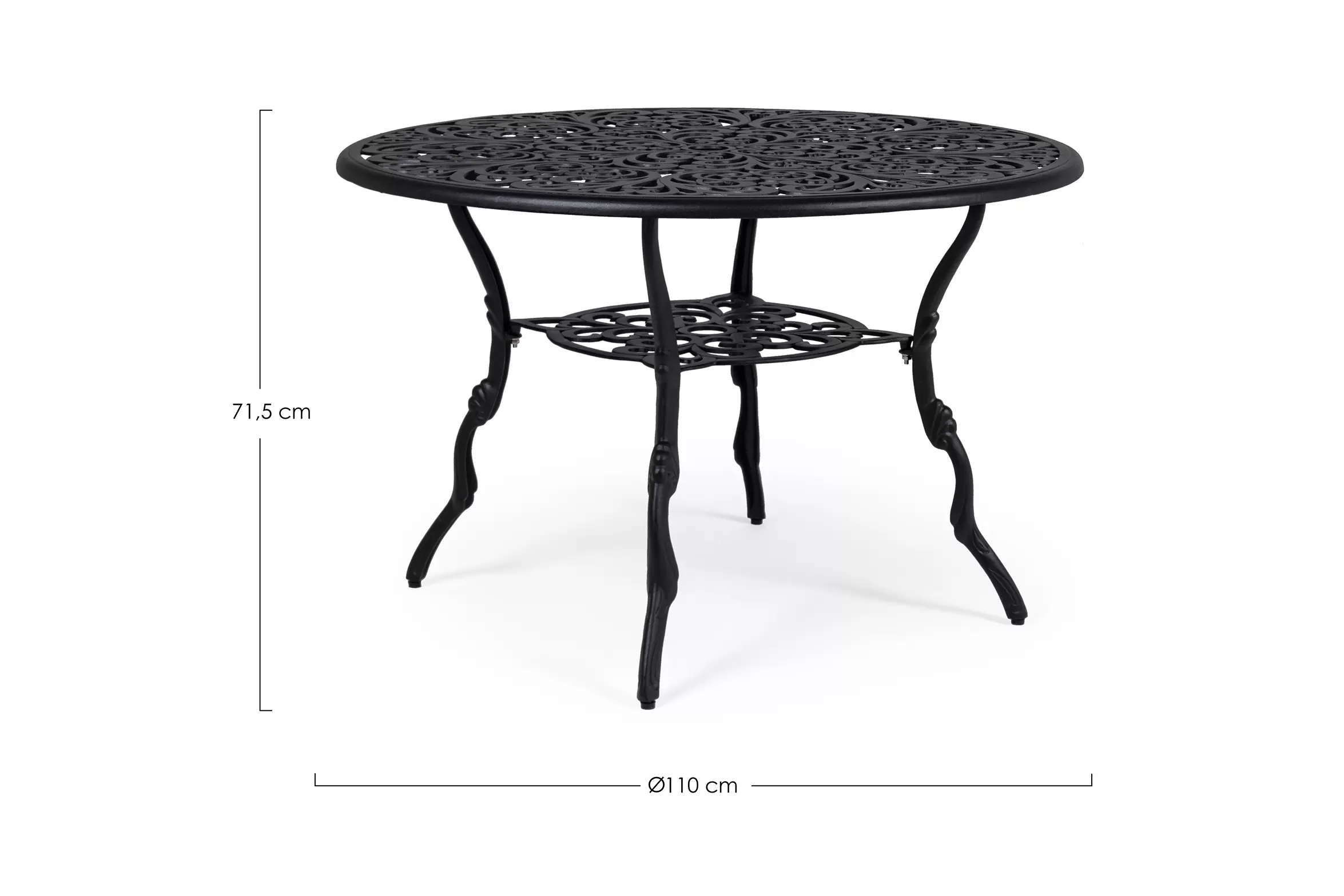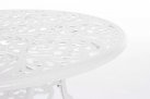 Aluminiowy ogrodowy stół okrągły o średnicy 110 cm o ażurowym blacie.