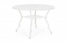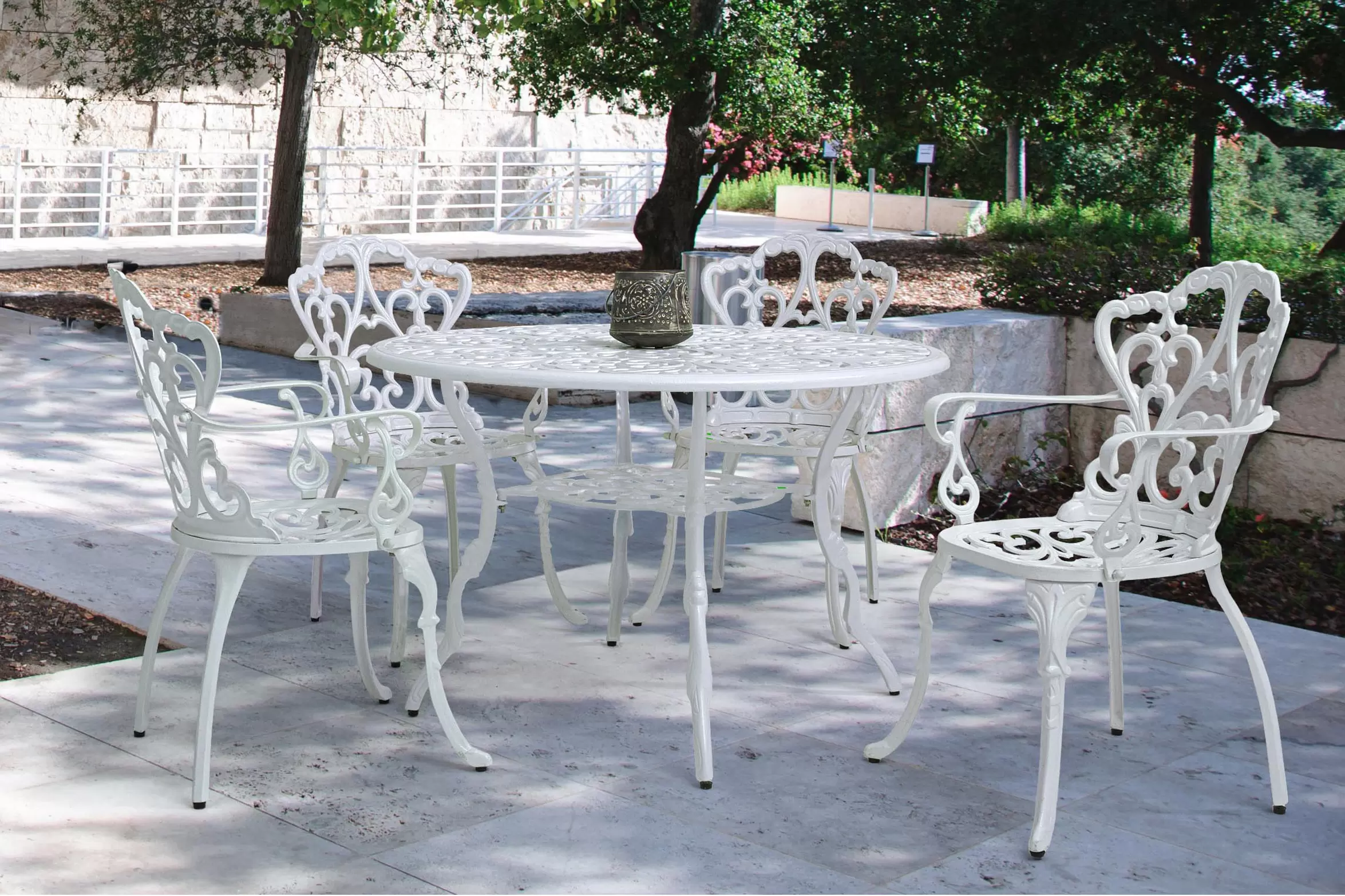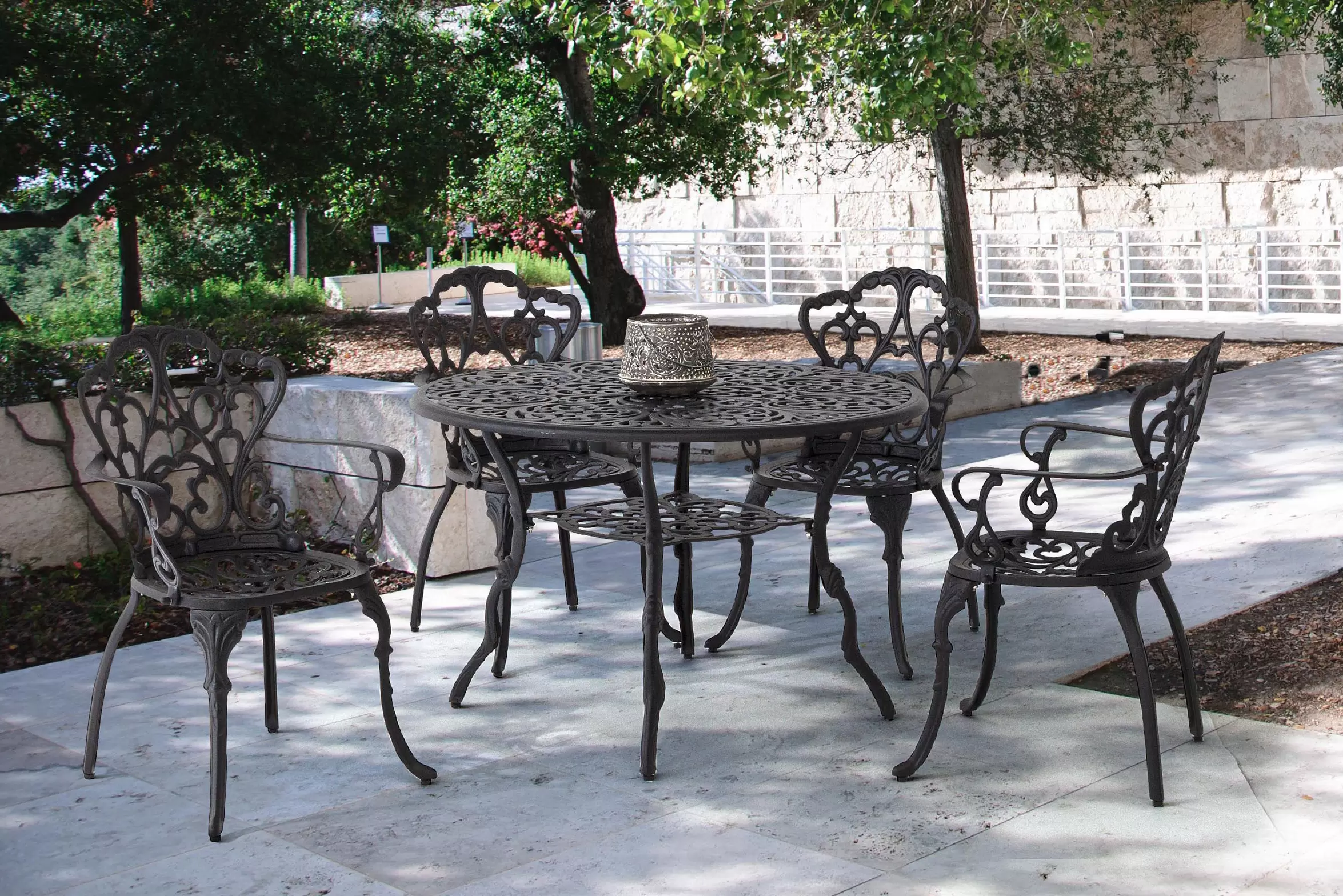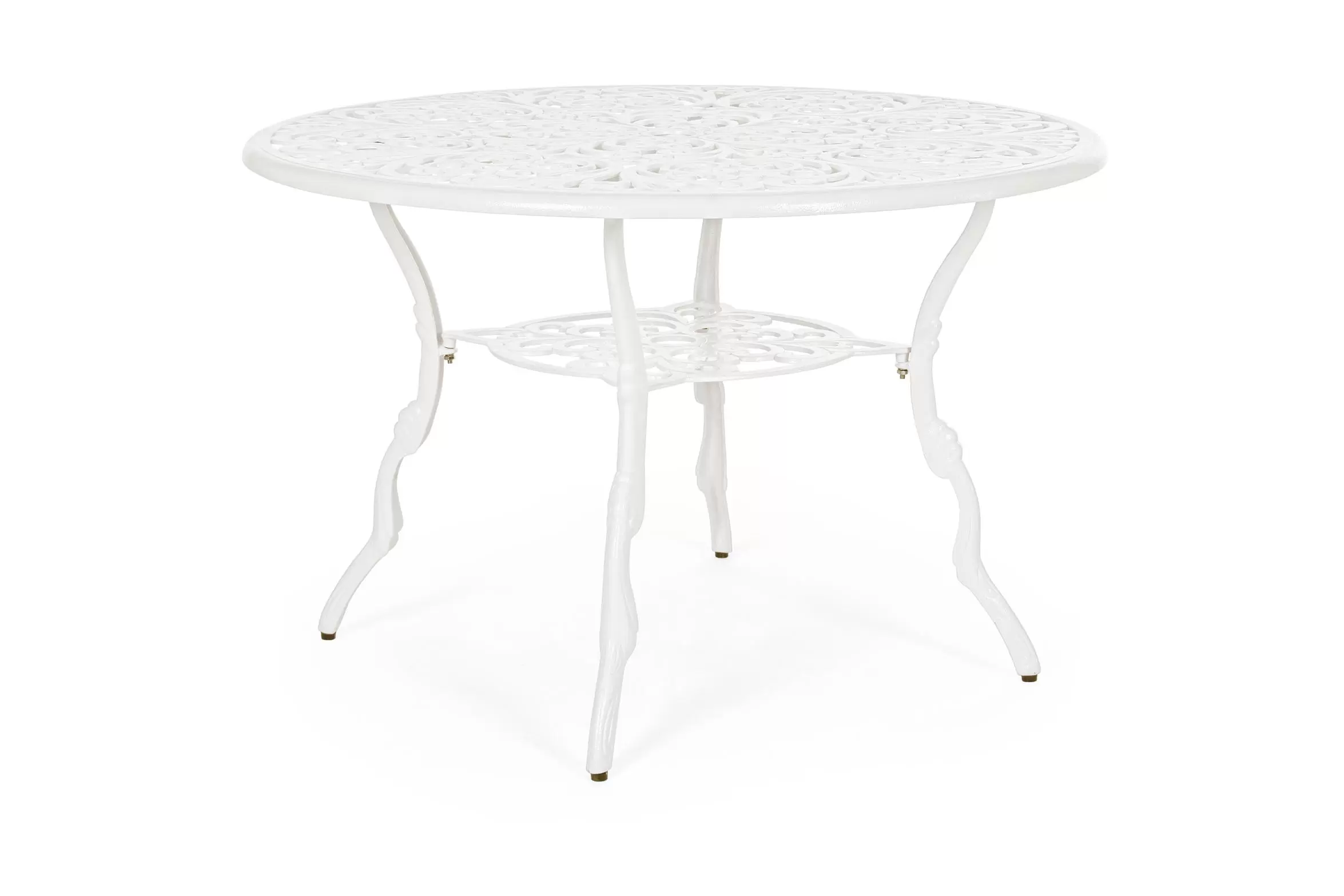 Aluminiowy ogrodowy stół okrągły o średnicy 110 cm o ażurowym blacie.