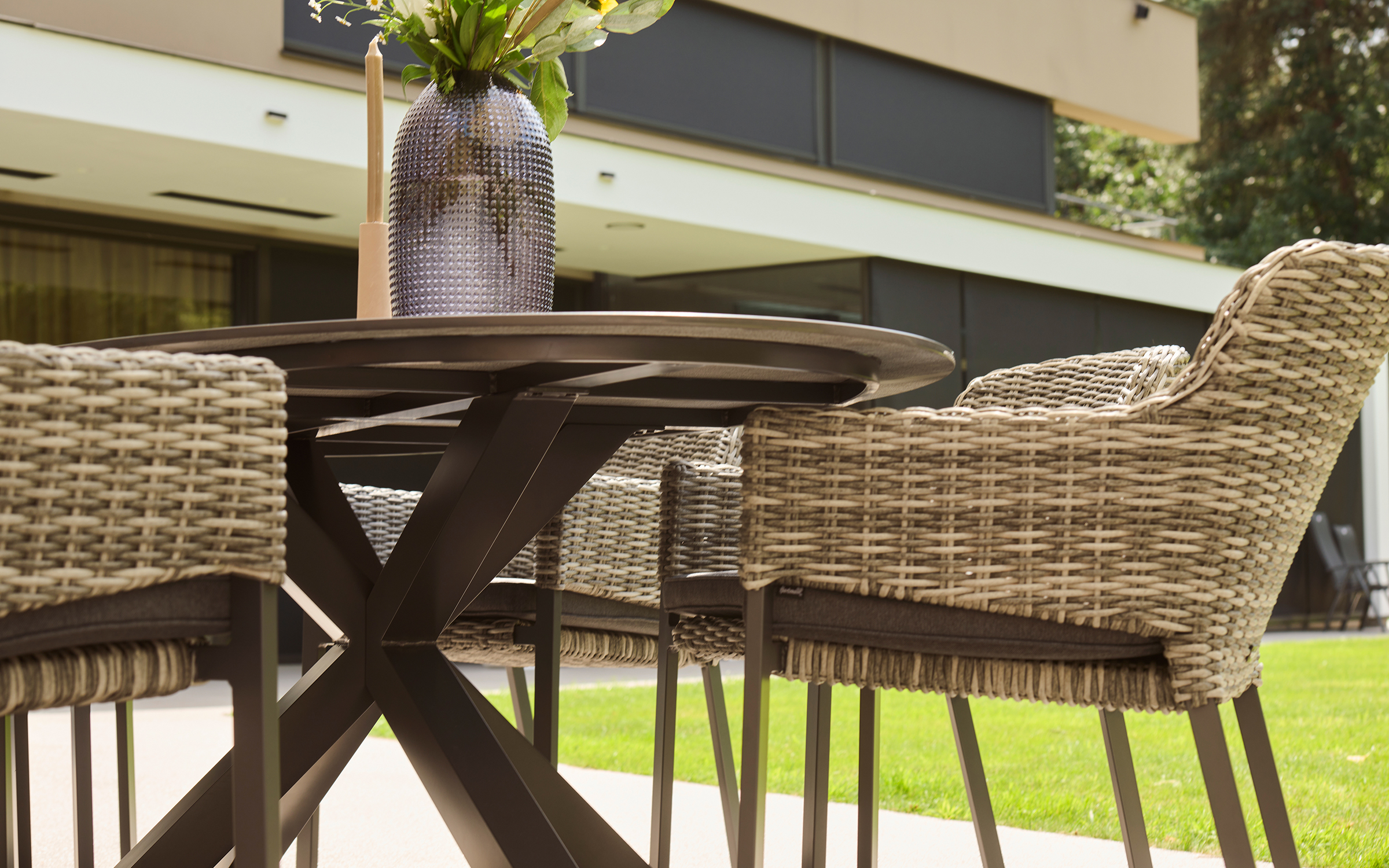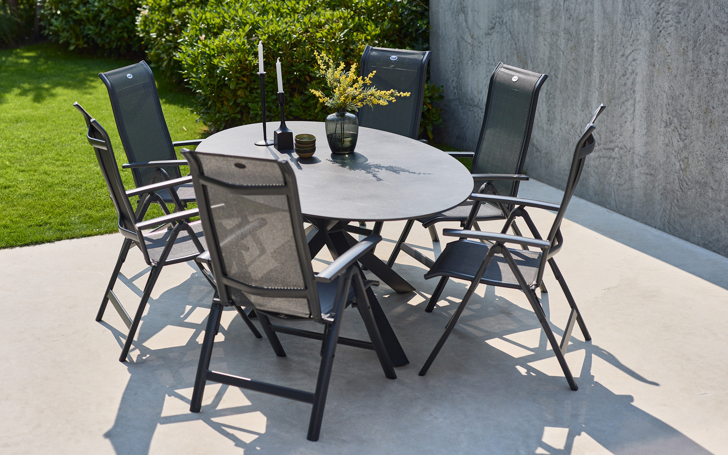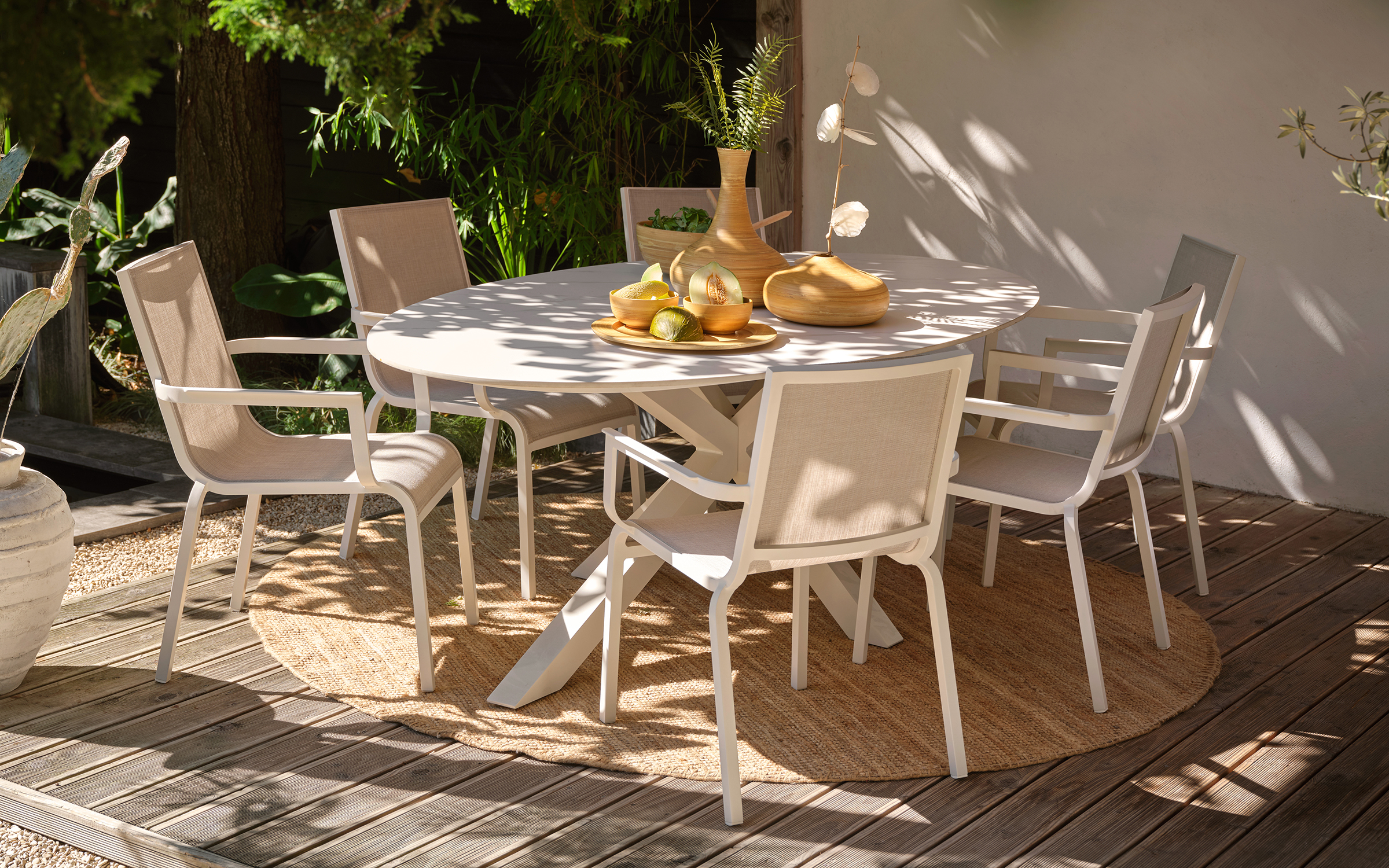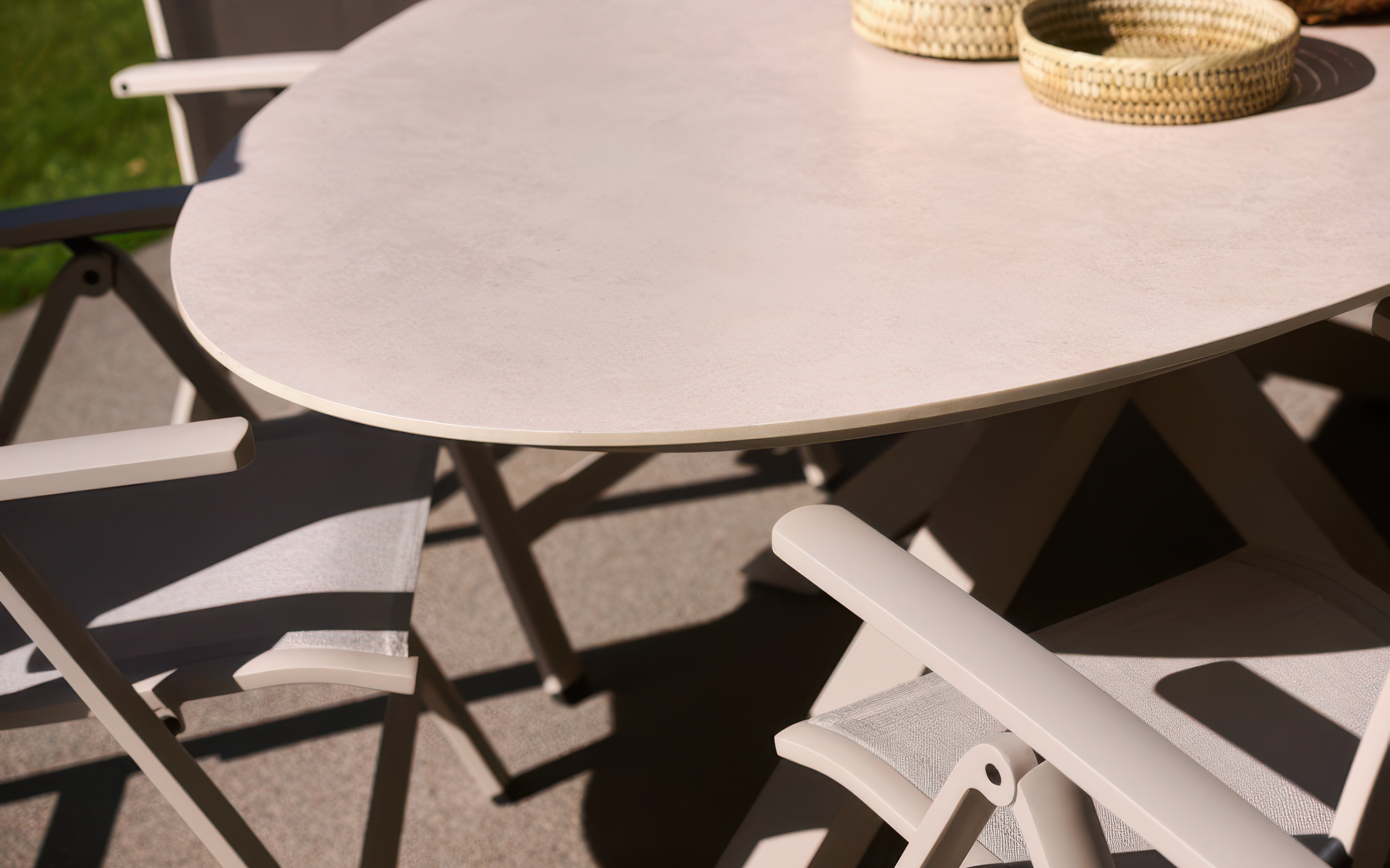 Owalny stół ogrodowy na taras XANDER marki Hartman łączy elegancję i funkcjonalność. Trwały ceramiczny blat spoczywa na stabilnej, krzyżowej podstawie z aluminium. To idealny stół do ogrodu i na taras – odporny na warunki atmosferyczne, łatwy w pielęgnacji i wygodny dla rodzinnych posiłków na świeżym powietrzu.