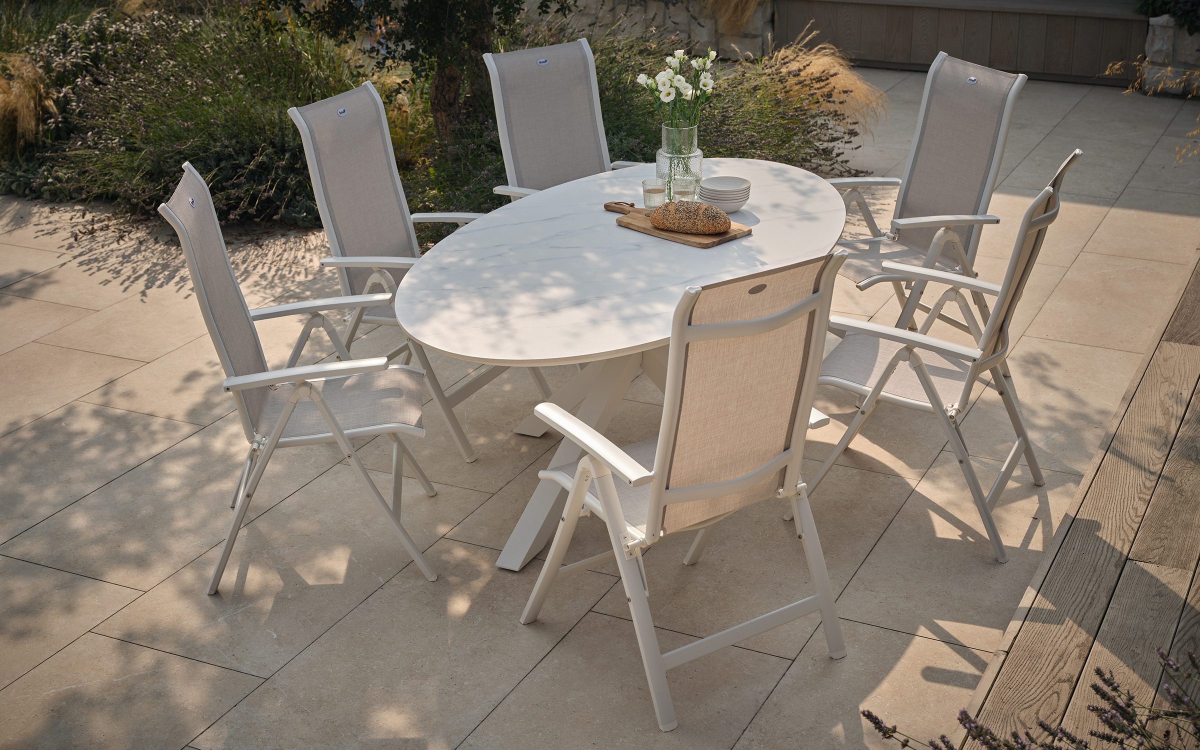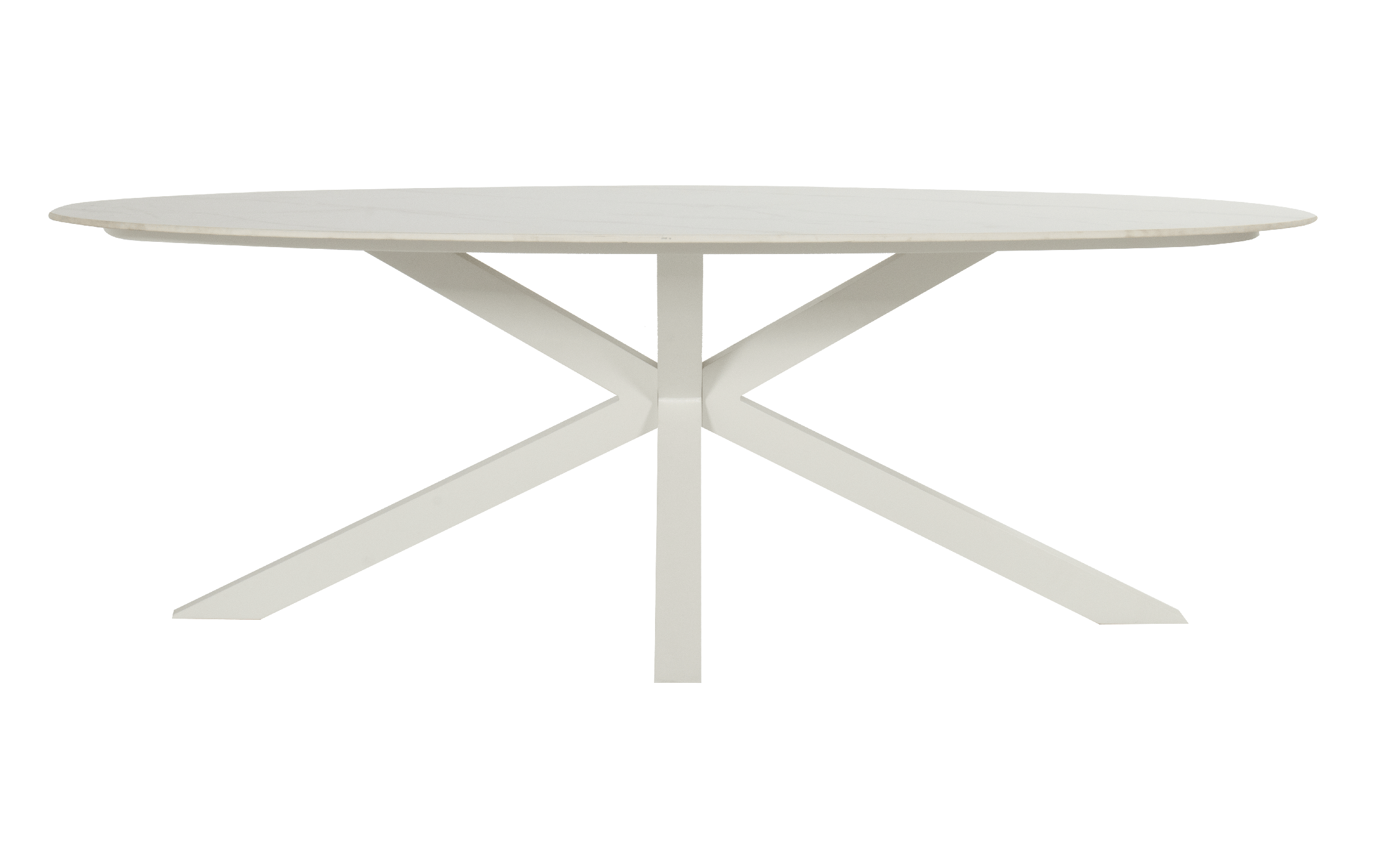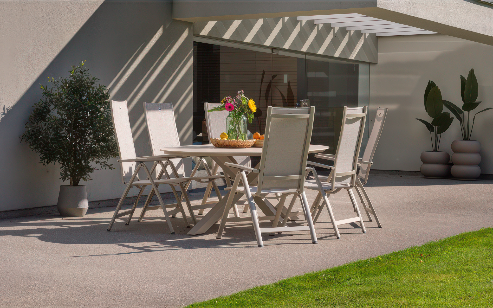 Owalny stół ogrodowy na taras XANDER marki Hartman łączy elegancję i funkcjonalność. Trwały ceramiczny blat spoczywa na stabilnej, krzyżowej podstawie z aluminium. To idealny stół do ogrodu i na taras – odporny na warunki atmosferyczne, łatwy w pielęgnacji i wygodny dla rodzinnych posiłków na świeżym powietrzu.