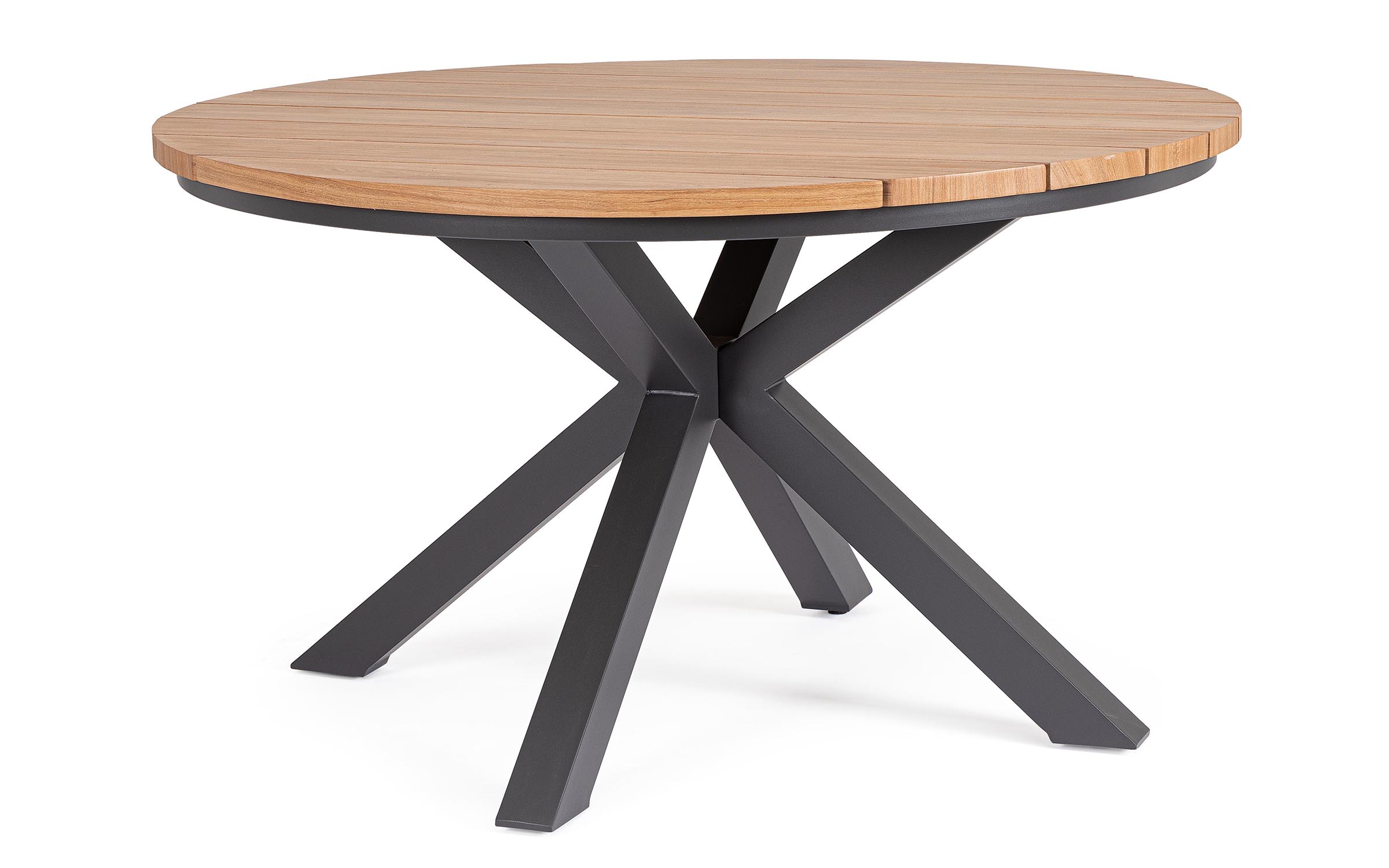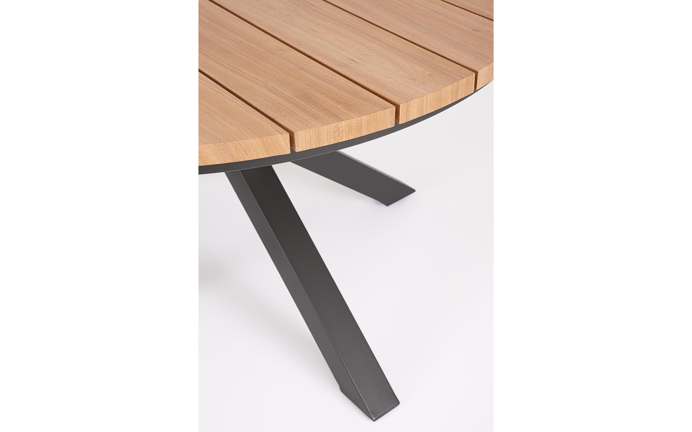 Okragły stół na taras z krzyżową podstawą i blatem także z aluminium z powłoką imitującą prawdziwe drewno.