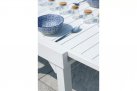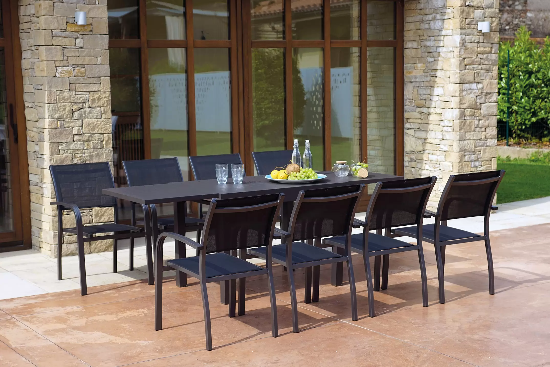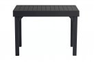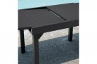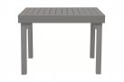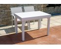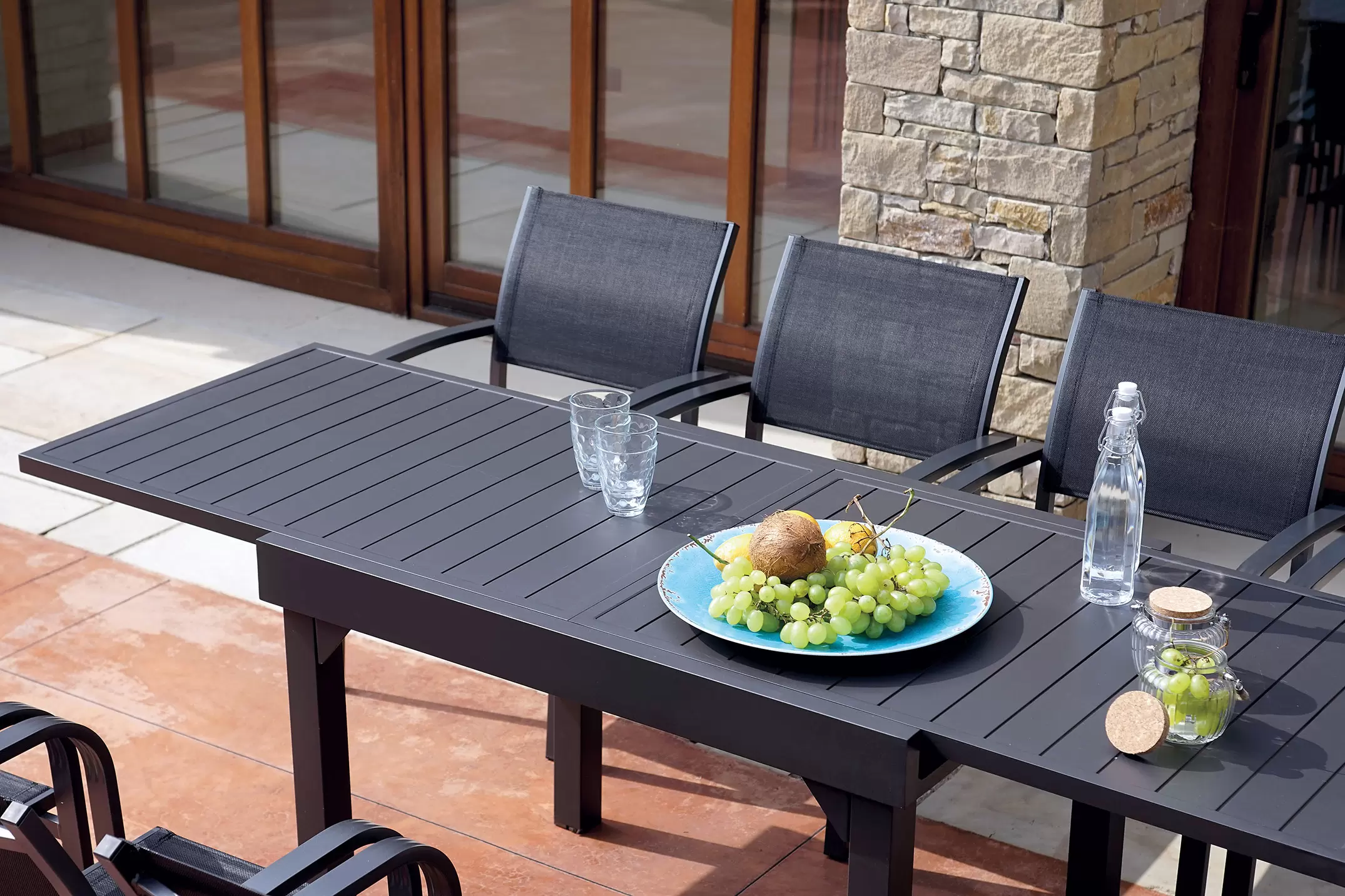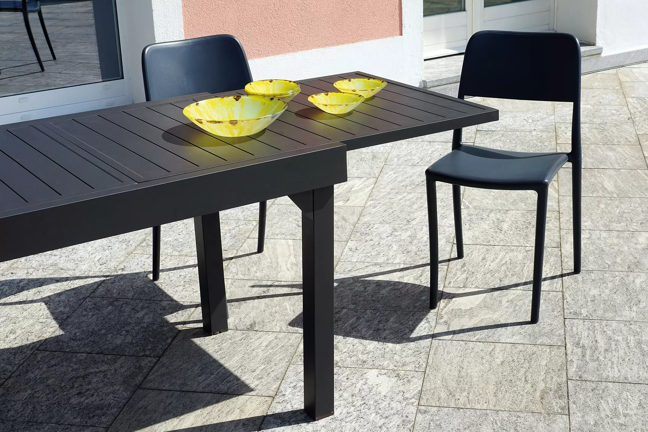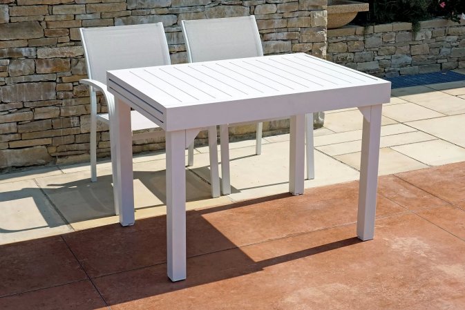 Stół posiada konstrukcję aluminiową malowana proszkowo na kolor antracyt lub biały. Dzięki umieszczeniu pod spodem blatu drugiego identycznego blatu, stół zmyślnie zwiększa dwukrotnie swoją długość zwiększając znacząco możliwości przyjmowania gości. Natomiast w codziennym użyciu daje poczucie przestrzeni na tarasie. Blat wykonany z deseczek z profili aluminiowych malowanych proszkowo.