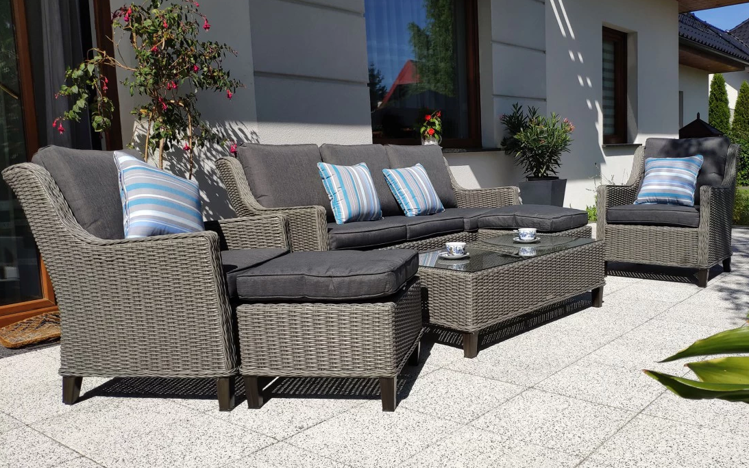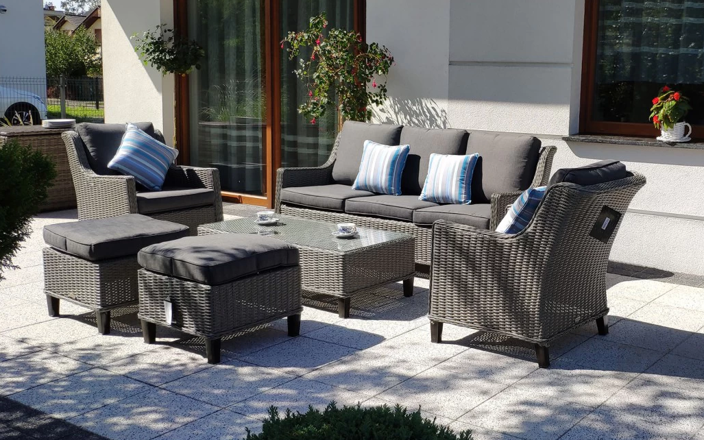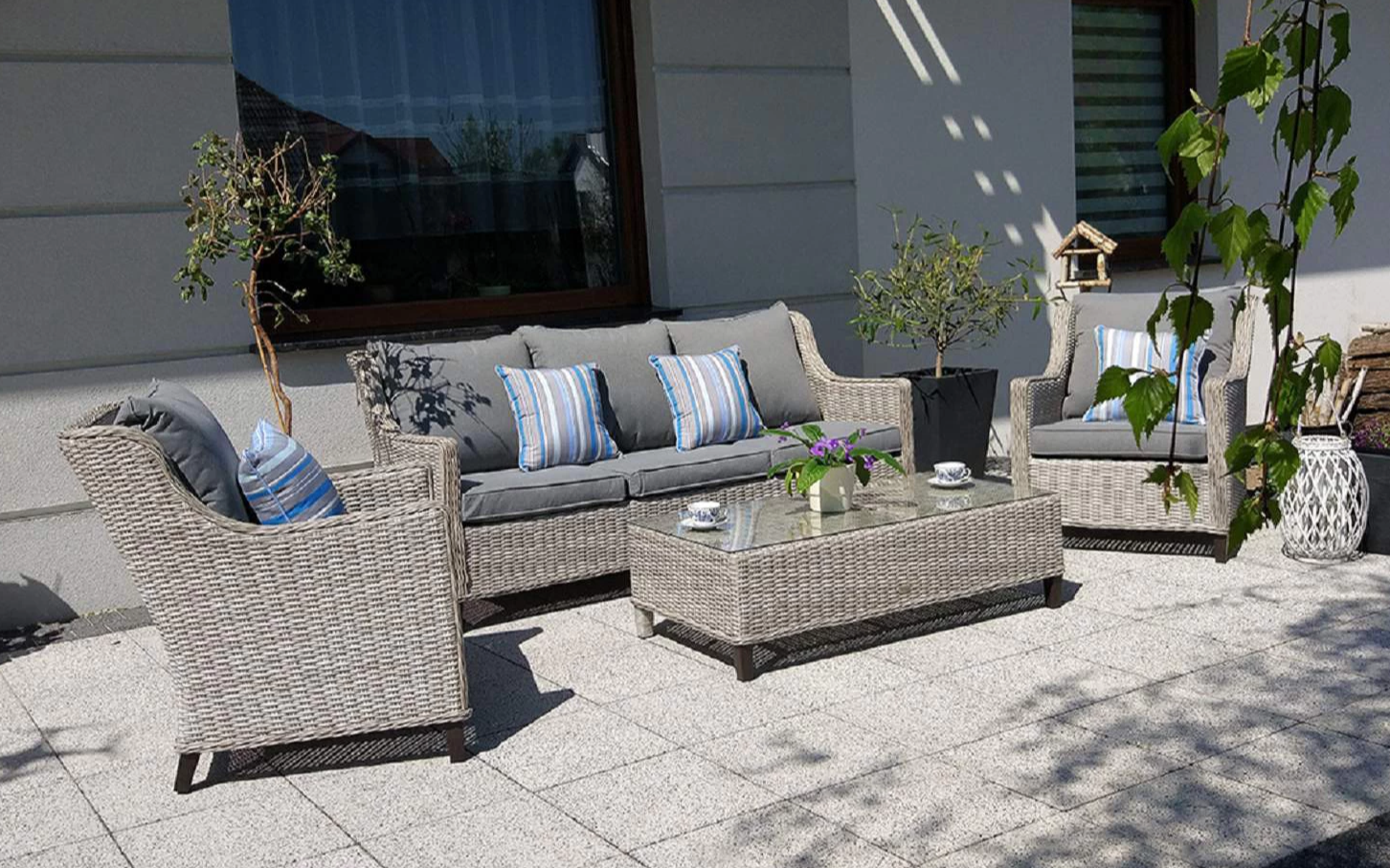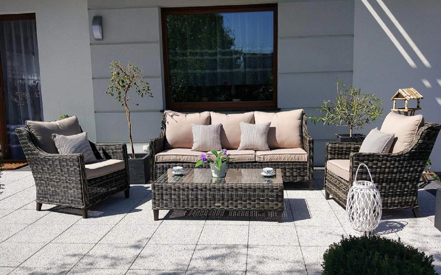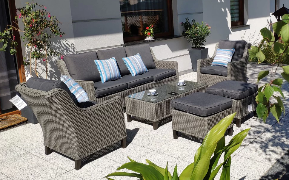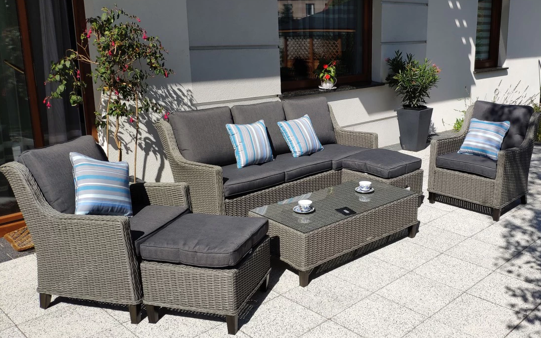 Meble ogrodowe z technorattanu o prostych, kubistycznych kształtach, wykonane z nowoczesnych i trwałych materiałów.