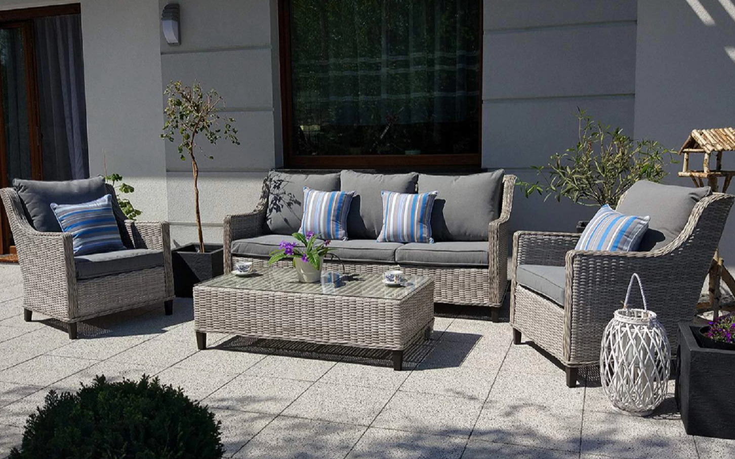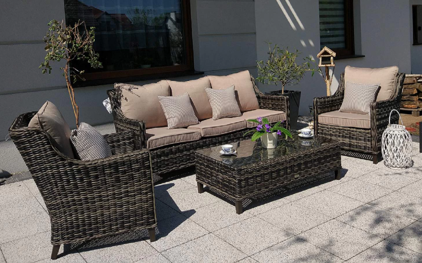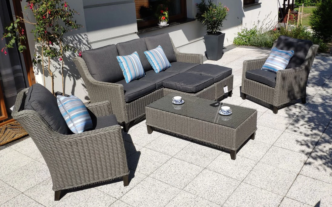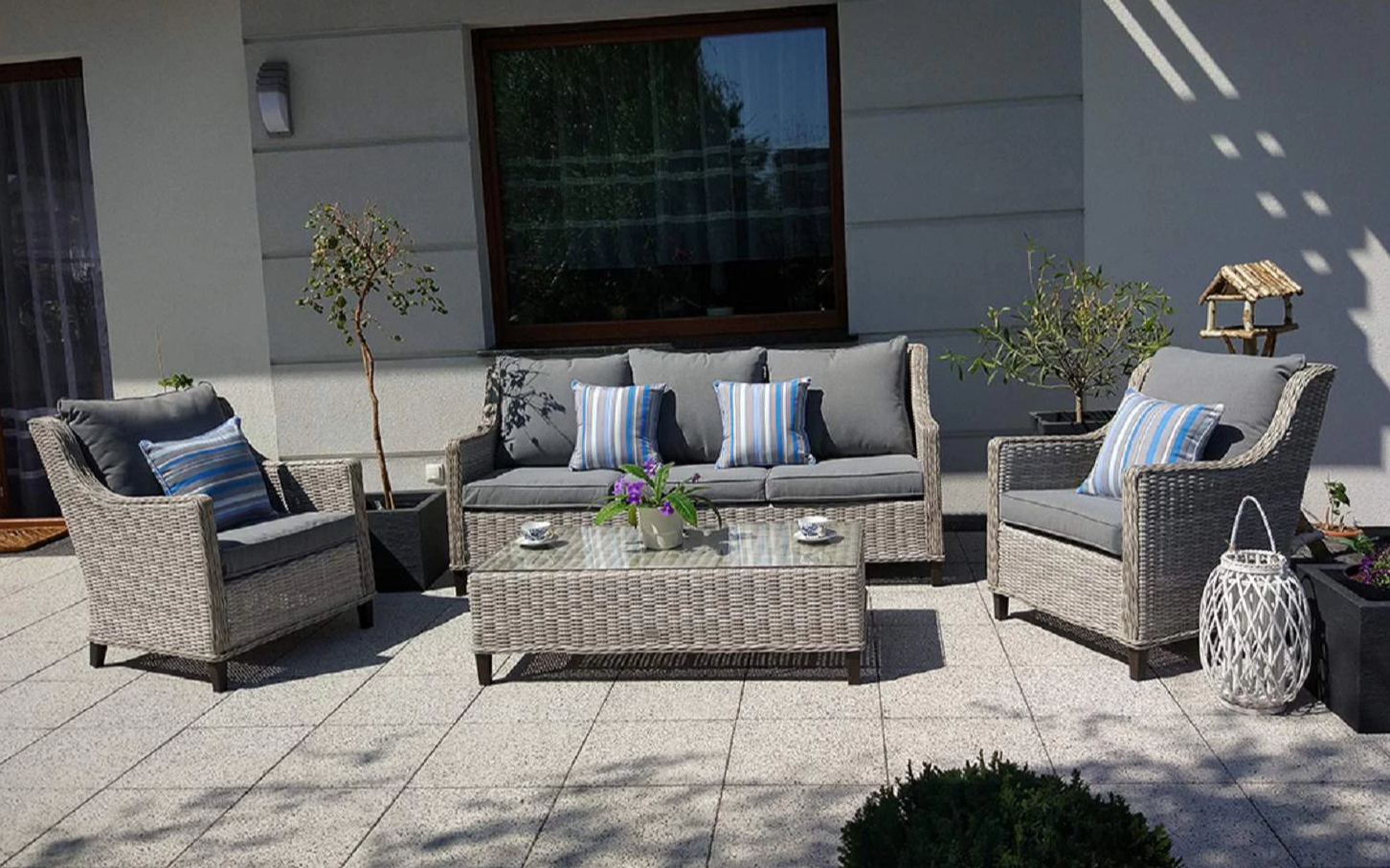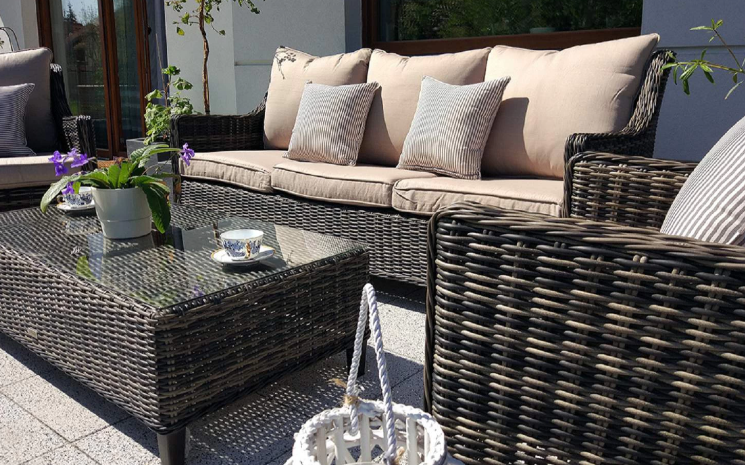 Meble ogrodowe z technorattanu o prostych, kubistycznych kształtach, wykonane z nowoczesnych i trwałych materiałów.