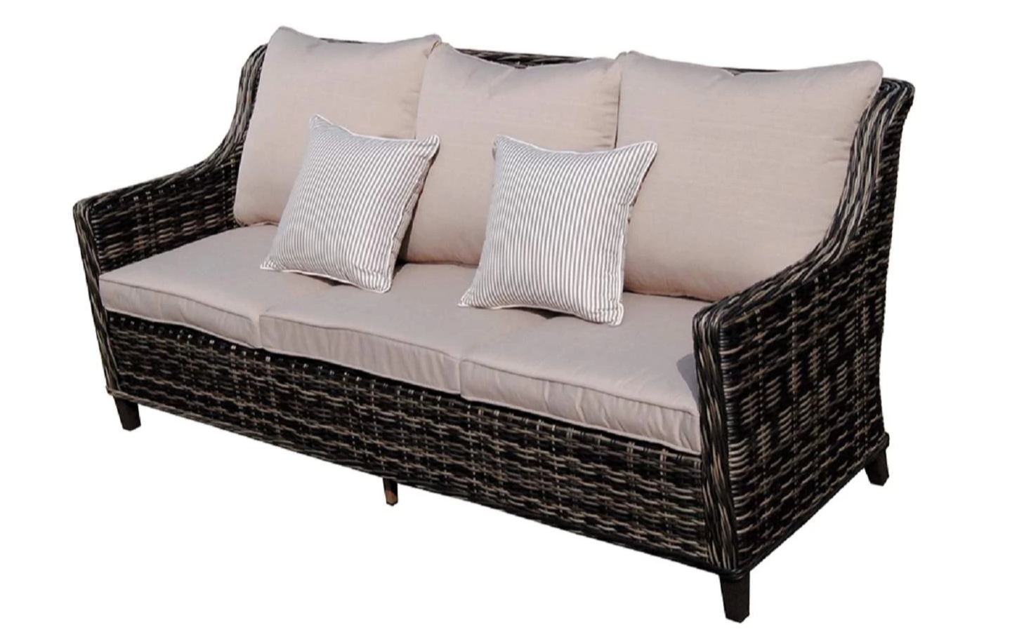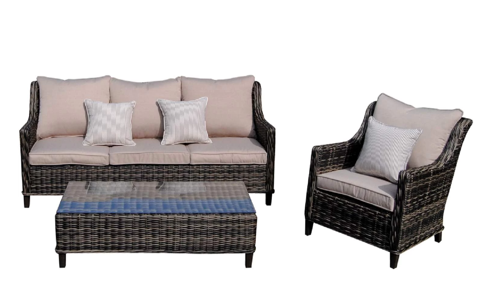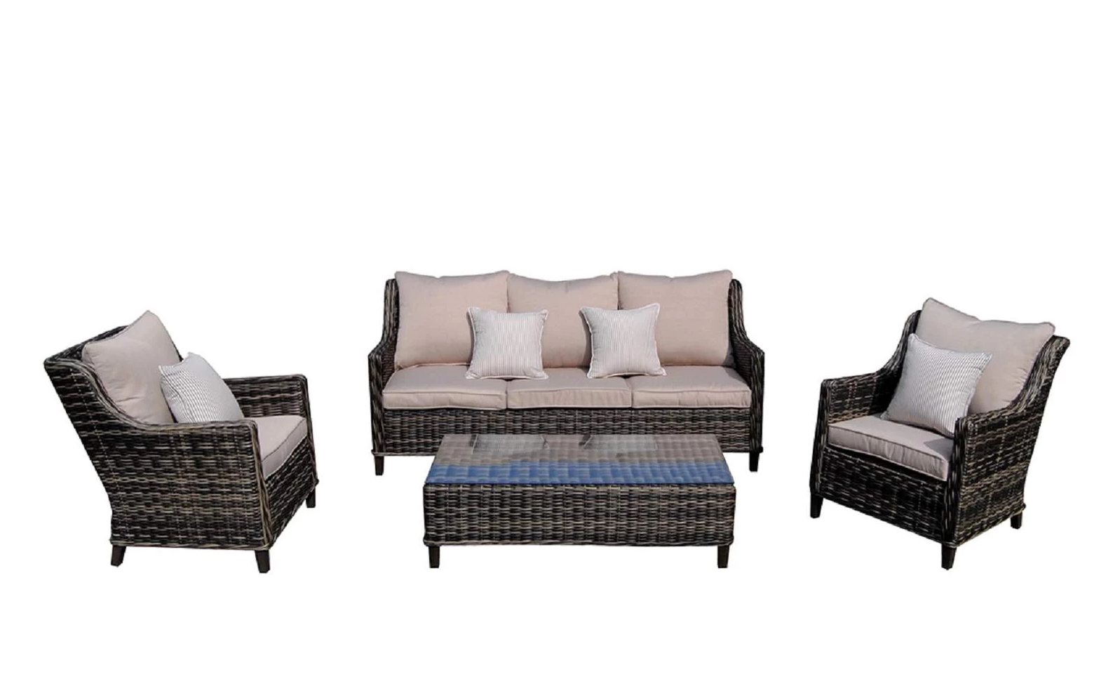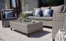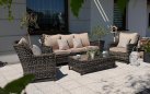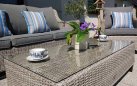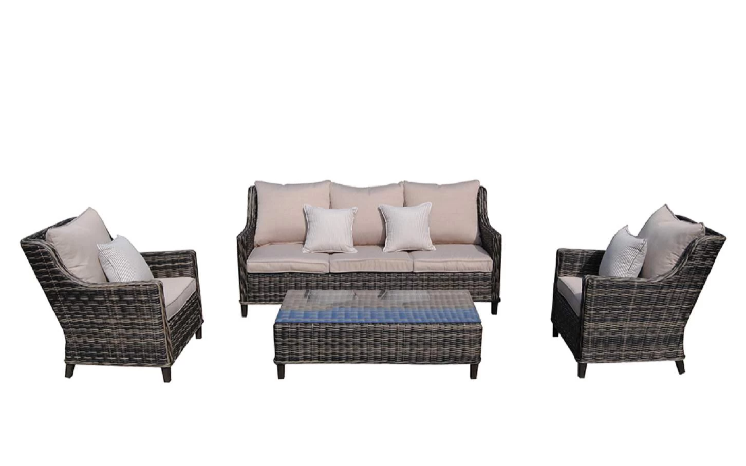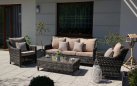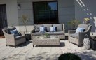 Meble ogrodowe z technorattanu o prostych, kubistycznych kształtach, wykonane z nowoczesnych i trwałych materiałów.