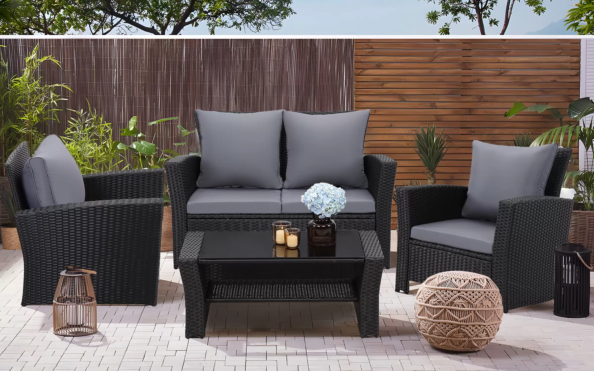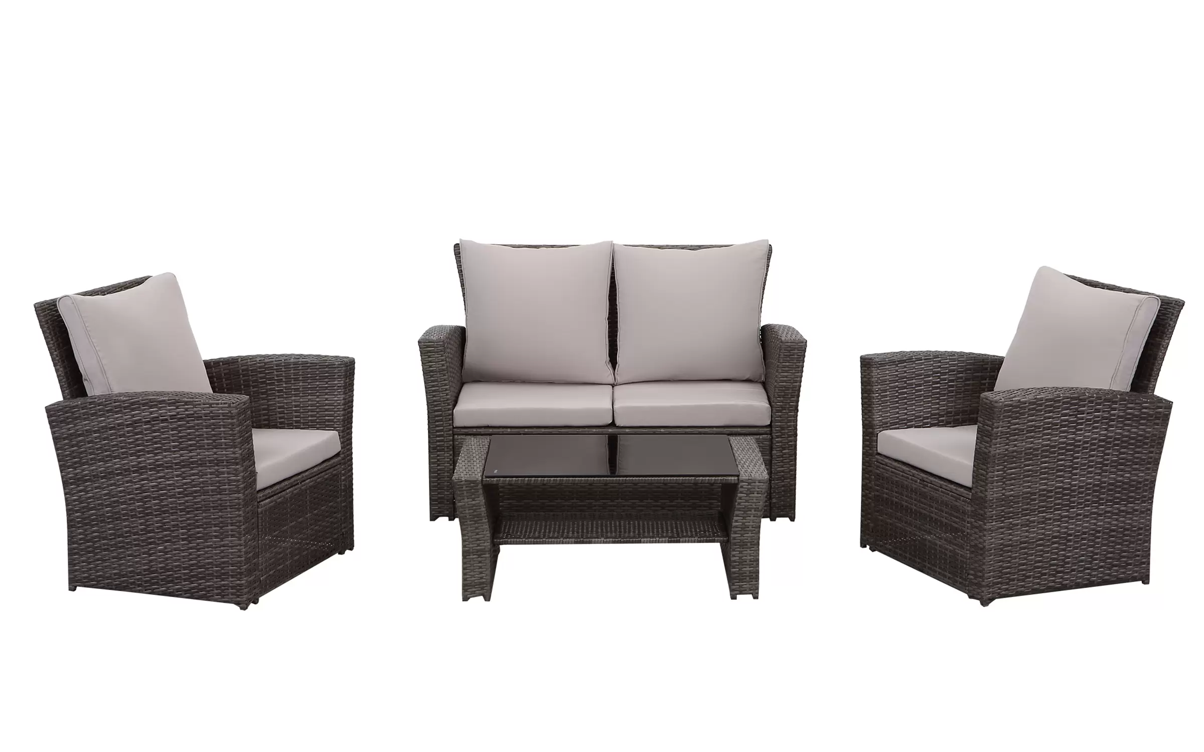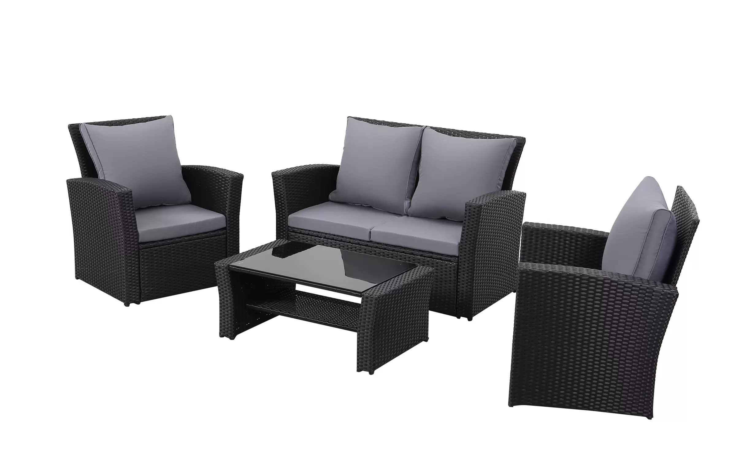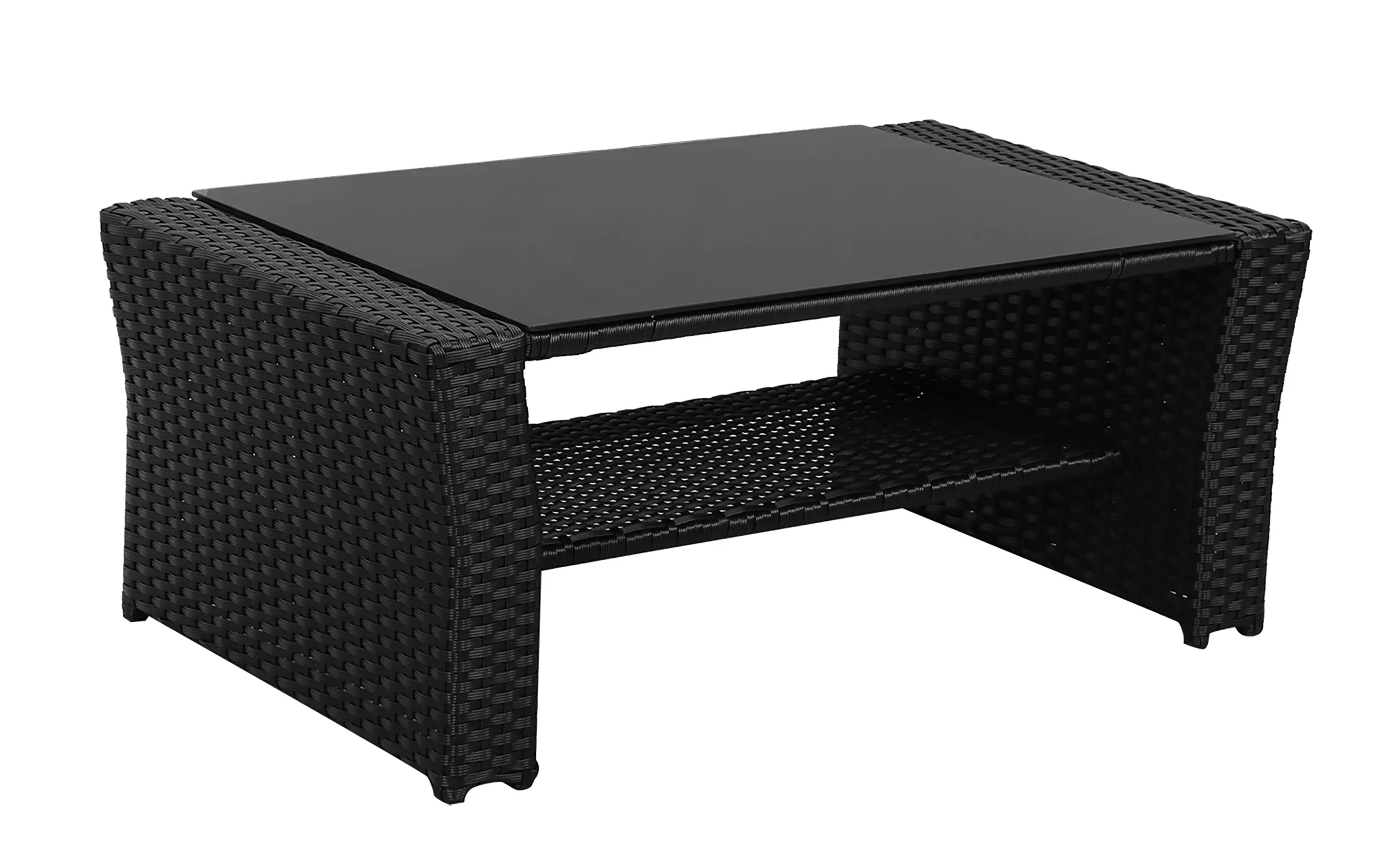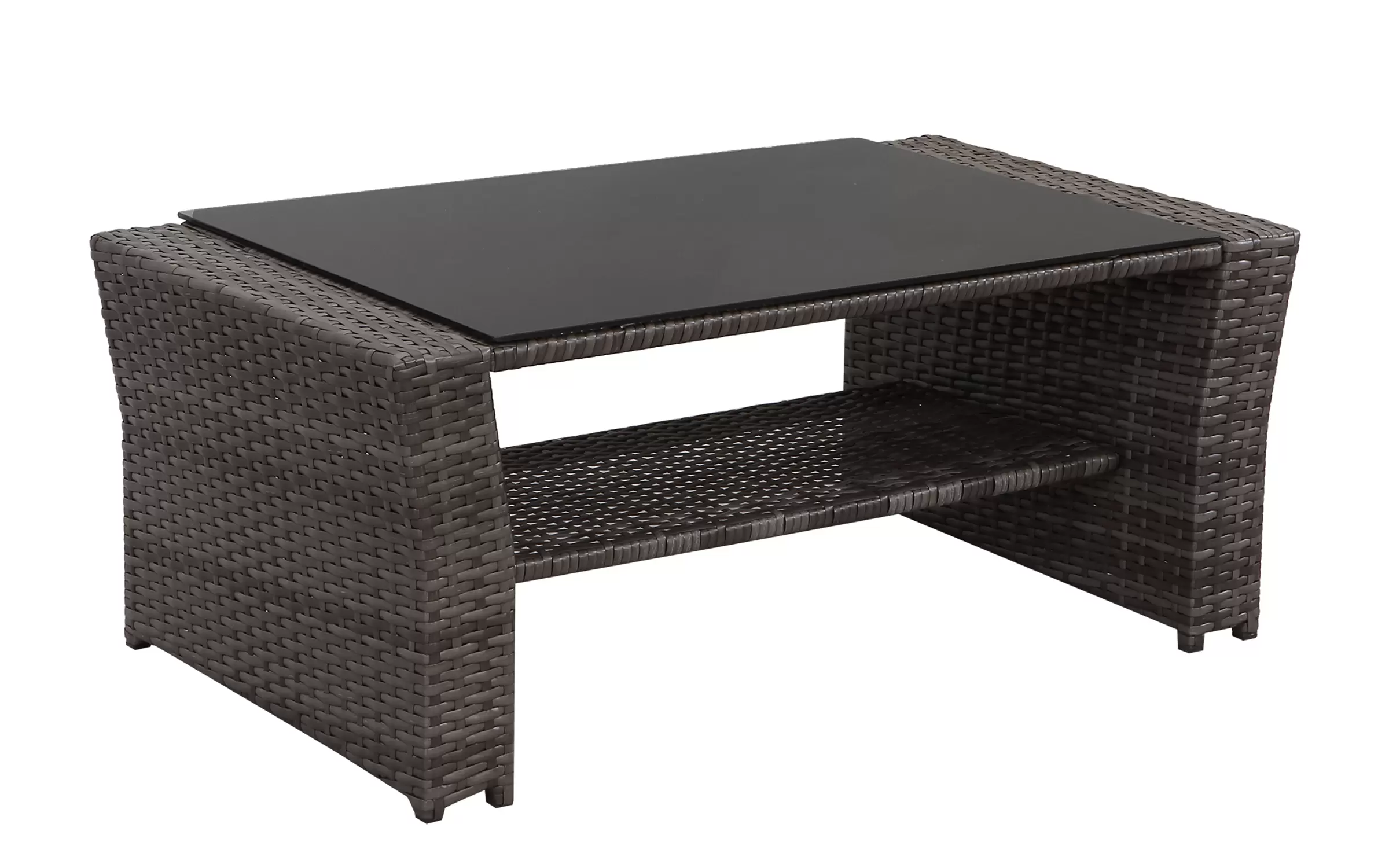 Ekonomiczne meble ogrodowe z technorattanu dla 4 osób. Stolik kawowy z blatem ze szkła hartowanego i pólka pod blatem.