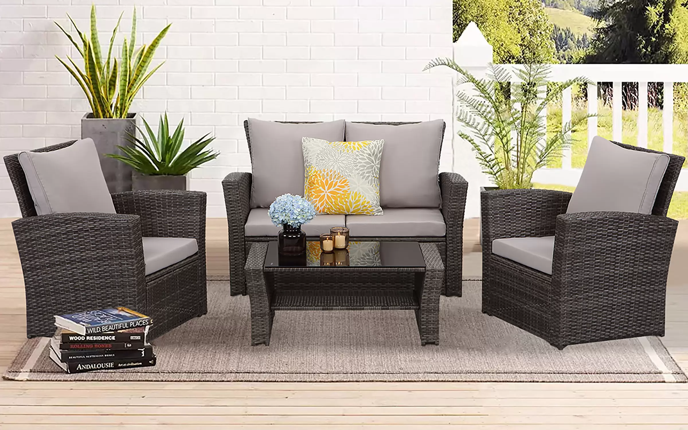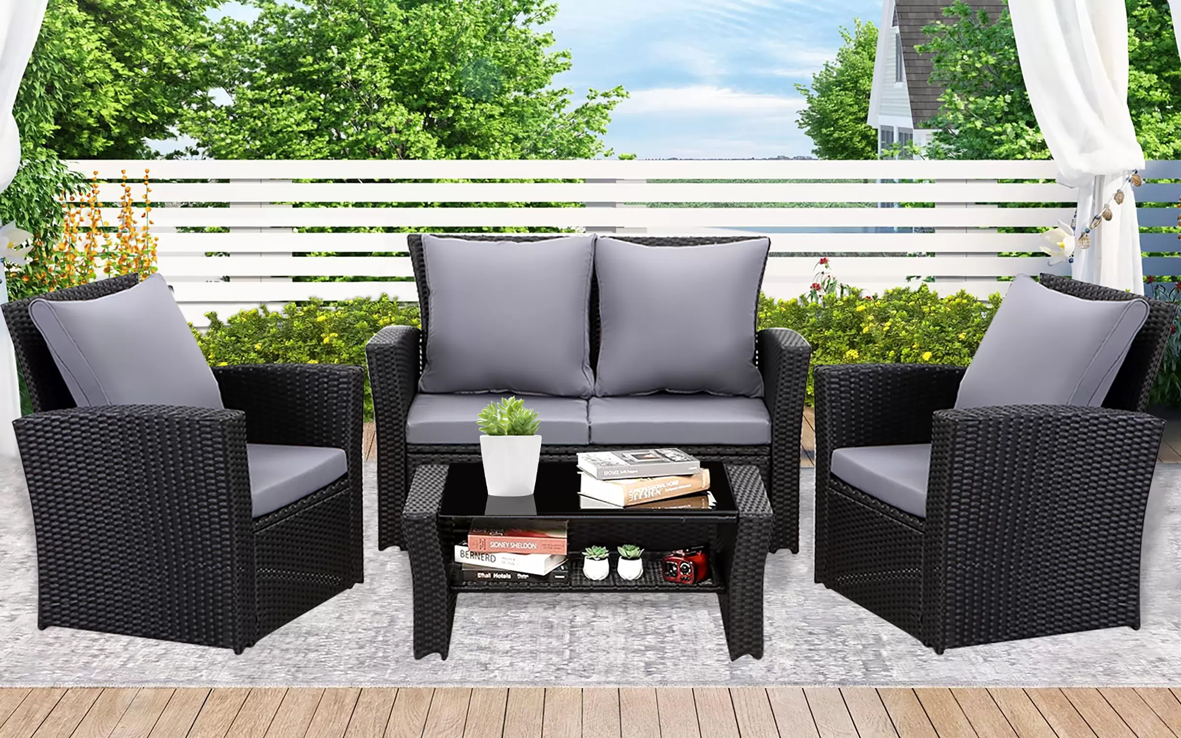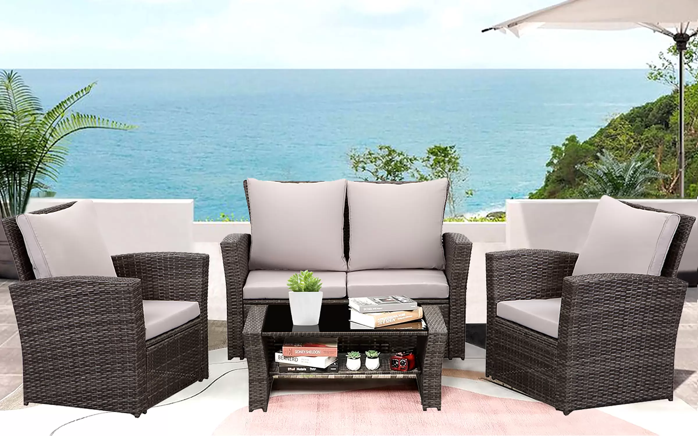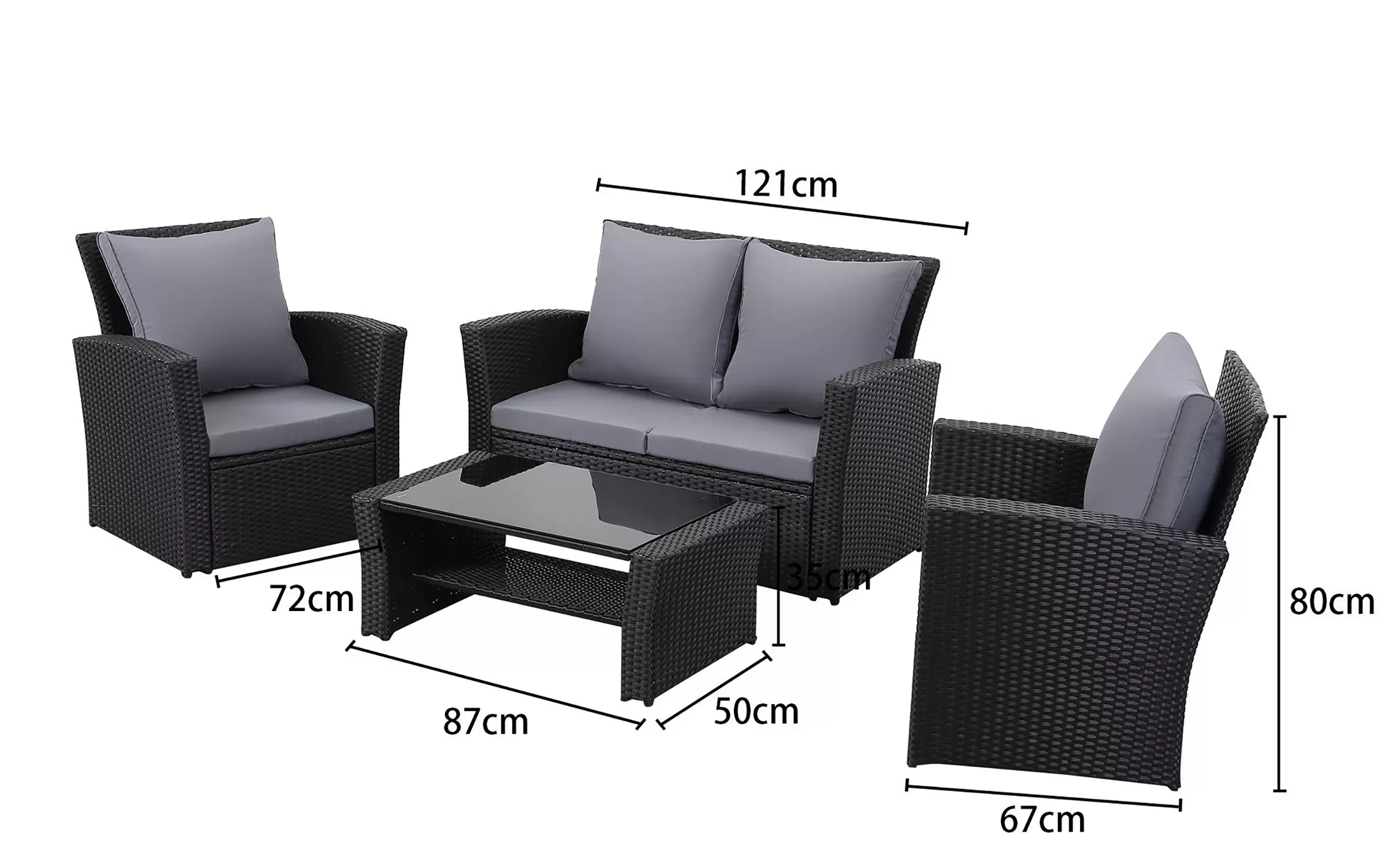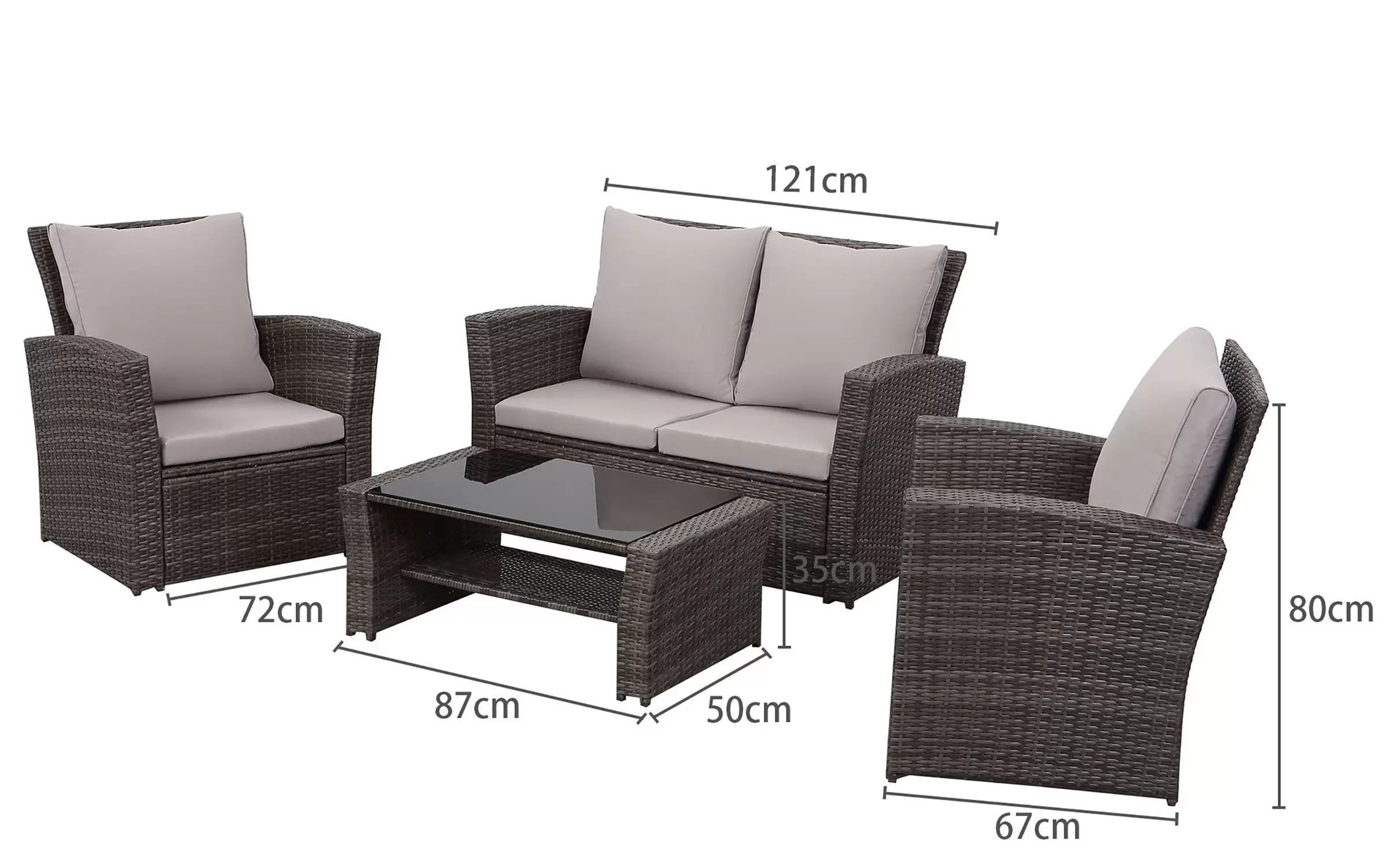 Ekonomiczne meble ogrodowe z technorattanu dla 4 osób. Stolik kawowy z blatem ze szkła hartowanego i pólka pod blatem.