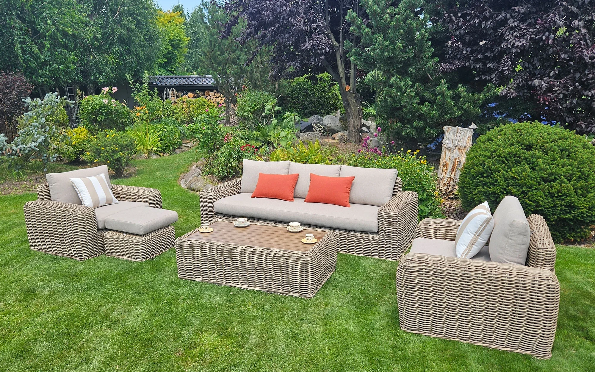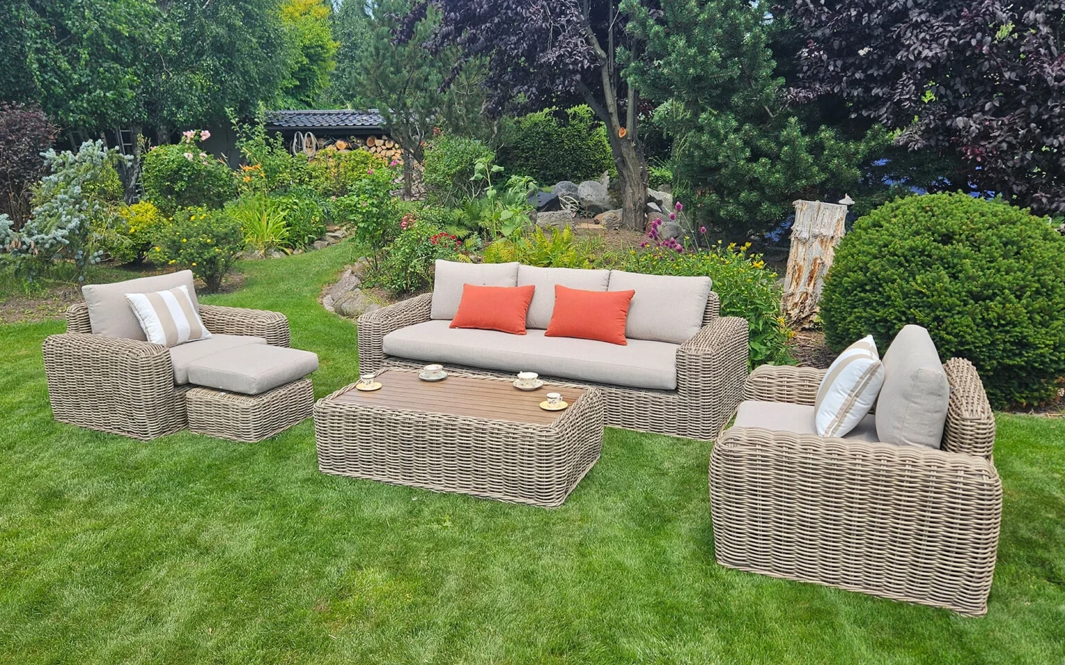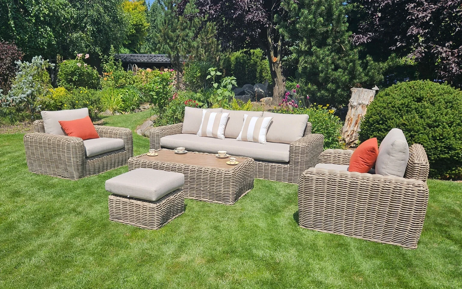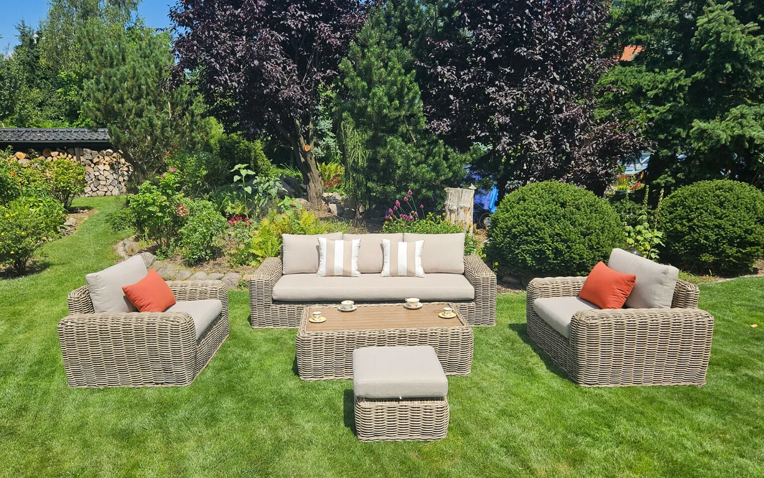 Zestaw wypoczynkowy ogrodowy TORRES to propozycja dla osób szukających solidności i klasycznej elegancji na tarasie, w ogrodzie lub na patio. W skład kompletu wchodzi trzyosobowa sofa, dwa fotele oraz stolik kawowy o wymiarach 122×70×37 cm, tworząc spójną i reprezentacyjną przestrzeń do odpoczynku. Całość opiera się na aluminiowej konstrukcji odpornej na rdzę, którą gęsto opleciono okrągłym technorattanem o średnicy 8 mm, co nadaje meblom wyjątkową masę i naturalny wygląd. Wybierając te profesjonalne meble wypoczynkowe na taras, zyskujesz gwarancję trwałości i wysokiego komfortu, który zapewniają grube poduszki siedziskowe i oparciowe, przystosowane do intensywnego użytkowania zewnętrznego.
