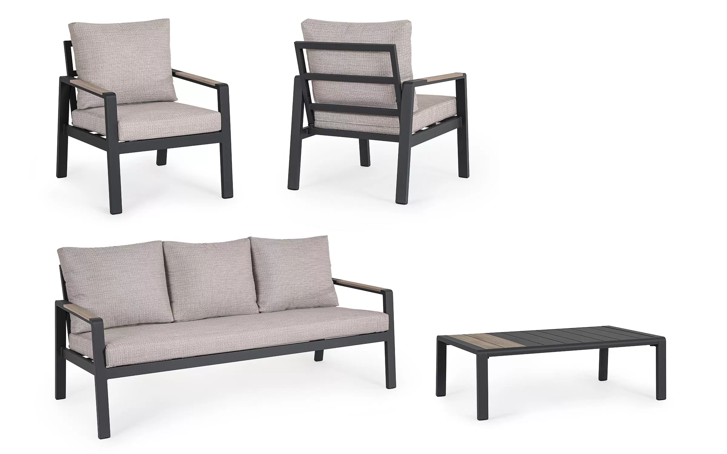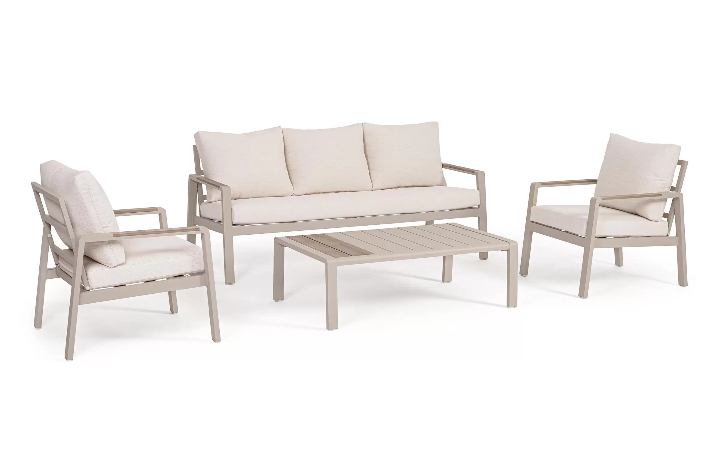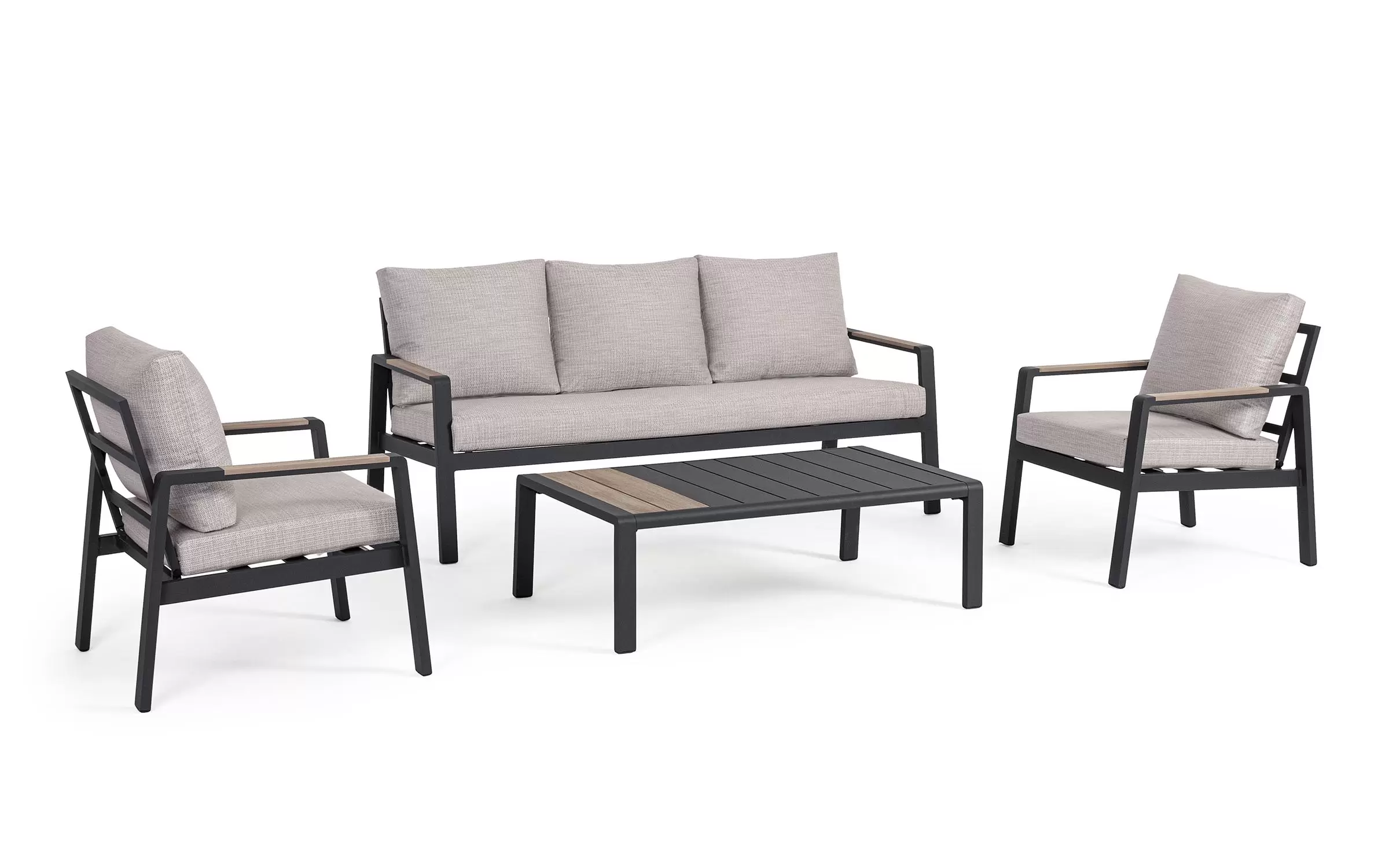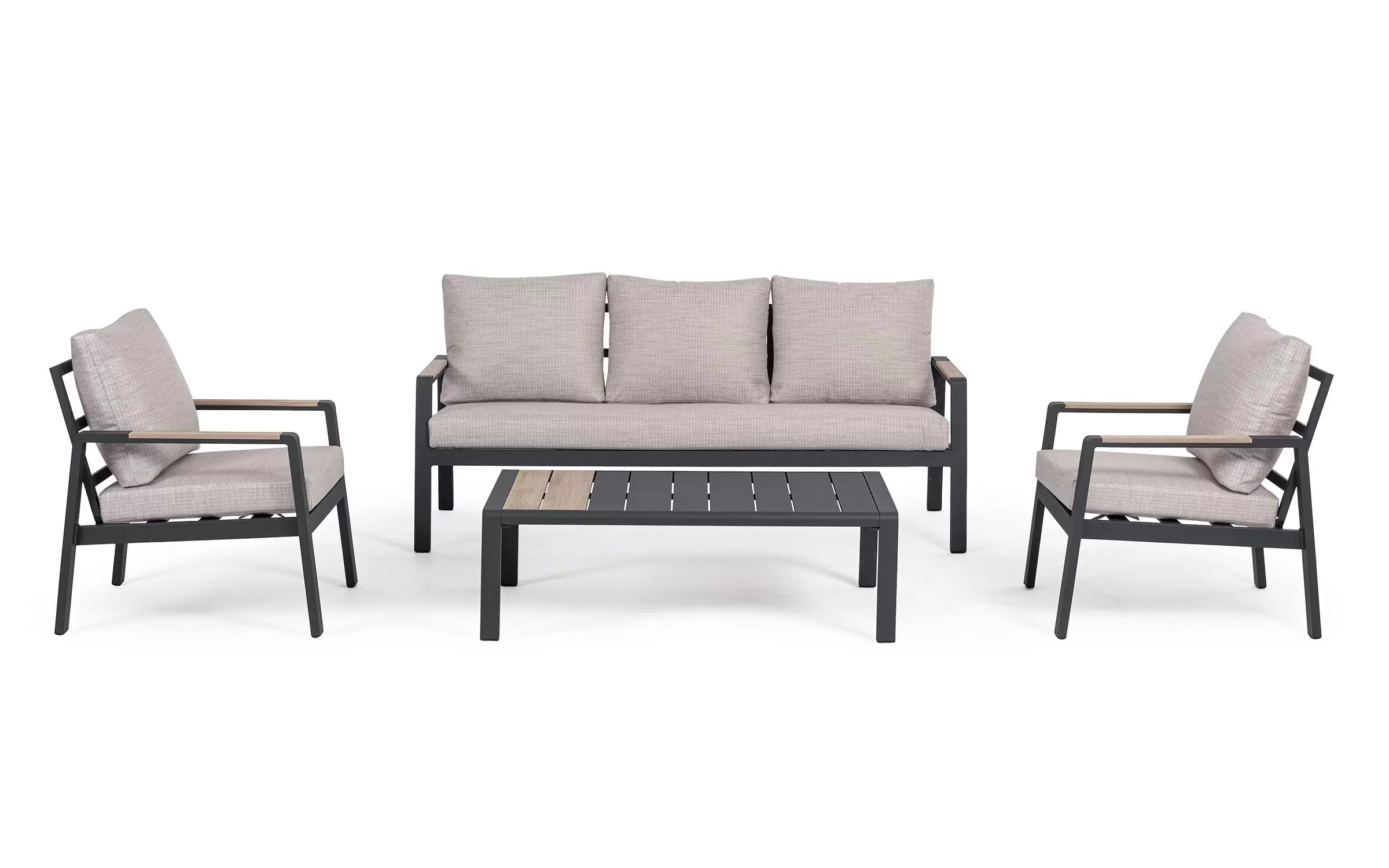 Meble ogrodowe wypoczynkowe dla pięciu osób do użytku na zewnątrz. Sofa, dwa fotele i stolik wykonane w lekkiej wizualnie formie.